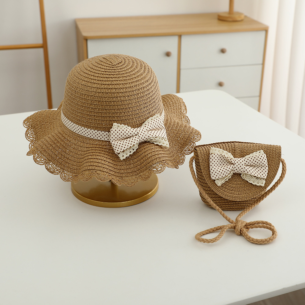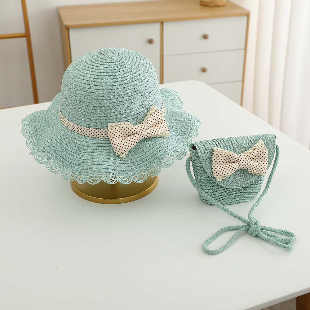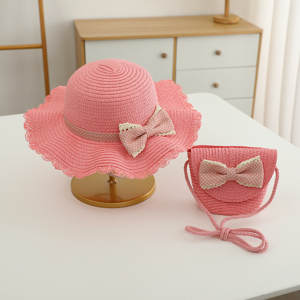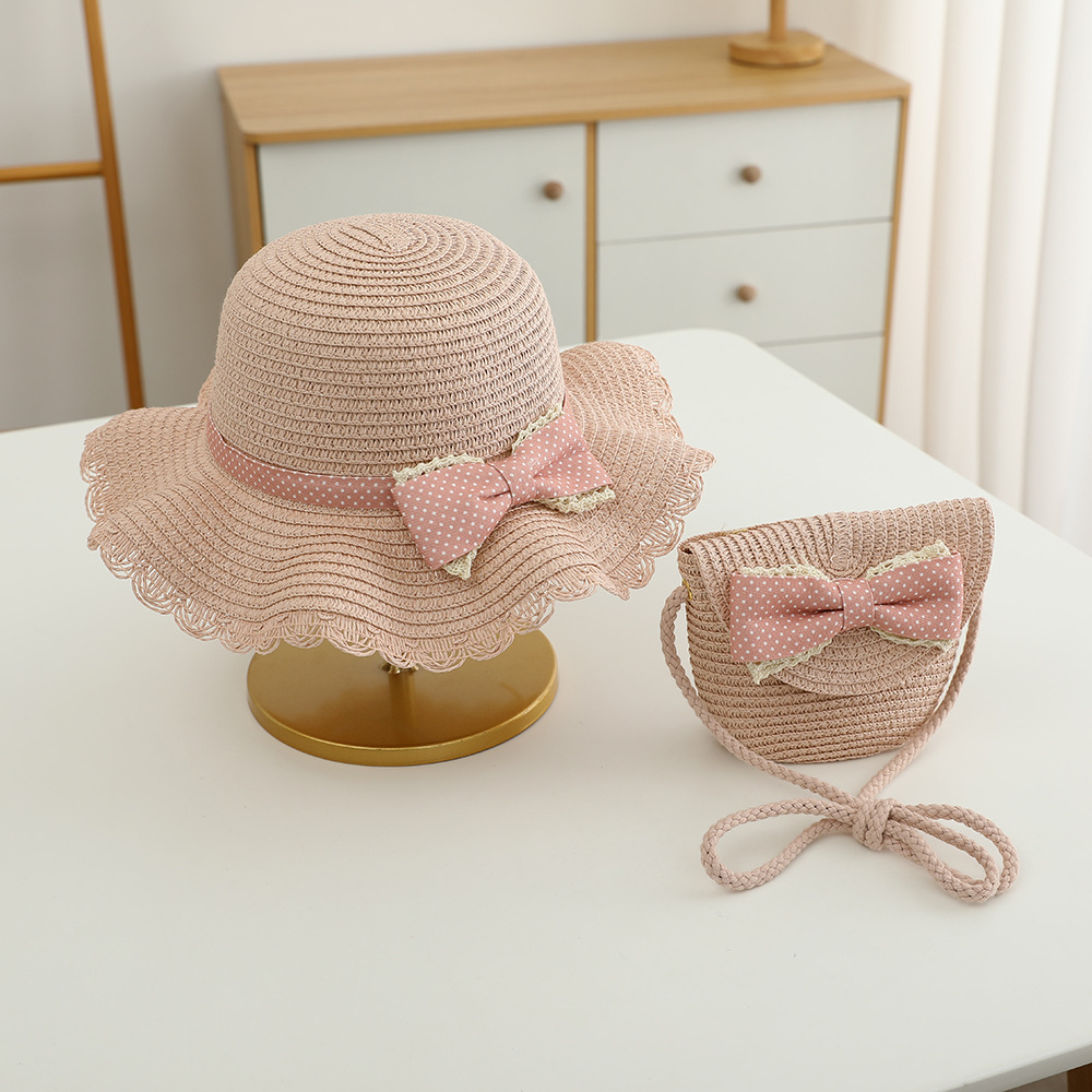 儿童草帽批发甜美可爱波点蝴蝶结帽子包包夏季女童防晒帽遮阳帽
