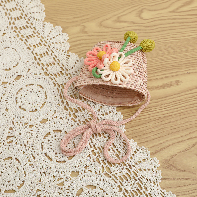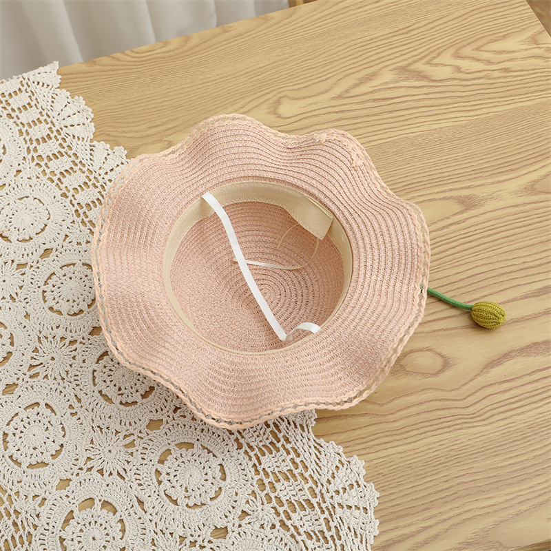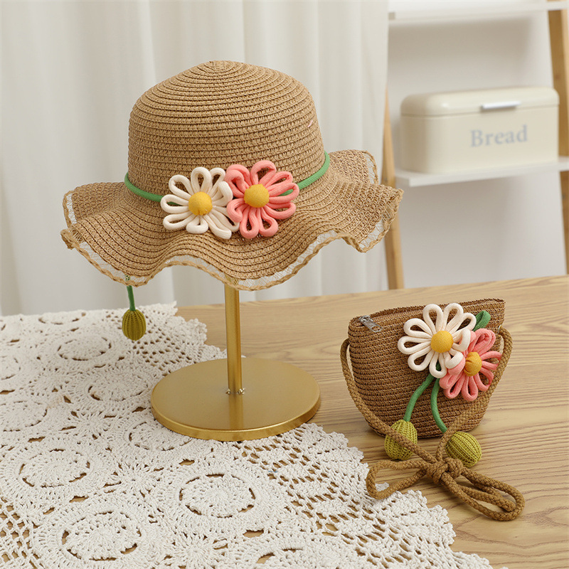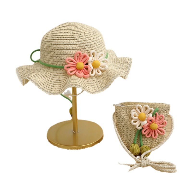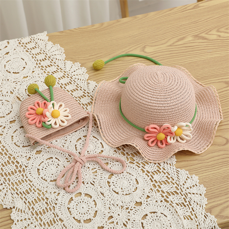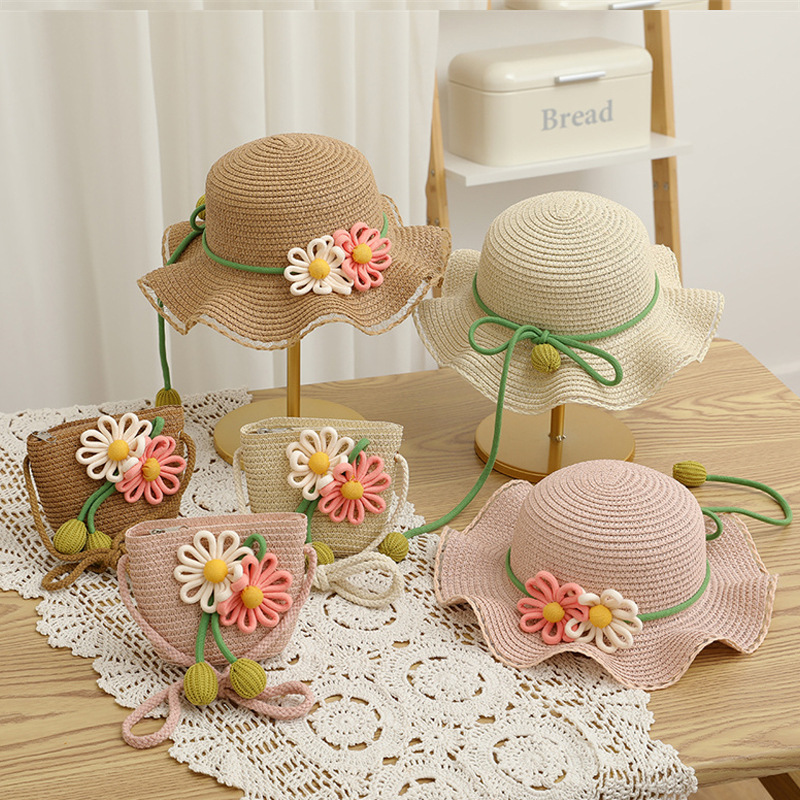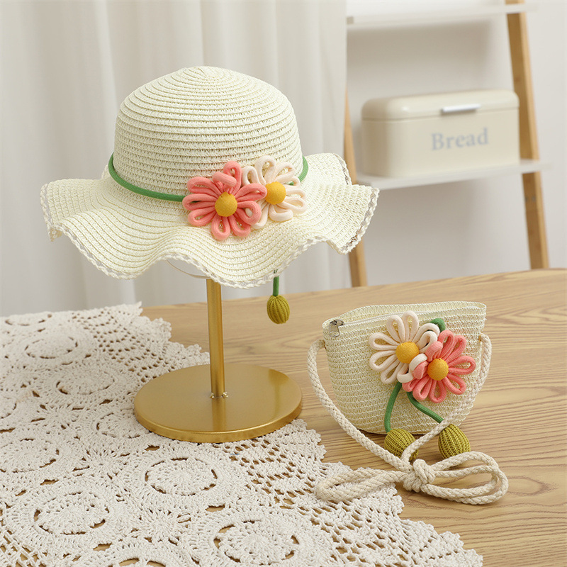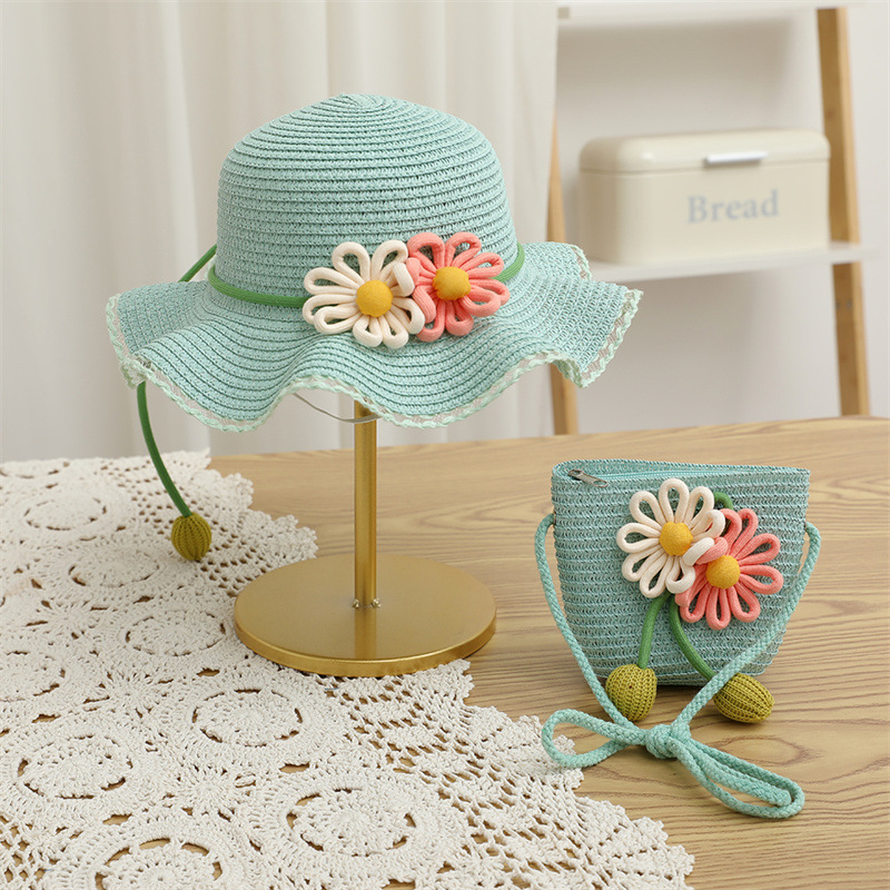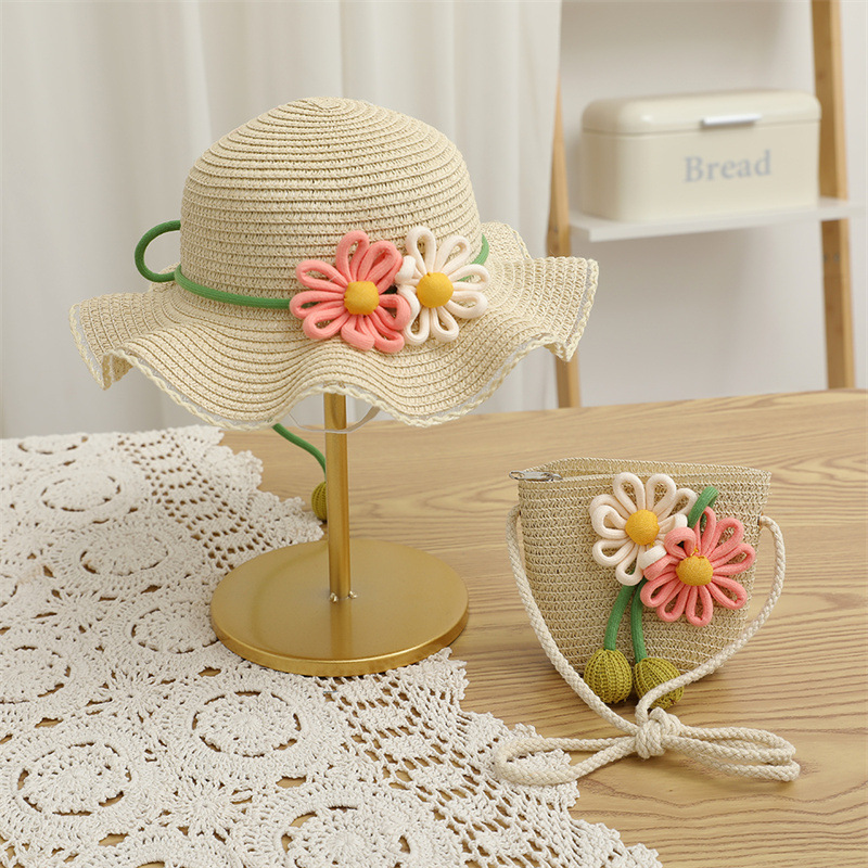 夏季儿童帽子波浪花边草帽包包两件套洋气可爱亲子防晒遮阳太阳帽