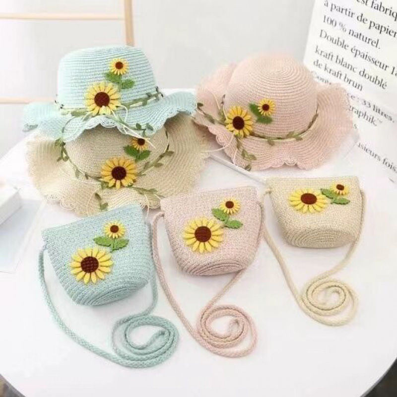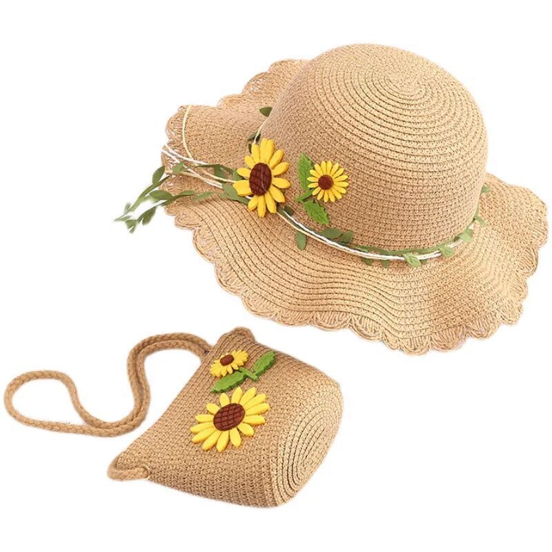 夏季儿童防晒帽子女宝沙滩度假款草帽包包套装户外出游可爱太阳帽