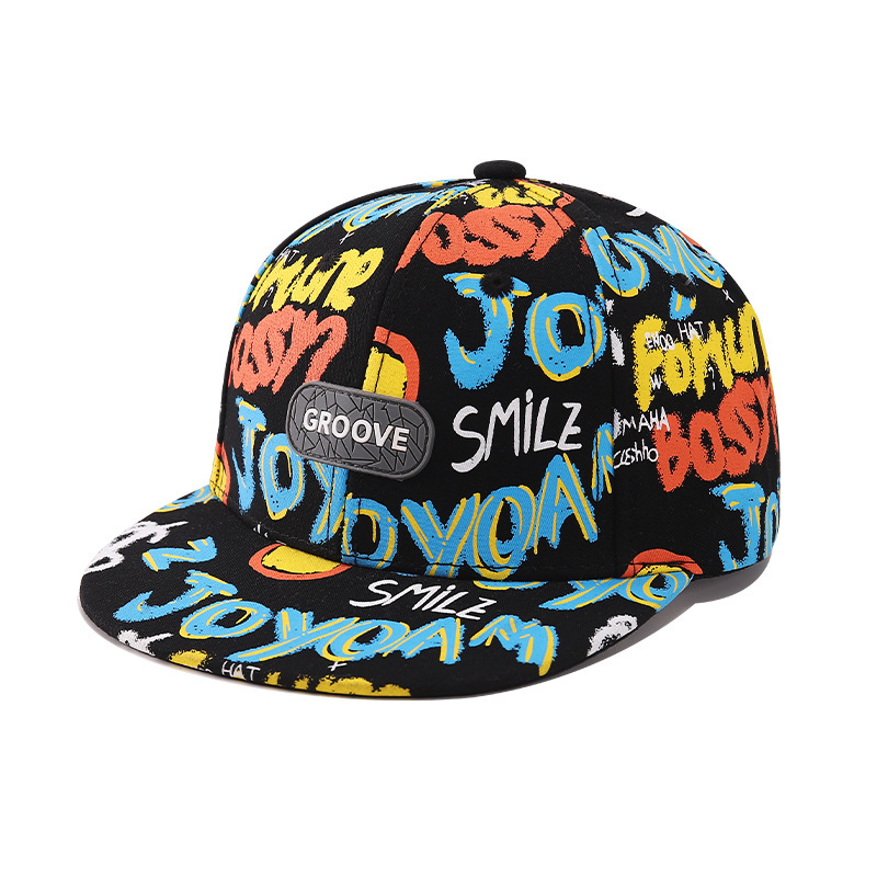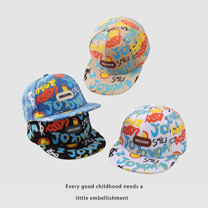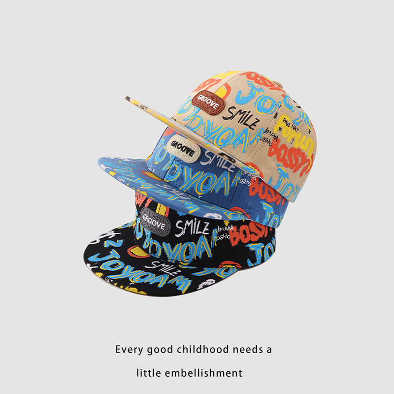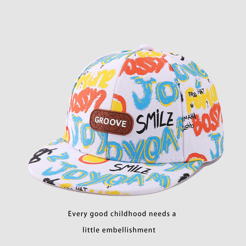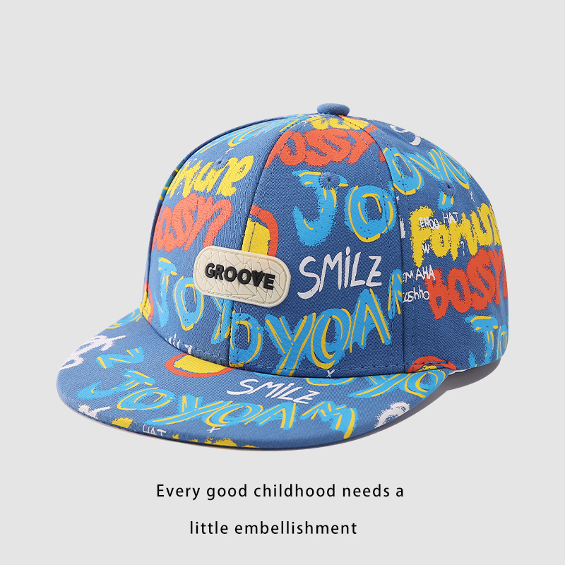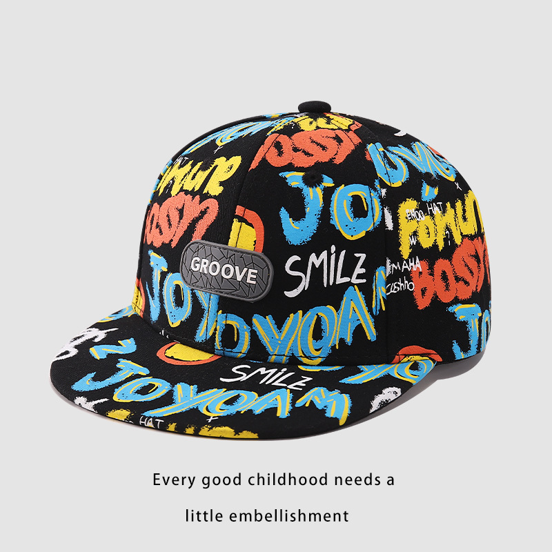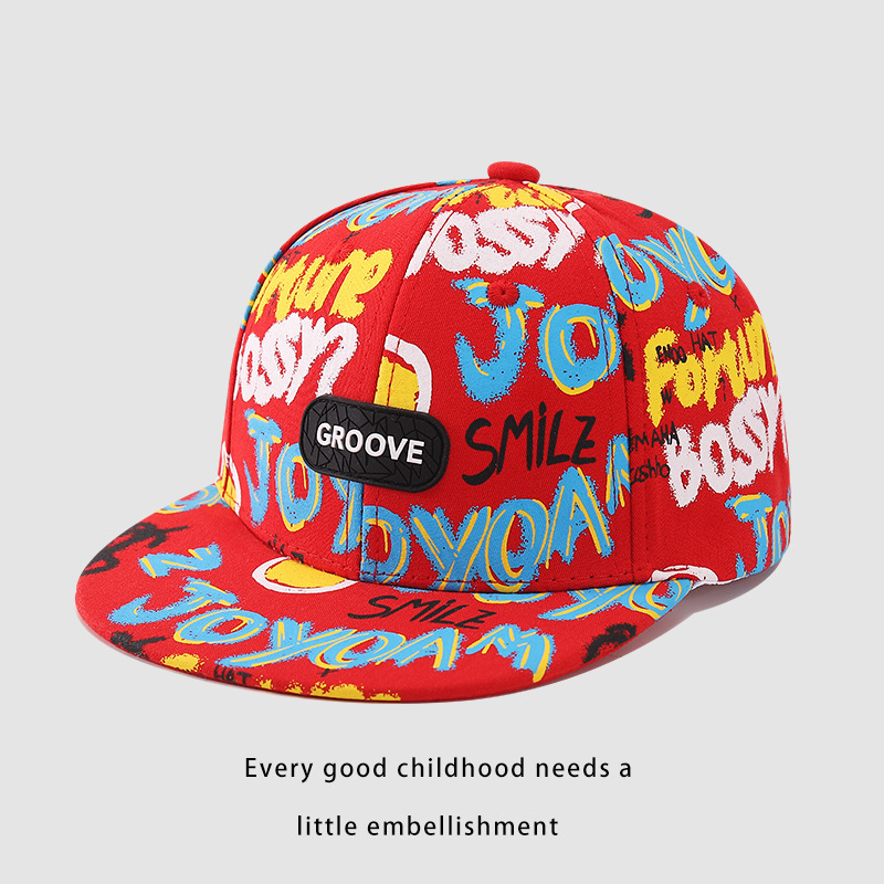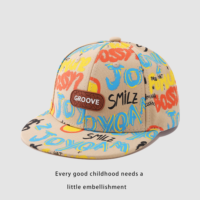 英文涂鸦平沿帽韩版男女童皮标字母棒球帽春秋新款嘻哈帽儿童帽子