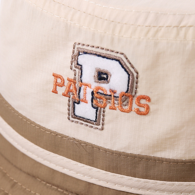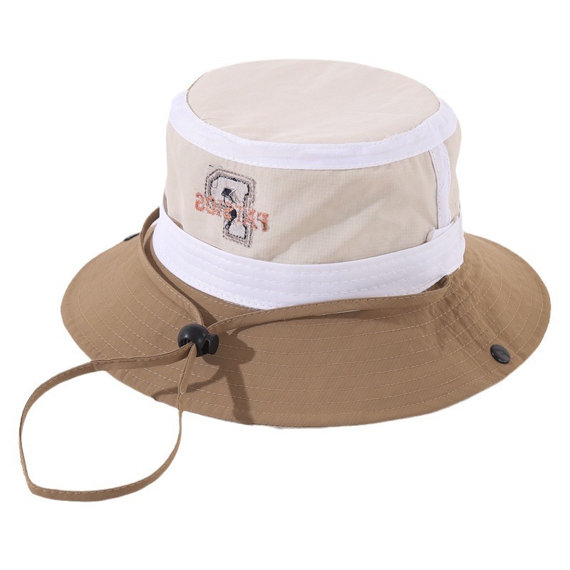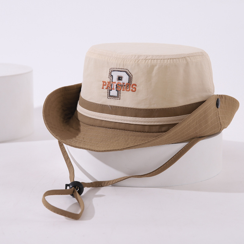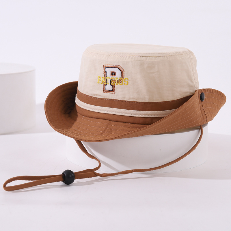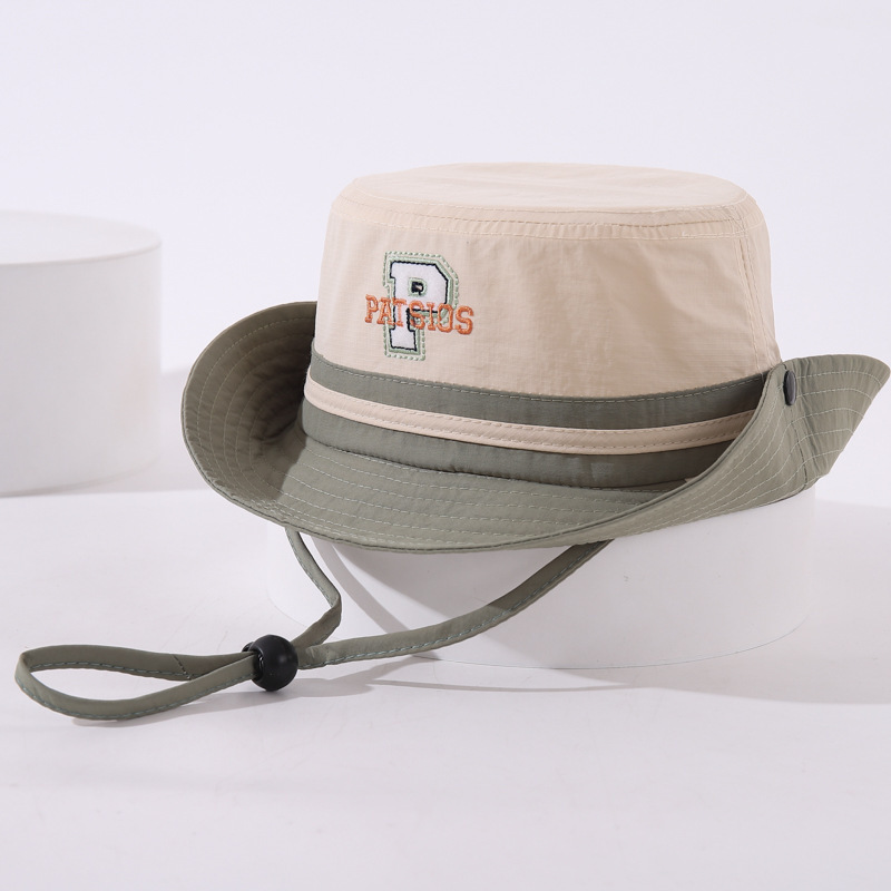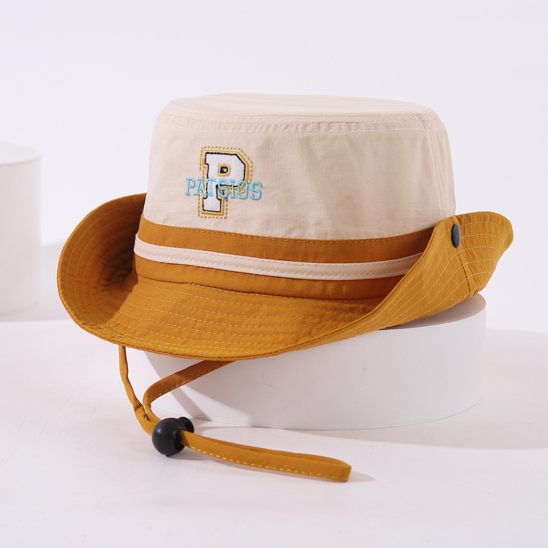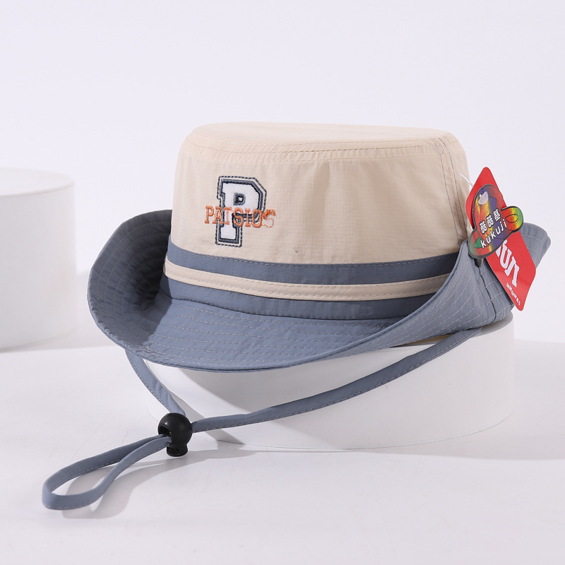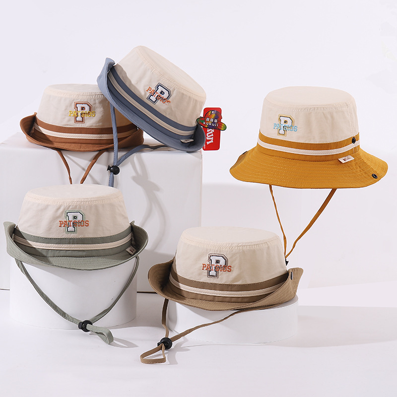 儿童速干渔夫帽刺绣字母P拼色边翻檐纽扣盆帽户外露营男童遮阳帽