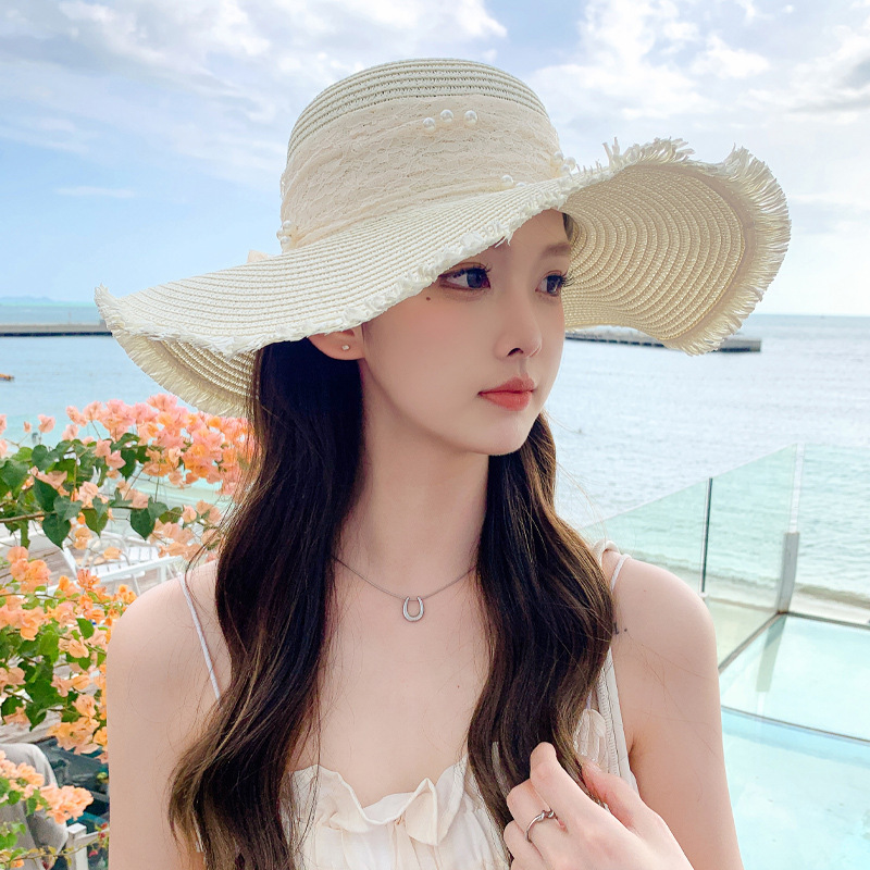 夏季新款帽子女蕾丝带珍珠草帽沙滩防晒遮阳帽透气大沿太阳帽批发