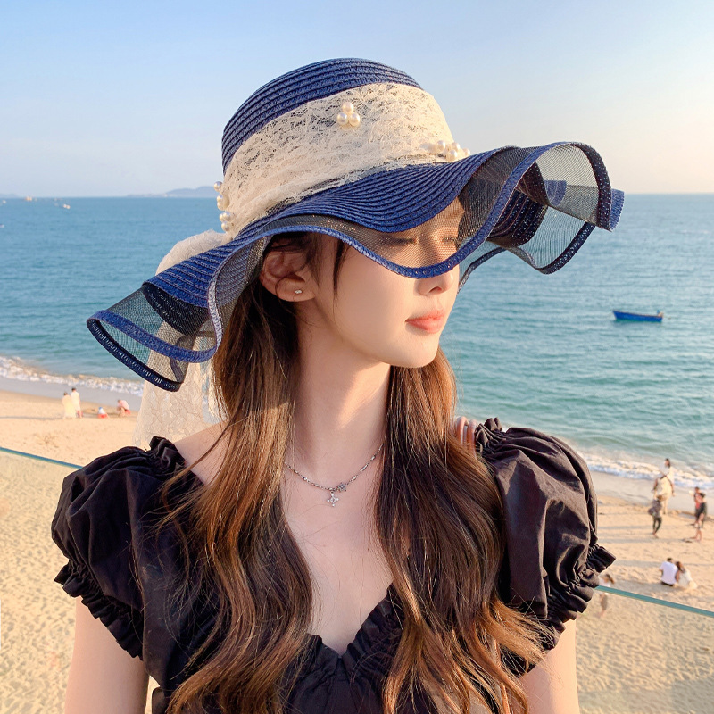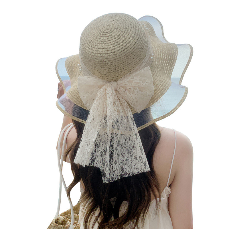 韩版夏季新款帽子女时尚珍珠蕾丝蝴蝶结草帽防晒遮阳帽沙滩太阳帽
