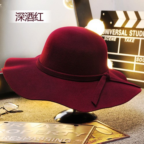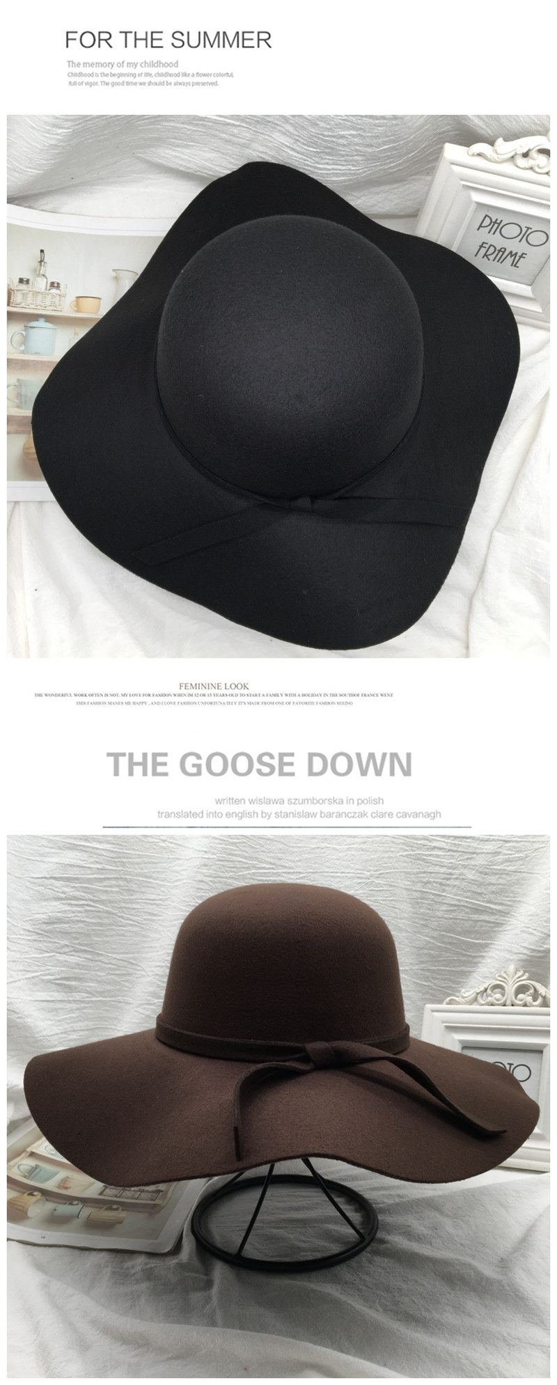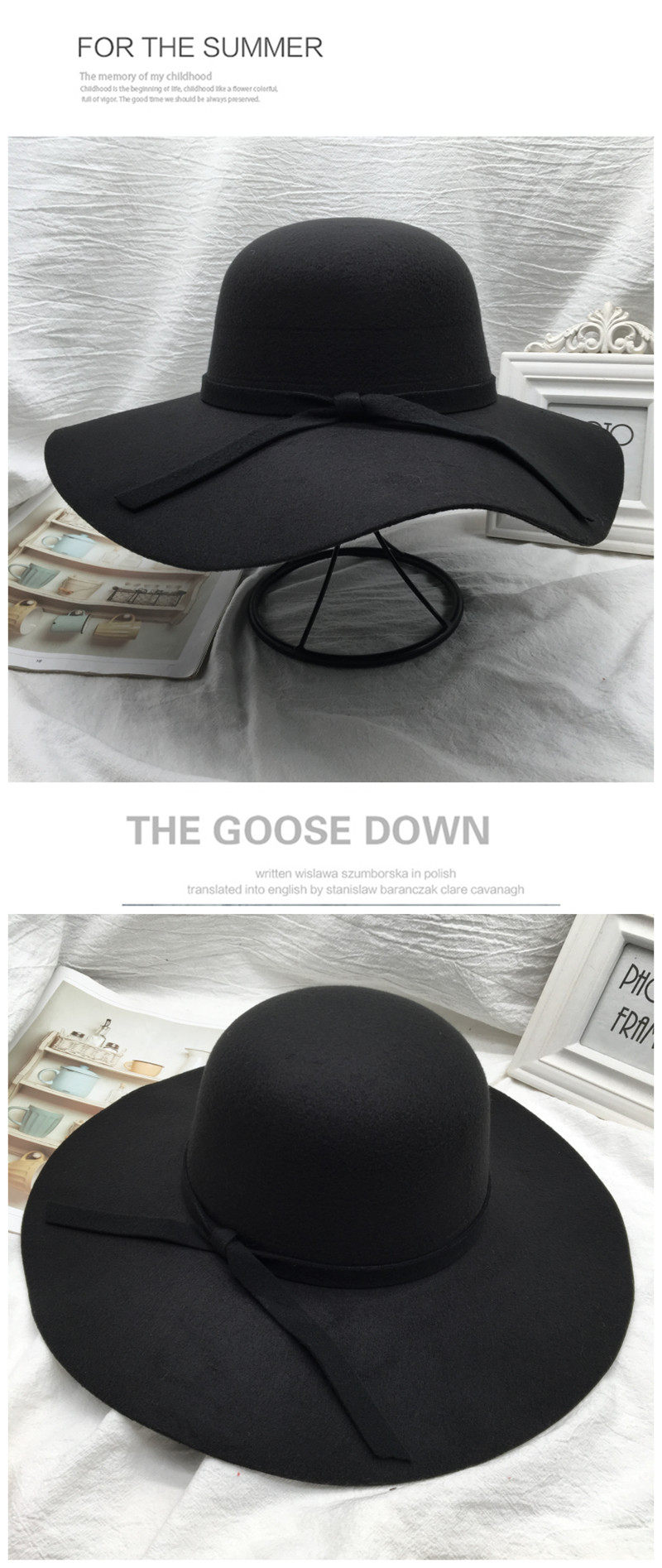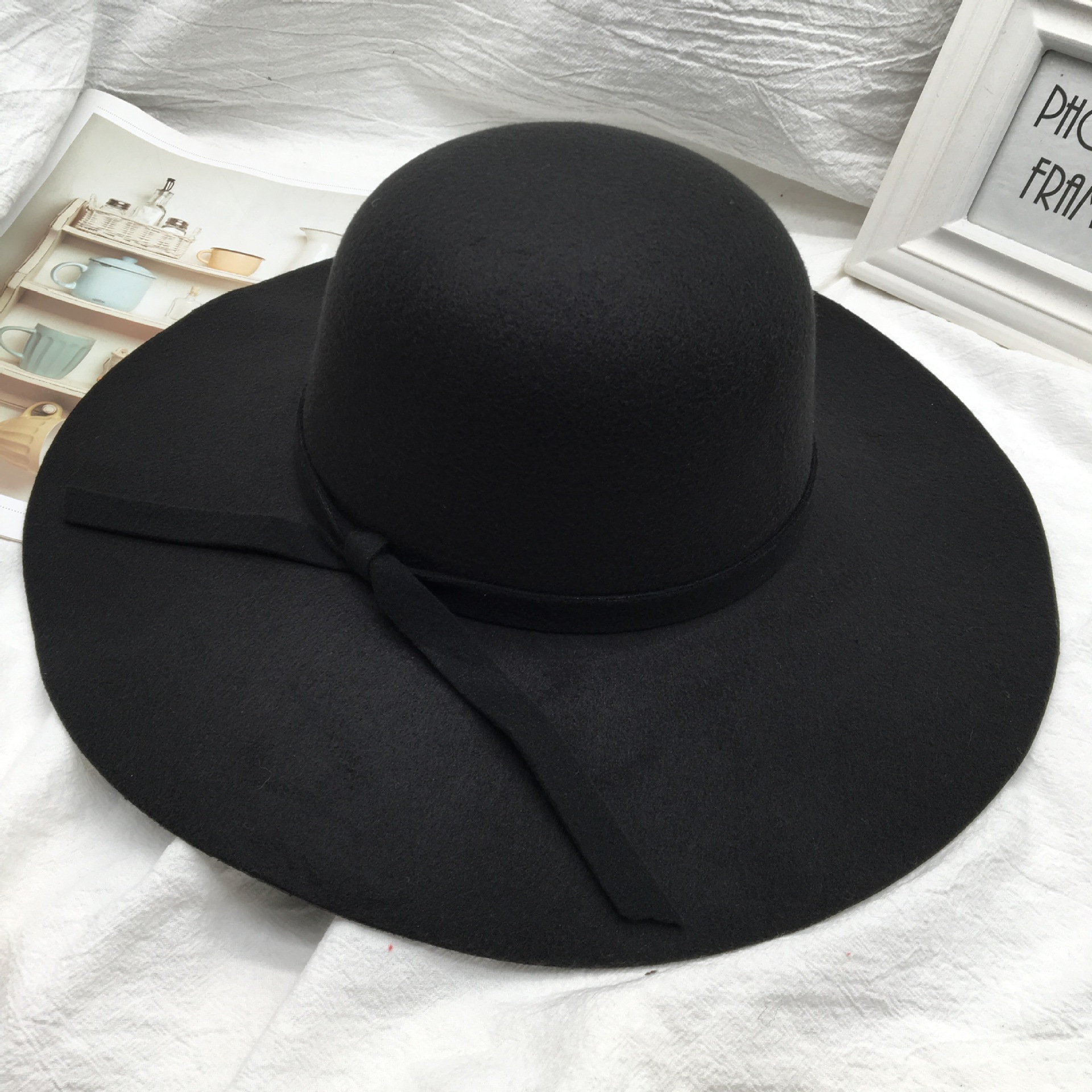 黑色渔夫帽子女秋冬韩国百搭蝴蝶结礼帽女圆顶羊毛呢大檐盆帽复古