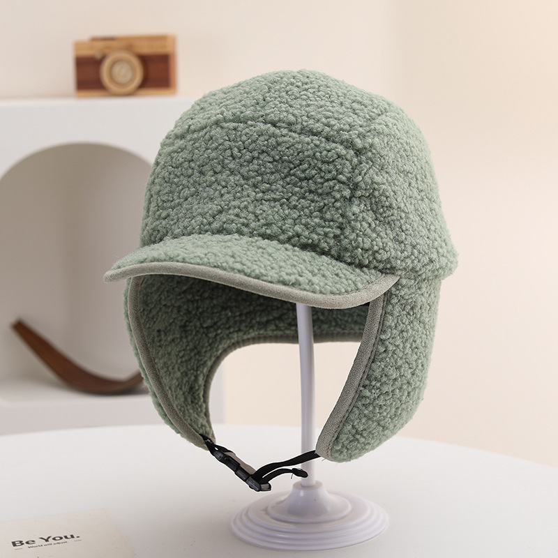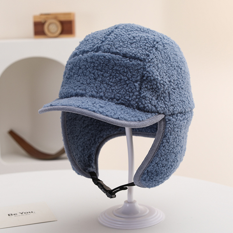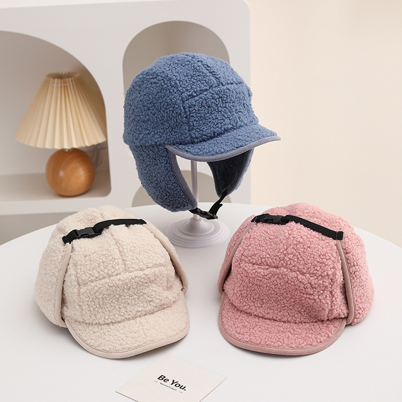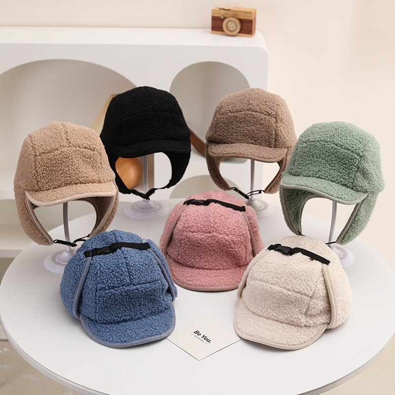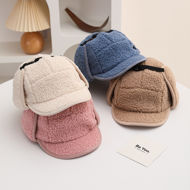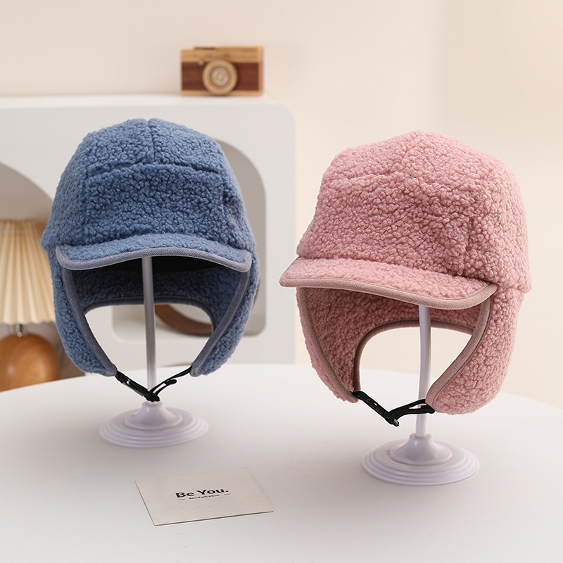 纯色光板摇粒绒保暖儿童时尚护耳渔夫帽仿羊羔绒休闲风潮流设计感