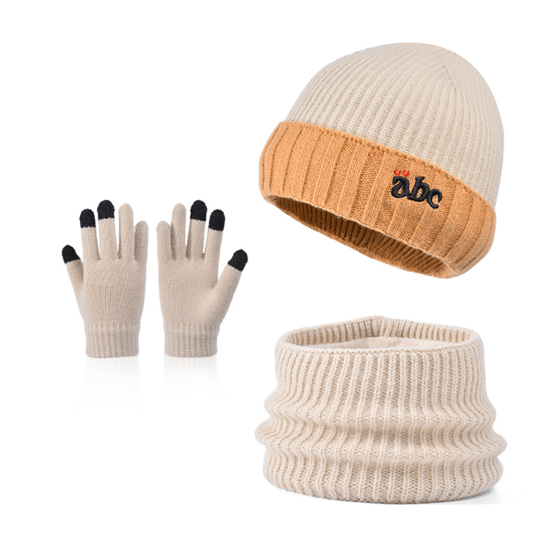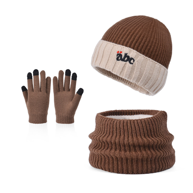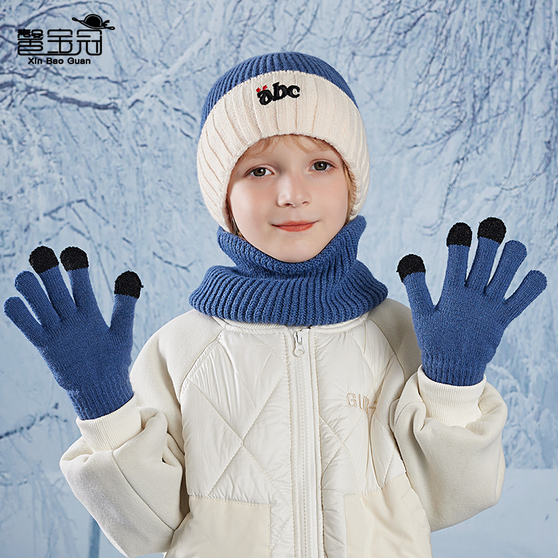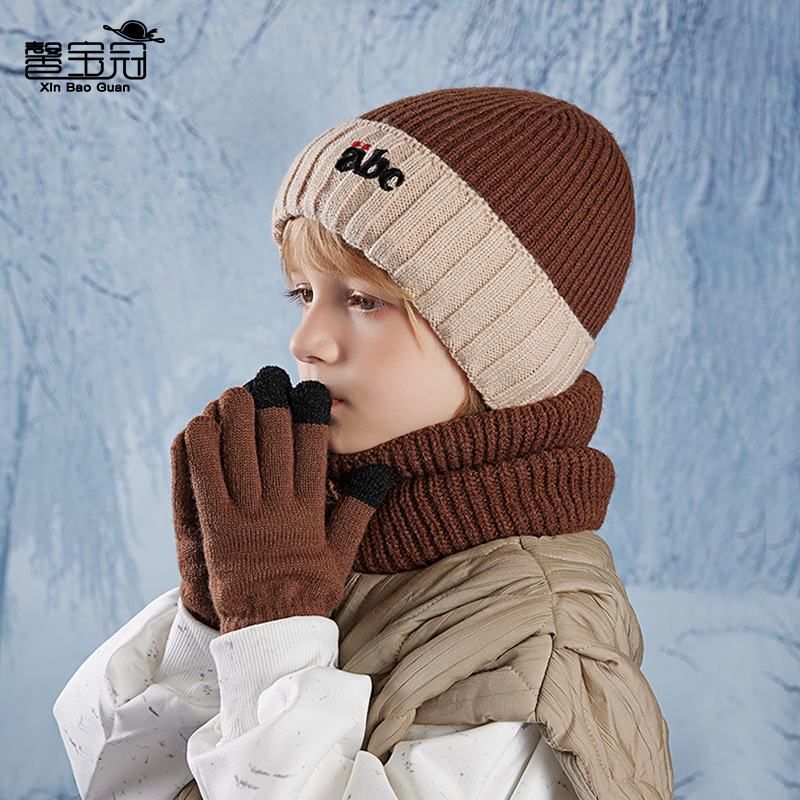 冬季儿童帽子字母刺绣针织围脖手套毛线帽男孩户外保暖护耳套头帽