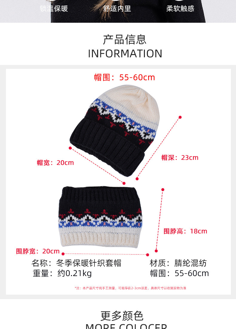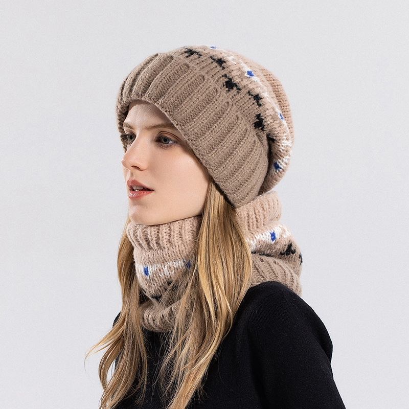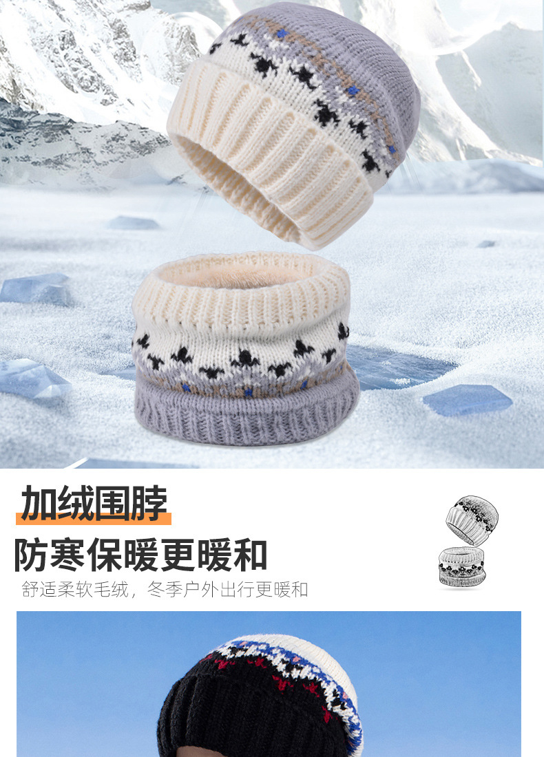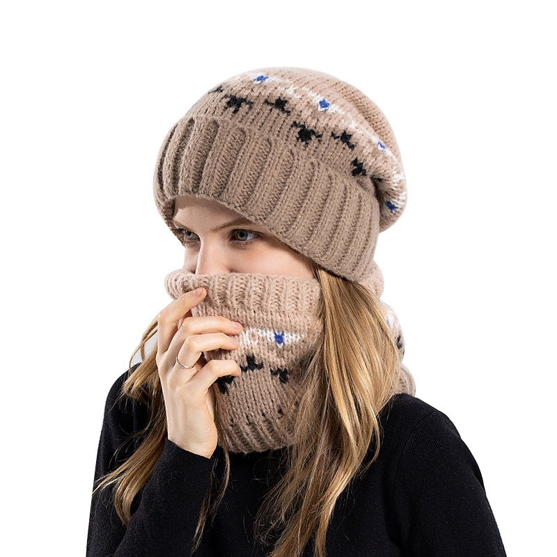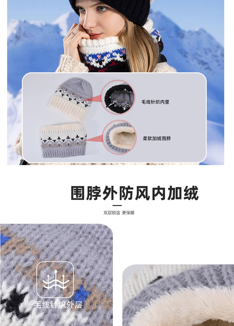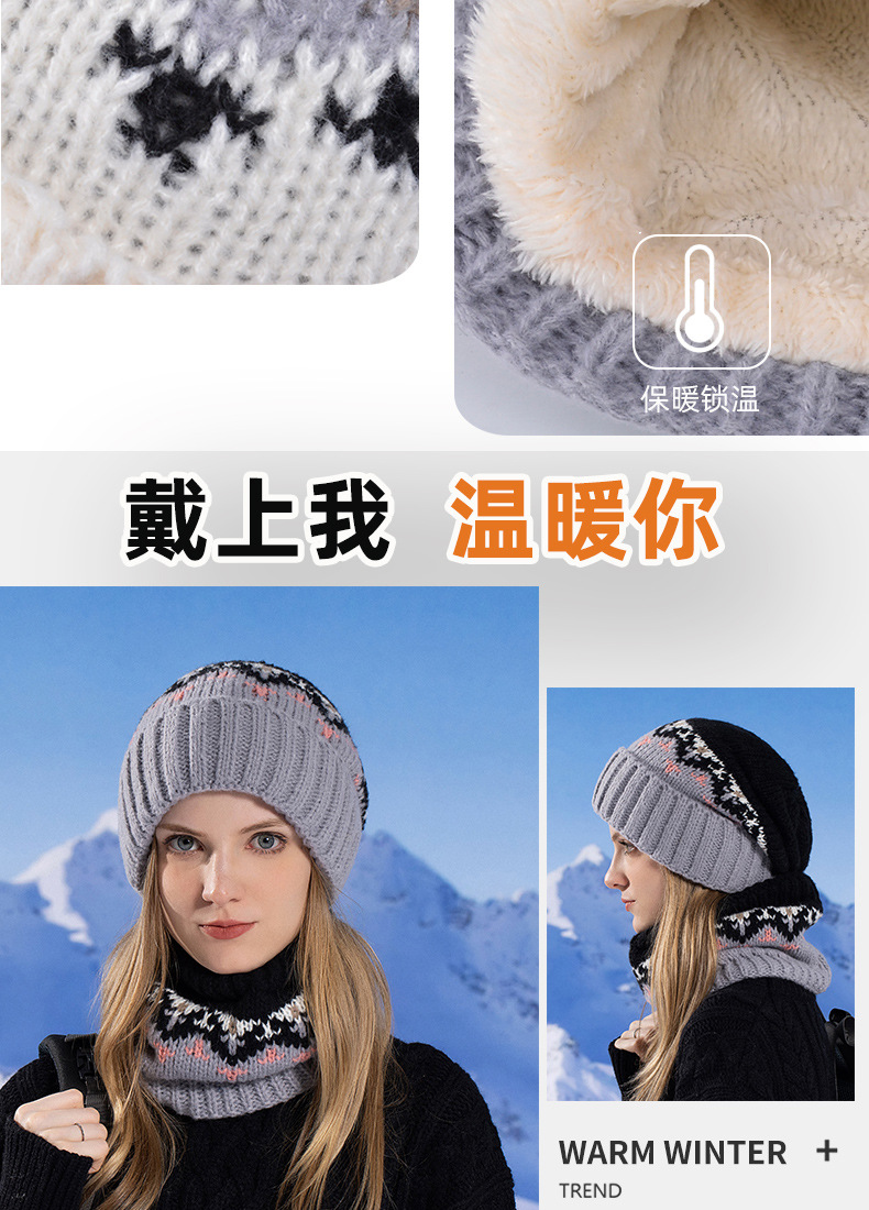 8399跨境帽子围脖两件套冬季防寒保暖粗线提花针织套头帽女毛线帽
