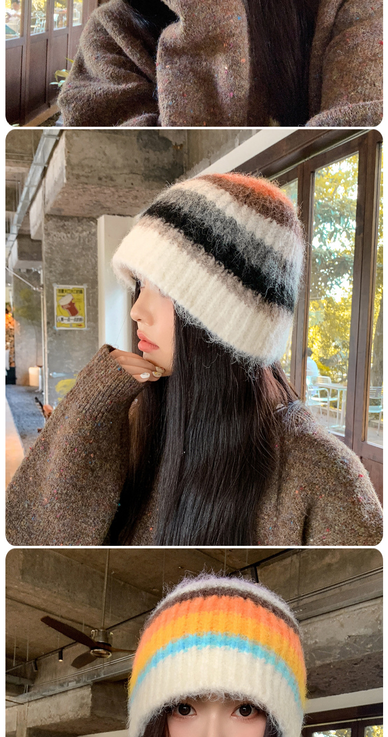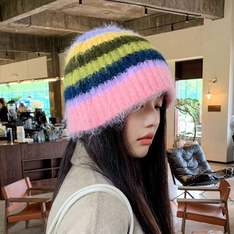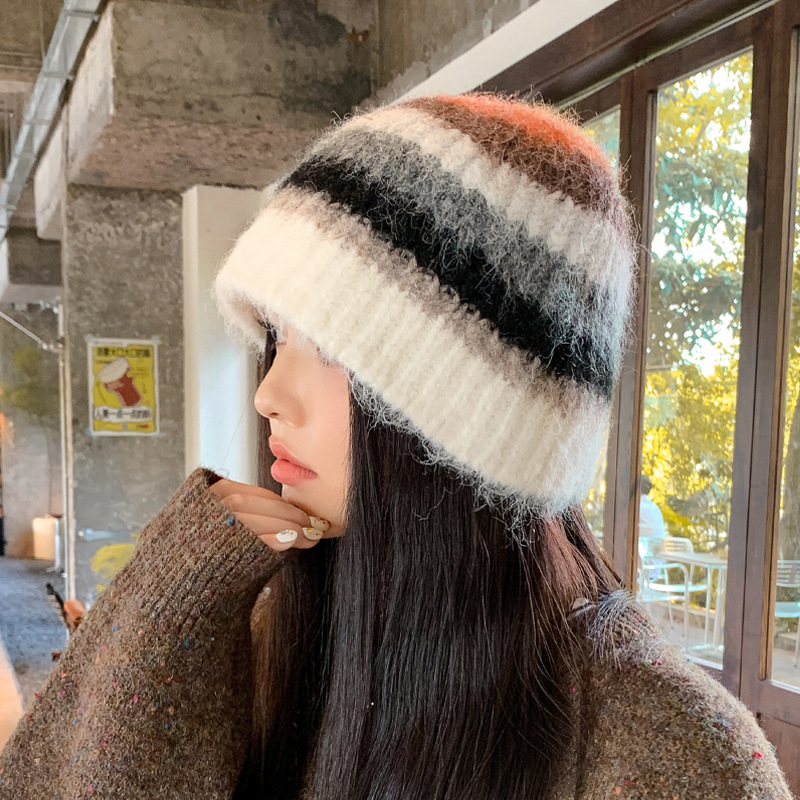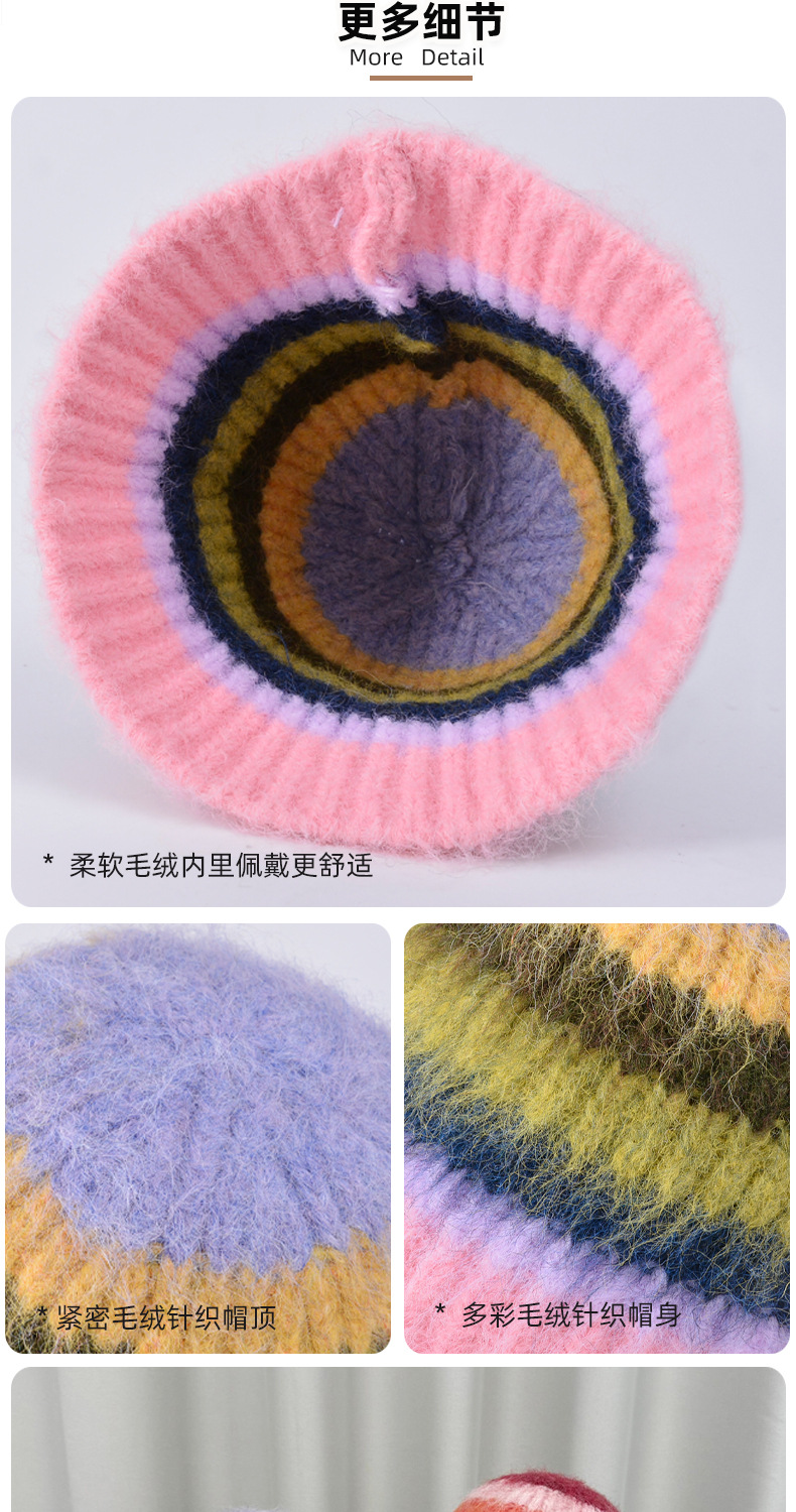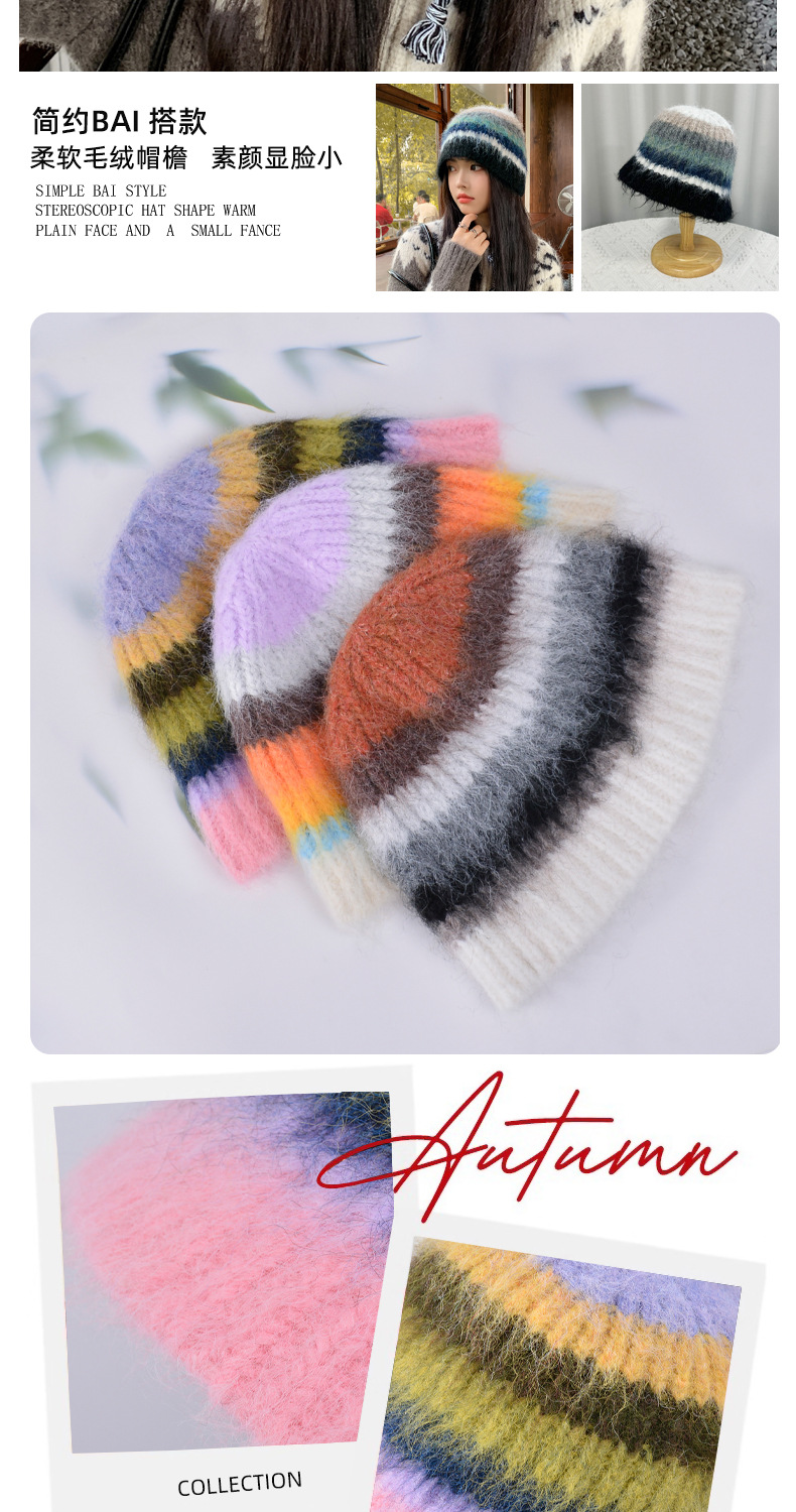 多巴胺彩色条纹水桶帽子女秋冬毛绒护耳针织毛线渔夫帽显脸小盆帽