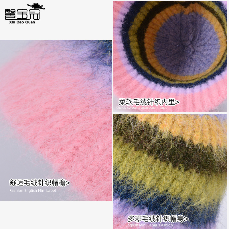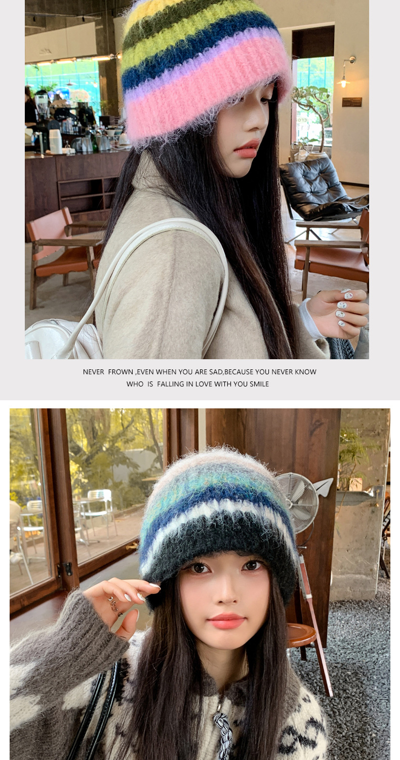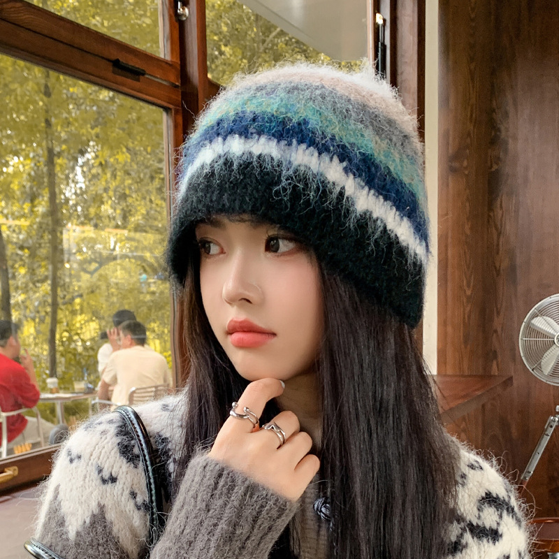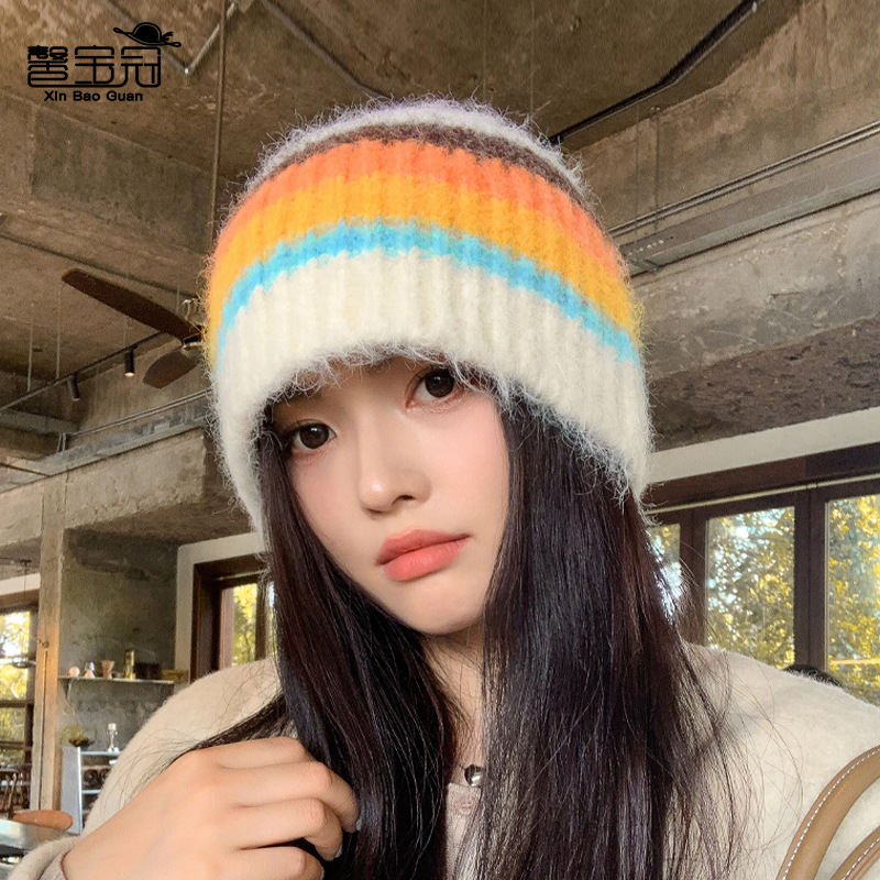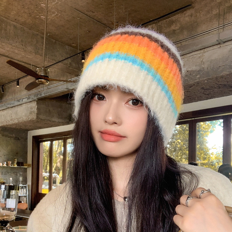 多巴胺彩色条纹水桶帽子女秋冬毛绒护耳针织毛线渔夫帽显脸小盆帽