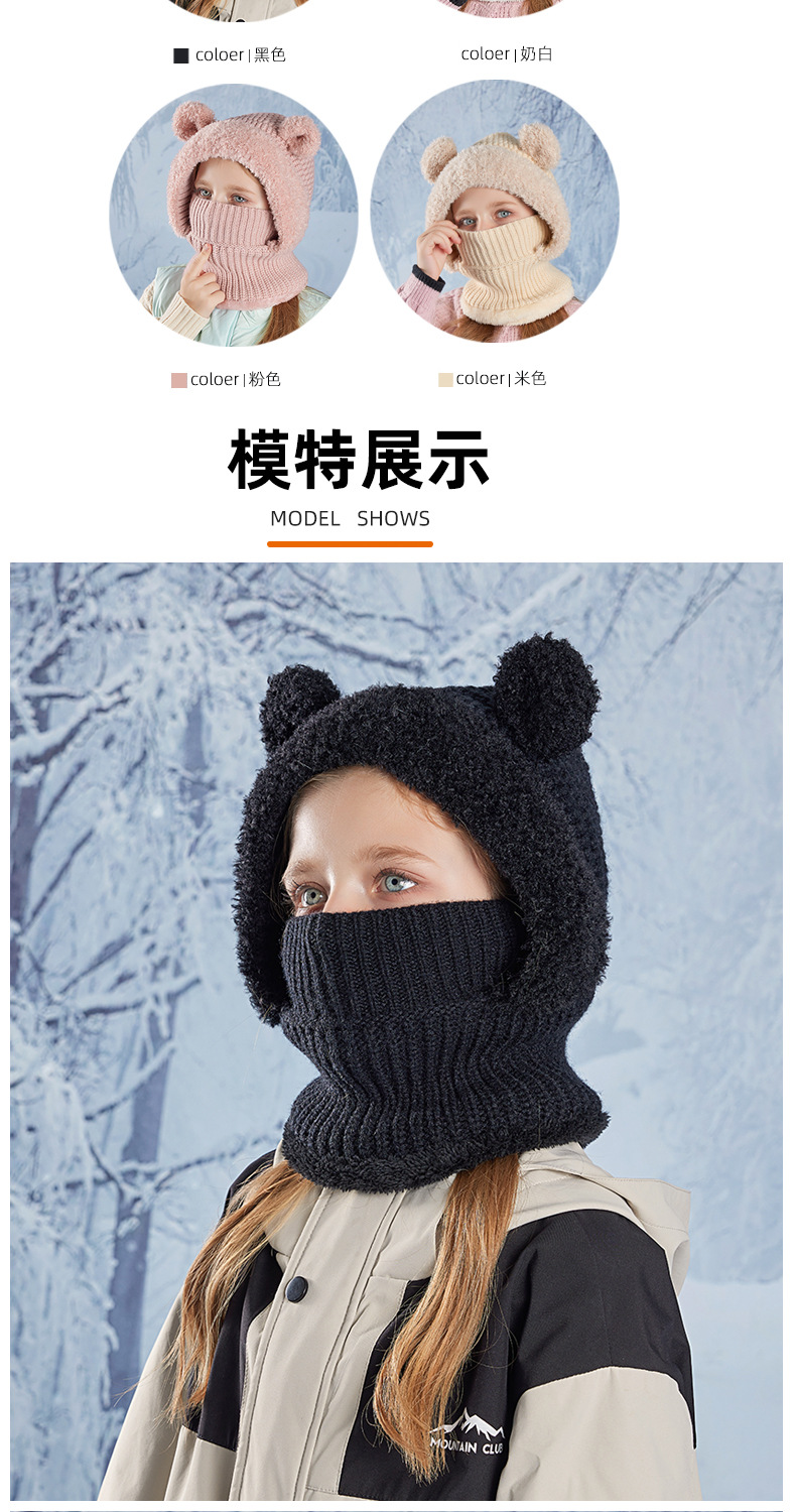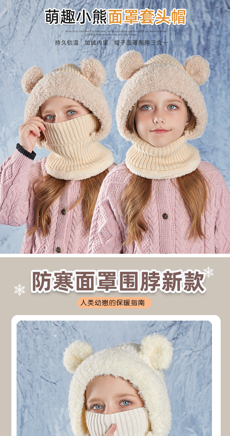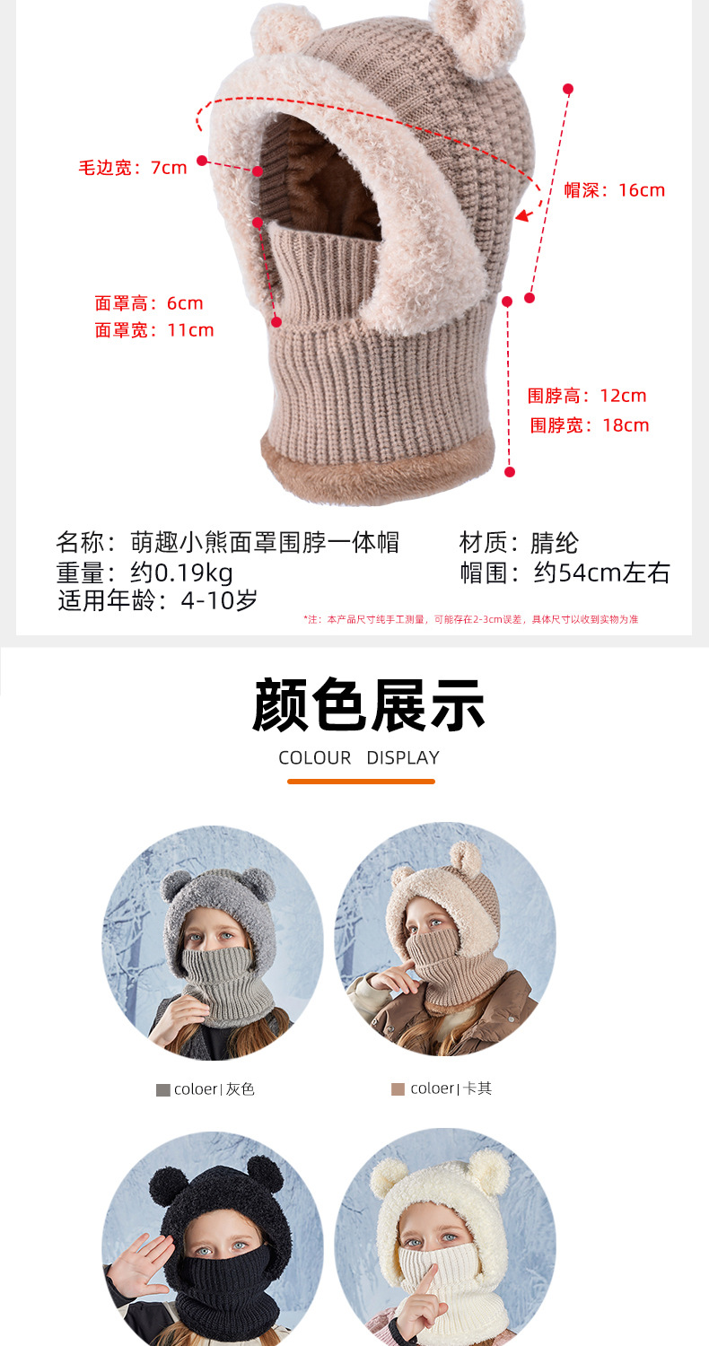 儿童帽子卡通可爱小熊面罩围脖一体帽冬季户外加绒保暖针织毛线帽