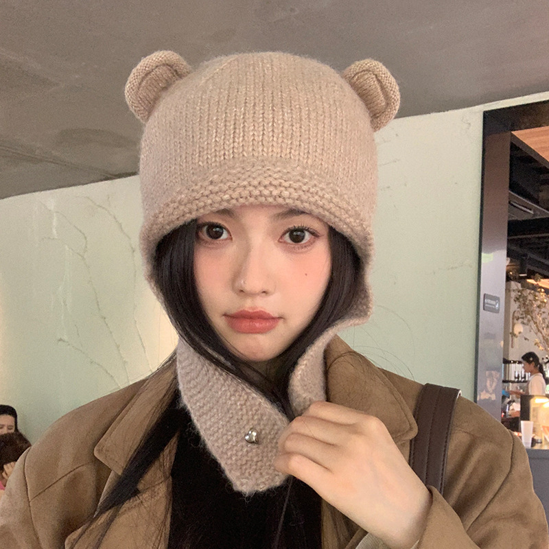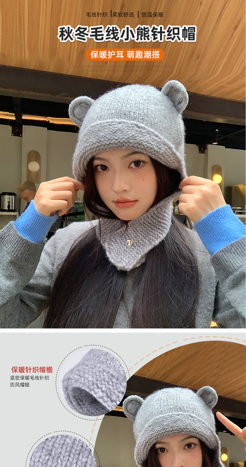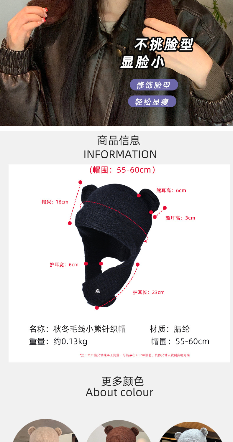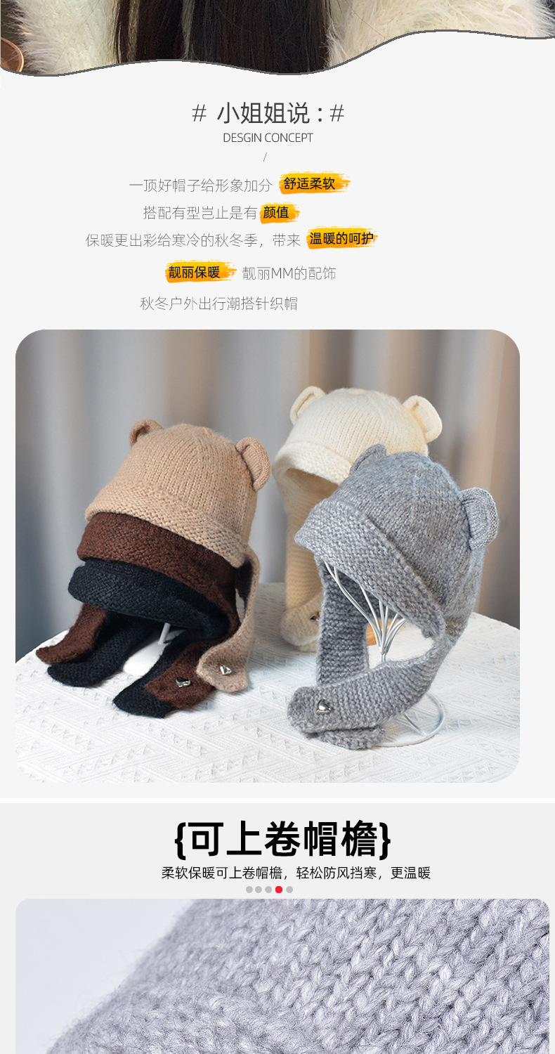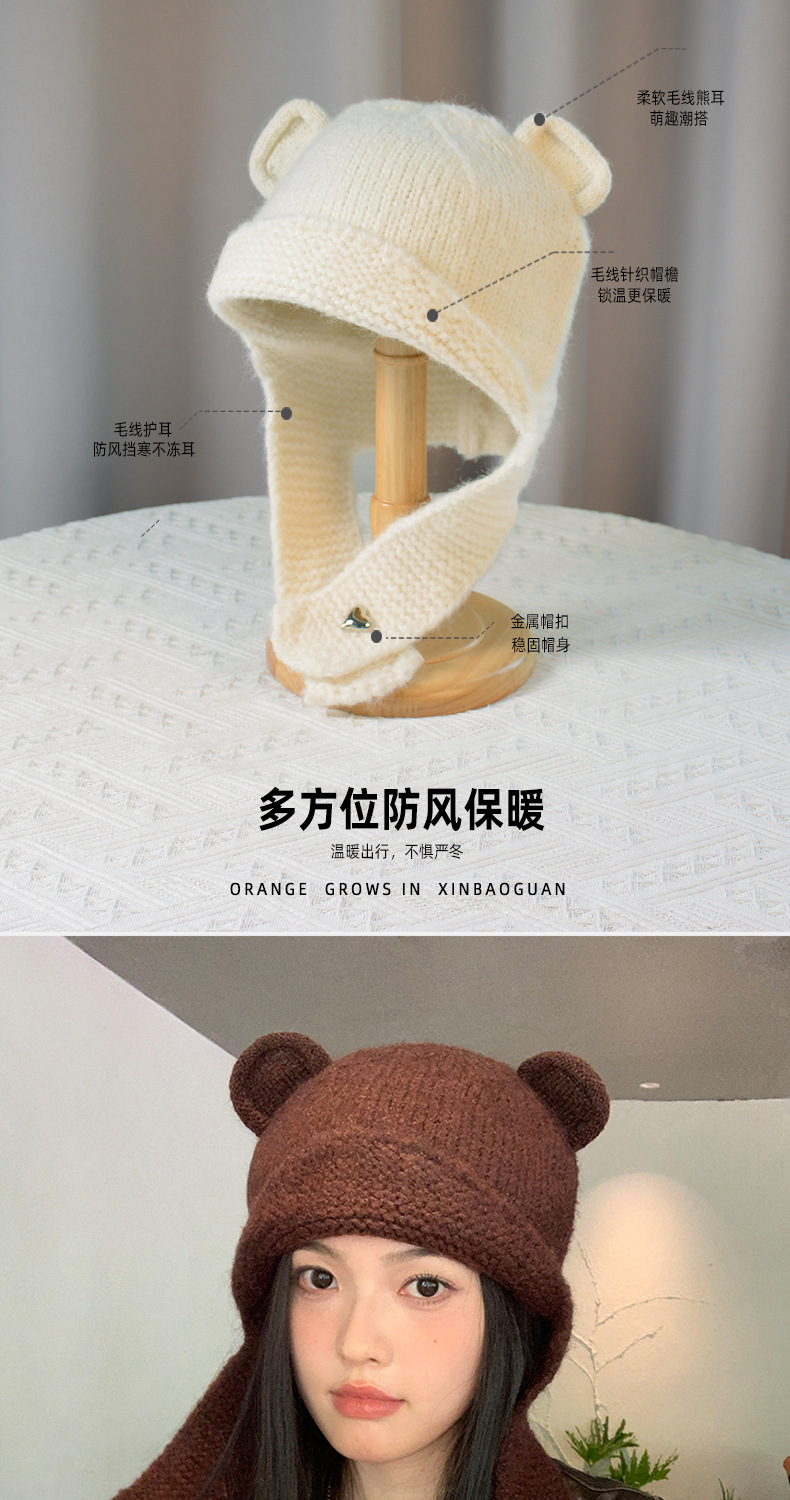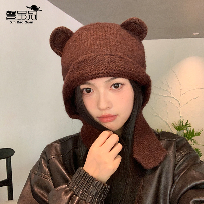 新款可爱小熊针织毛线帽秋冬季保暖套头帽子女户外防寒护耳雷锋帽