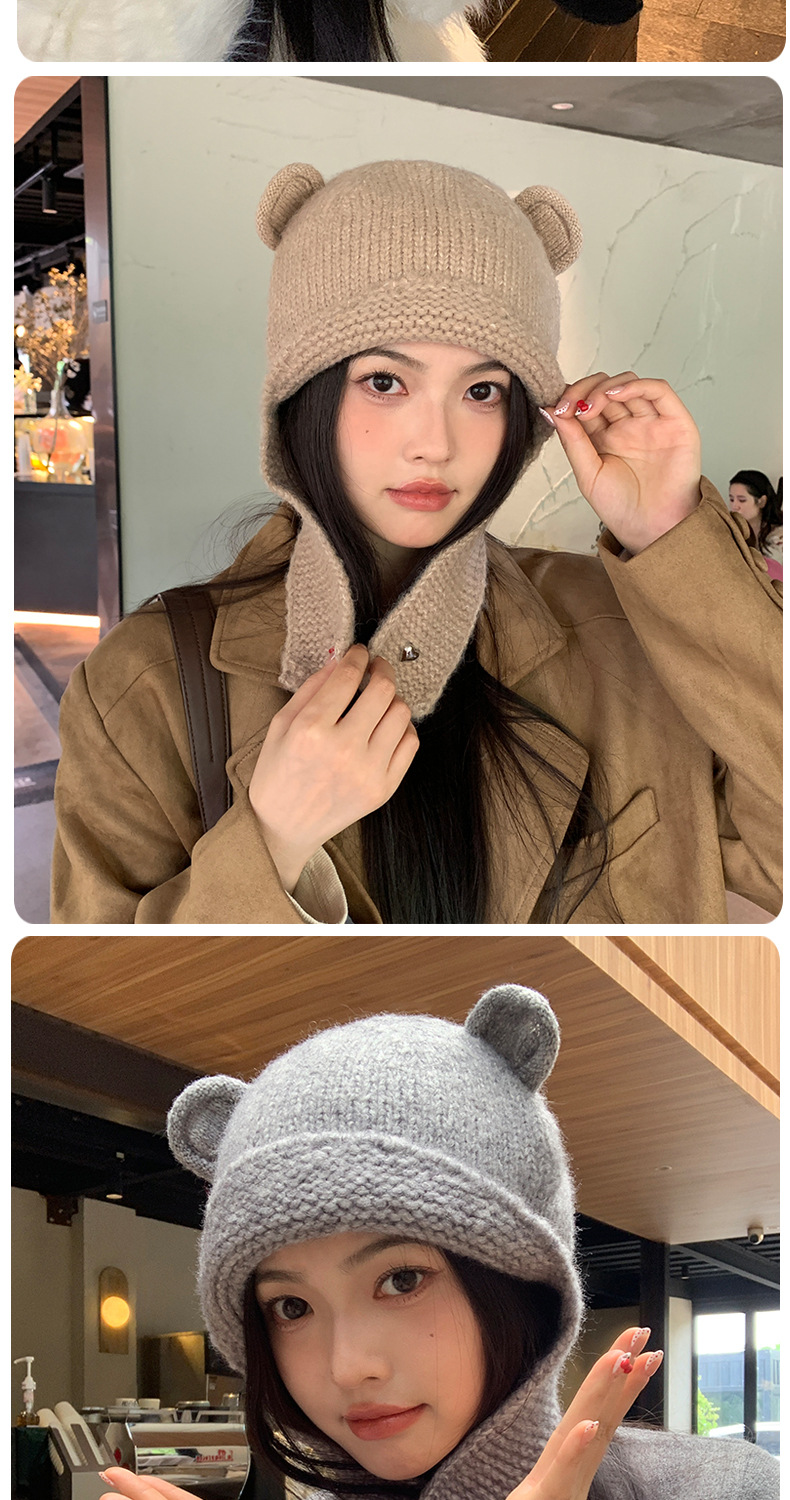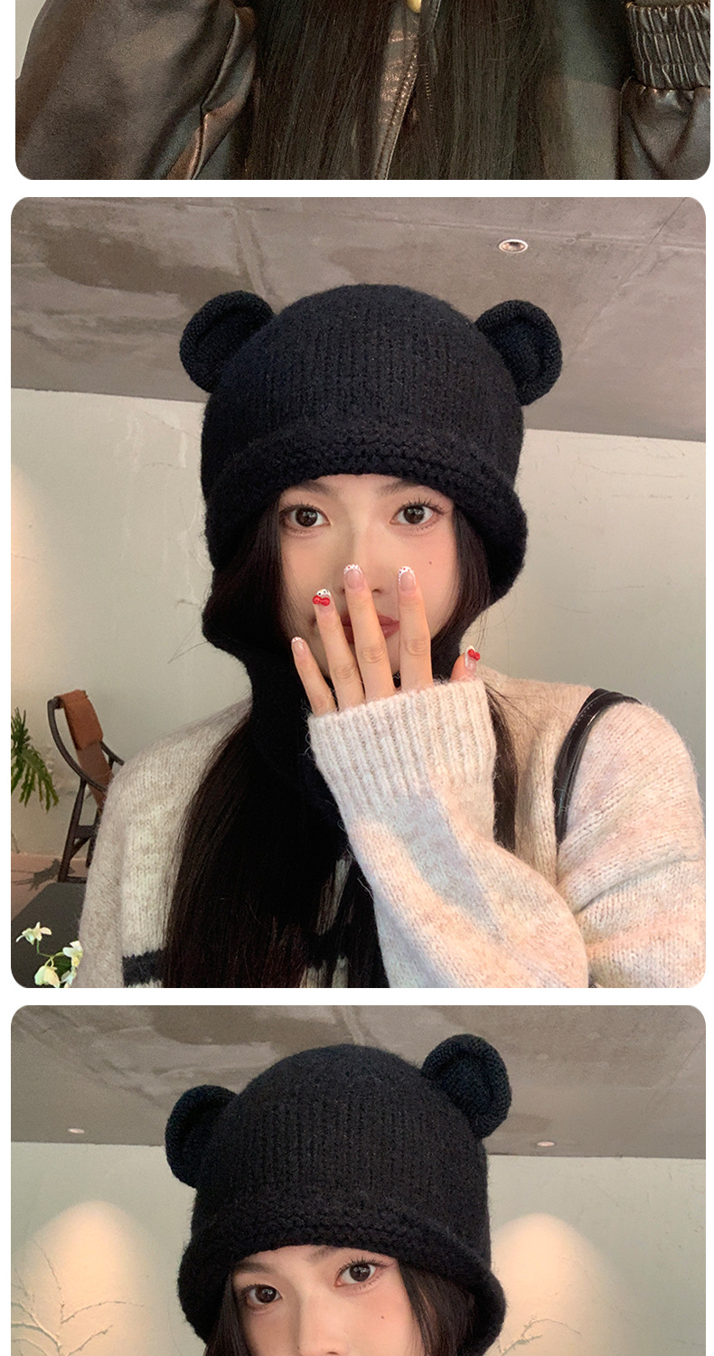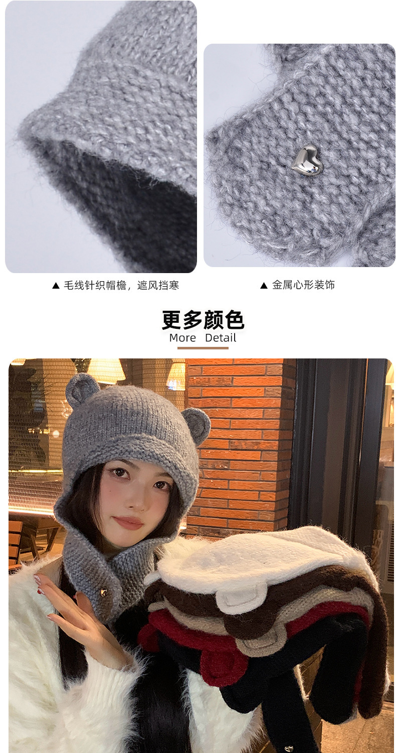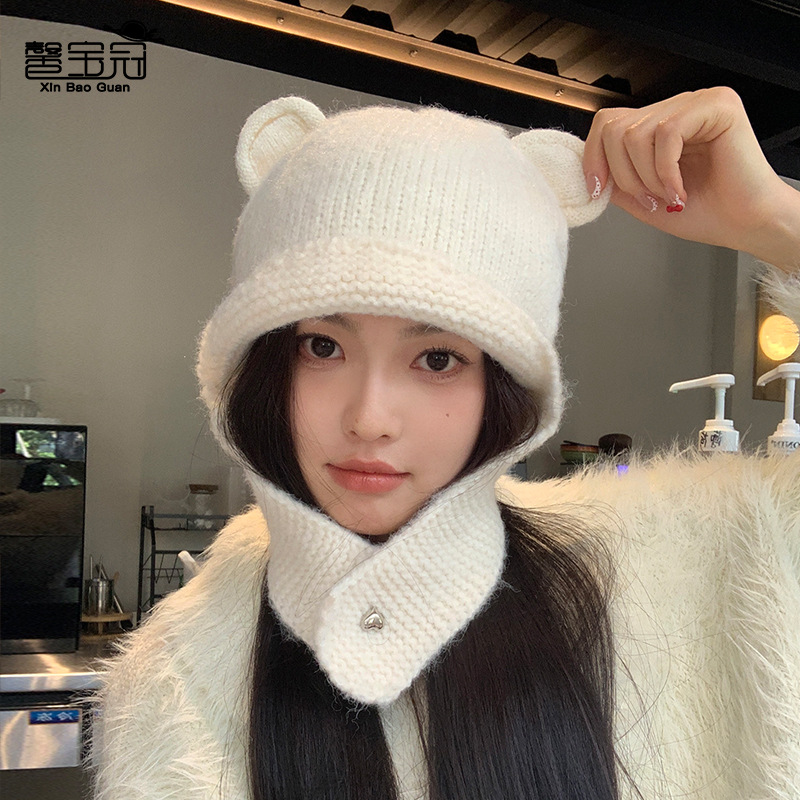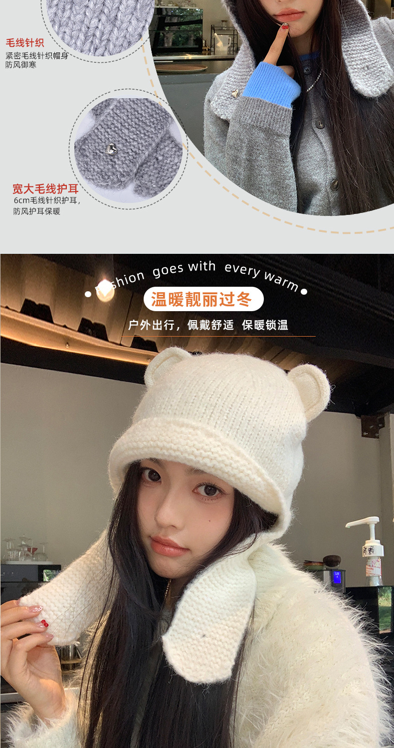 新款可爱小熊针织毛线帽秋冬季保暖套头帽子女户外防寒护耳雷锋帽