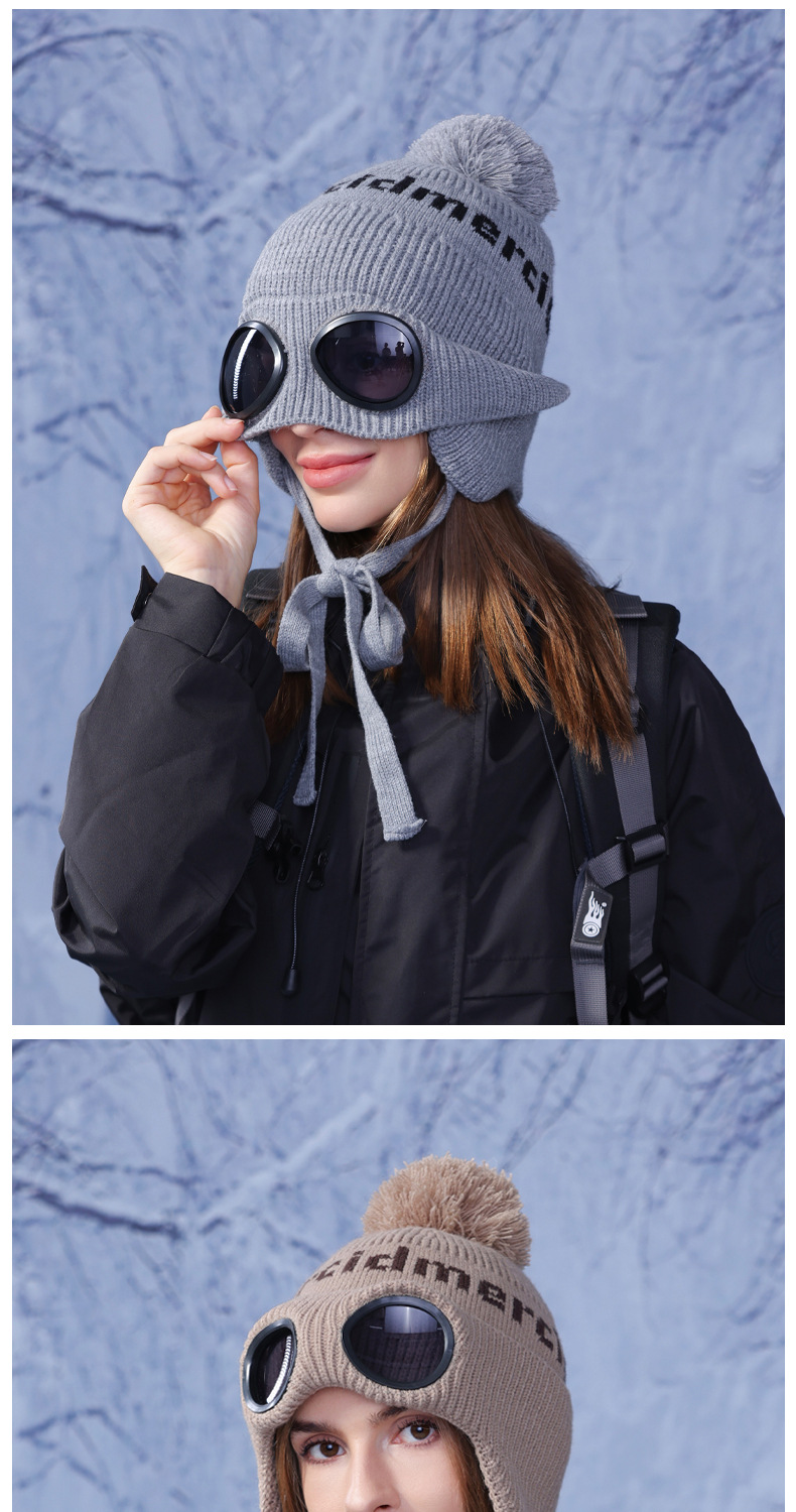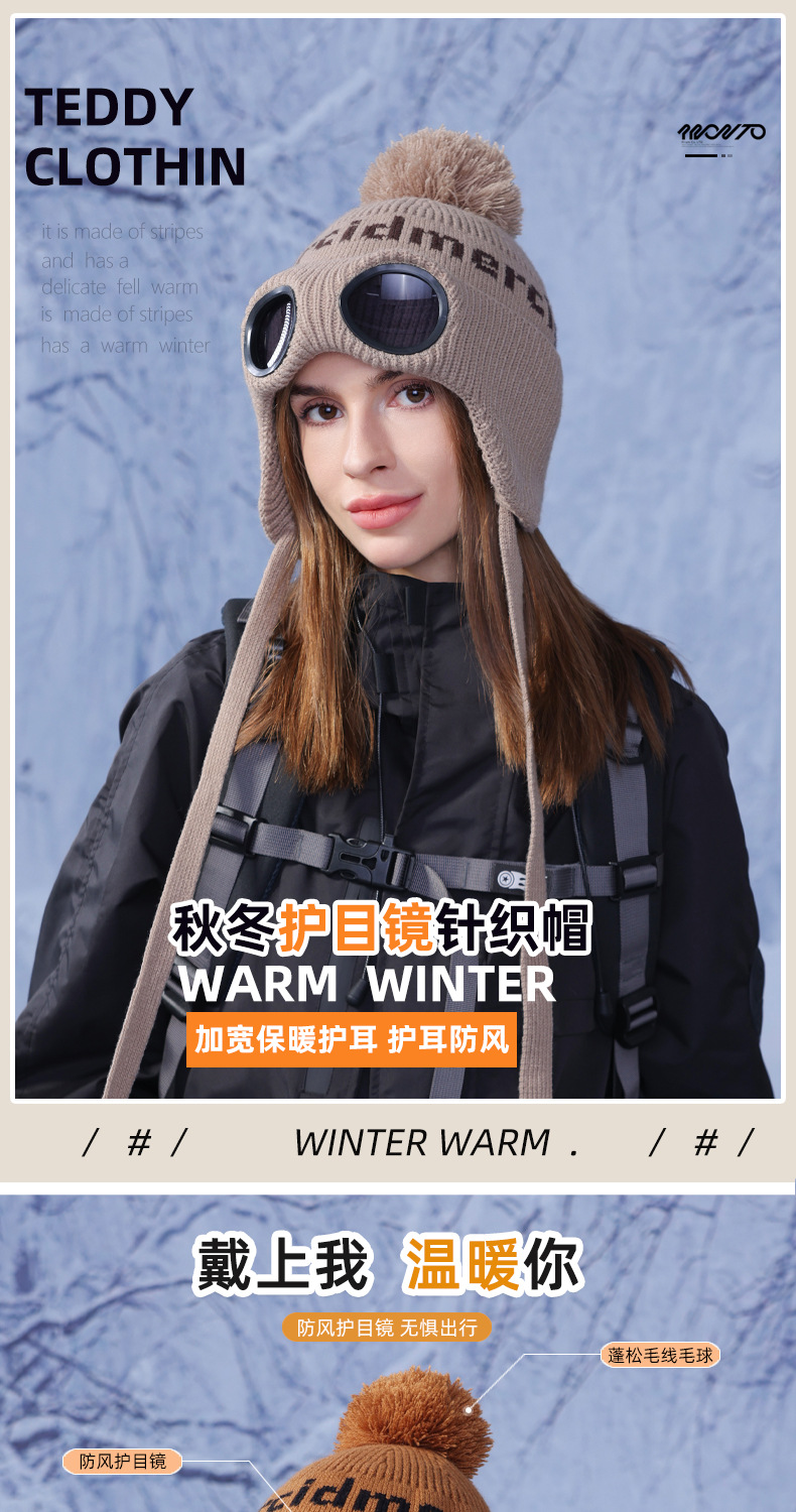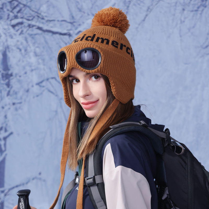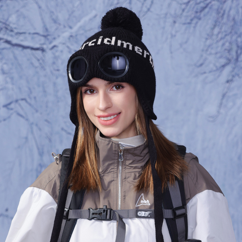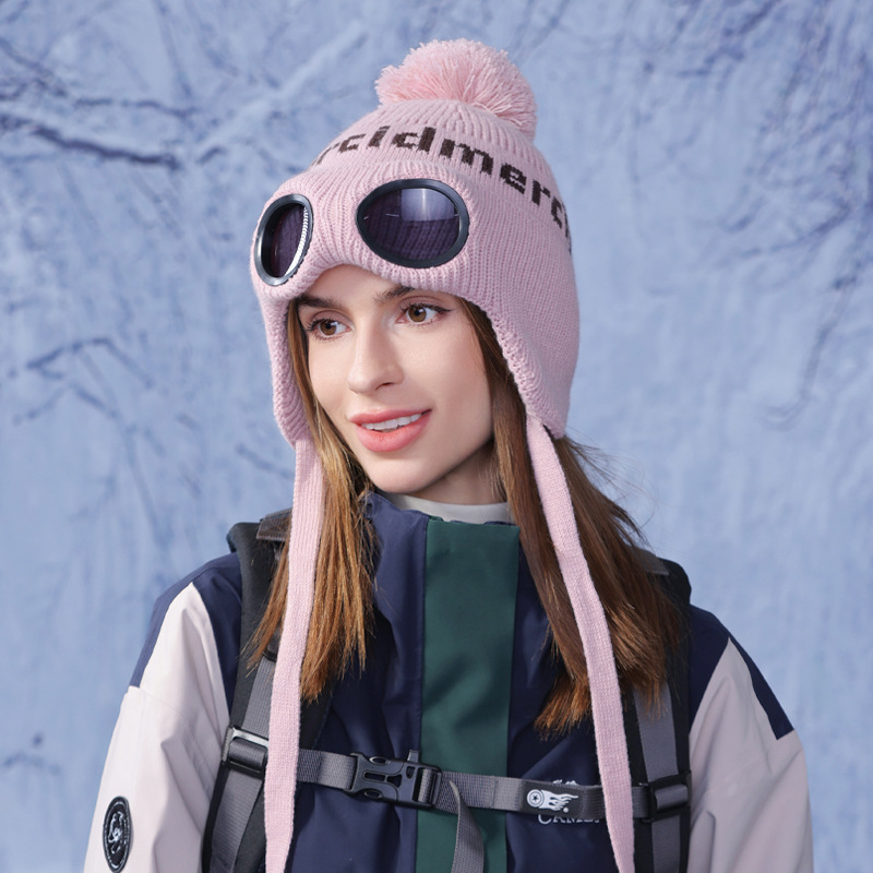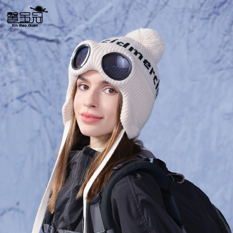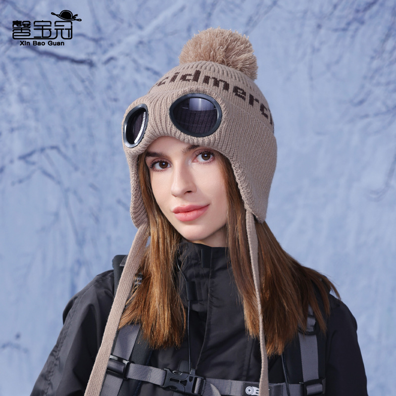冬季套头帽子女带眼镜毛球针织毛线帽户外防寒保暖护耳雷锋帽跨境