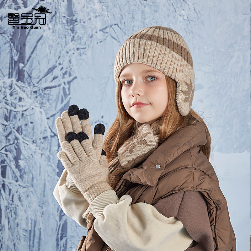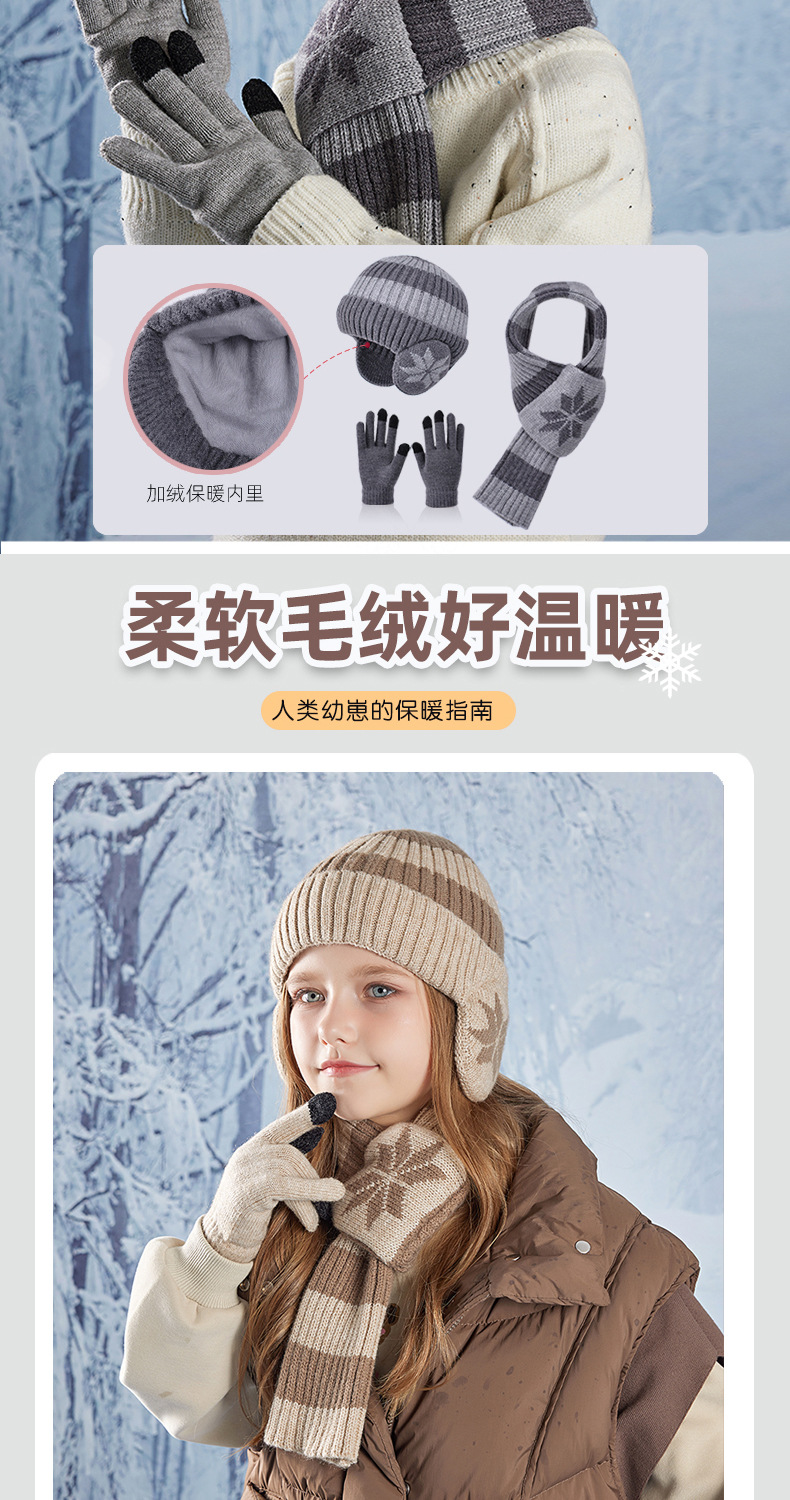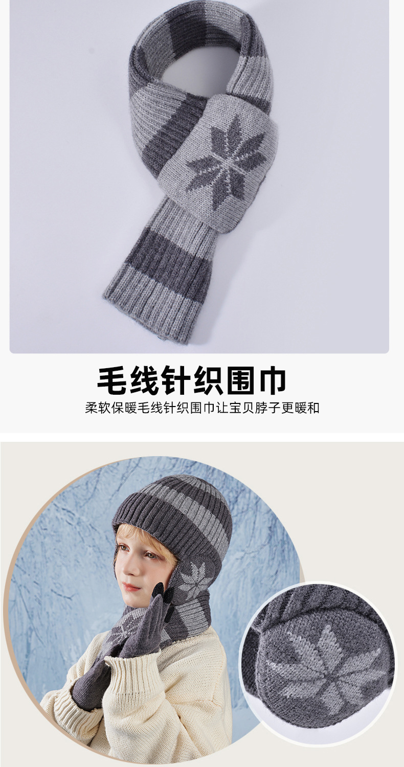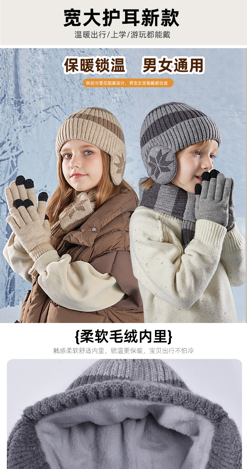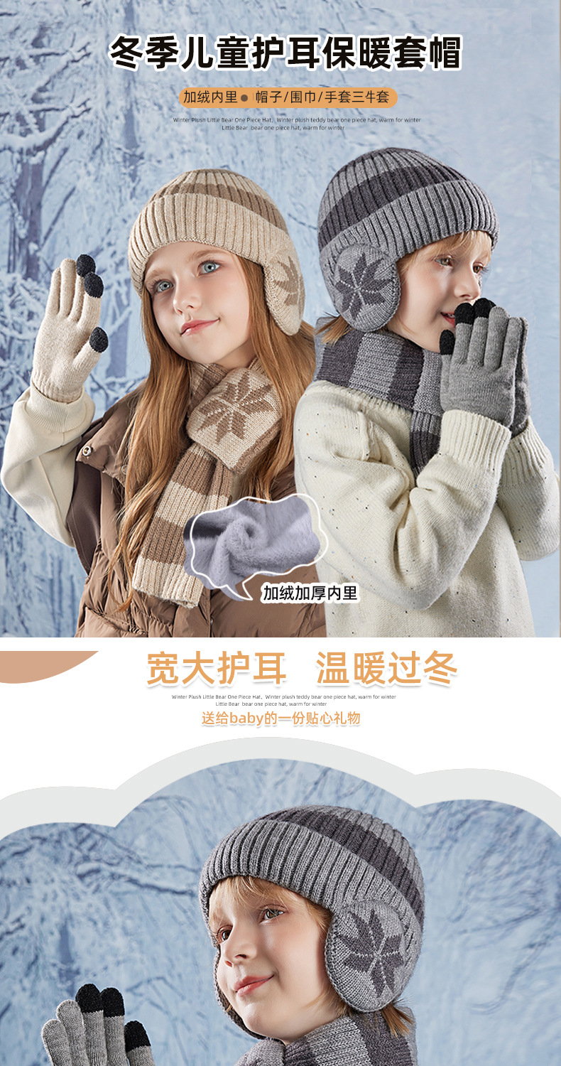 儿童帽子手套围巾套装男女宝宝加绒护耳套头帽冬季保暖针织毛线帽