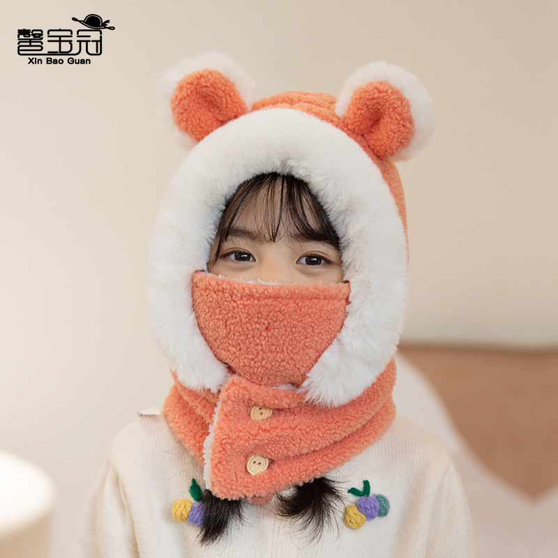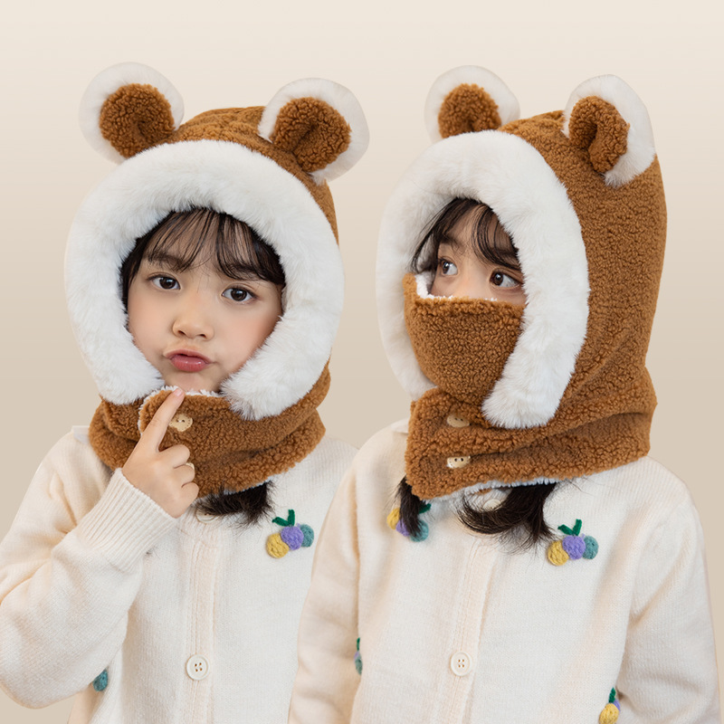 新款儿童帽子卡通小熊护耳口罩套头帽男女宝宝冬季加绒保暖帽2134