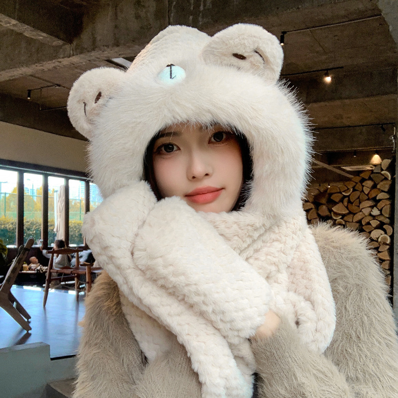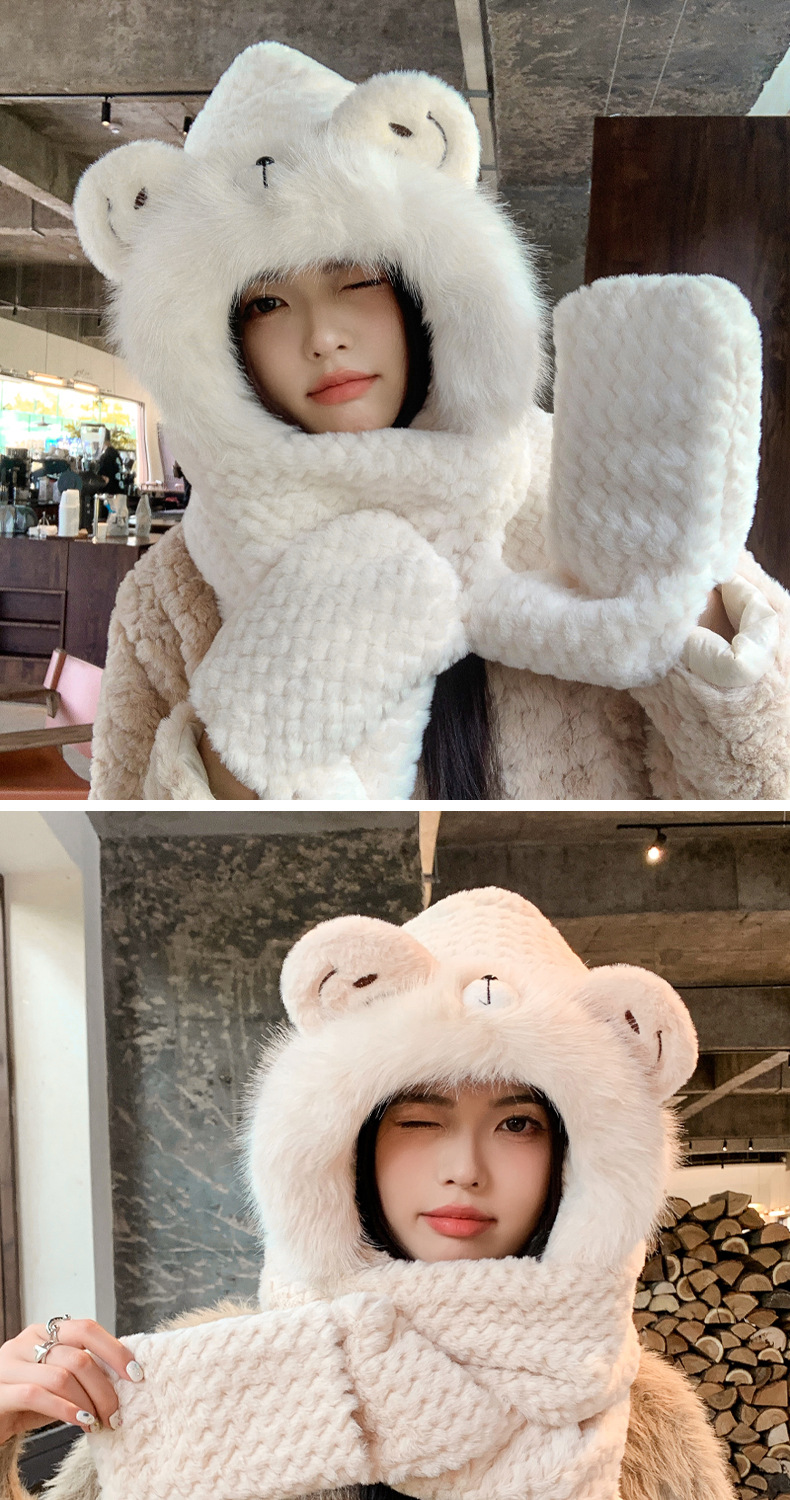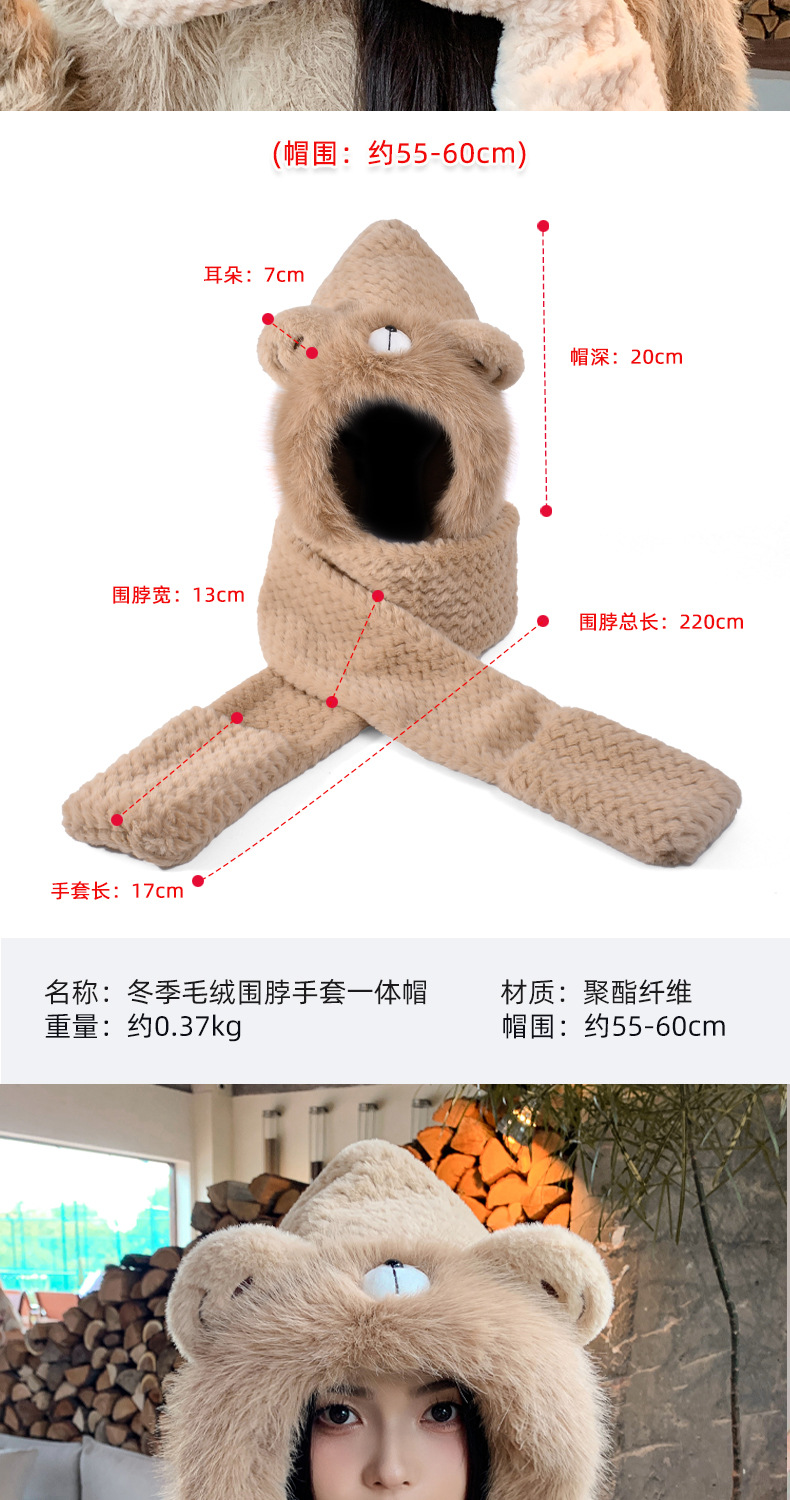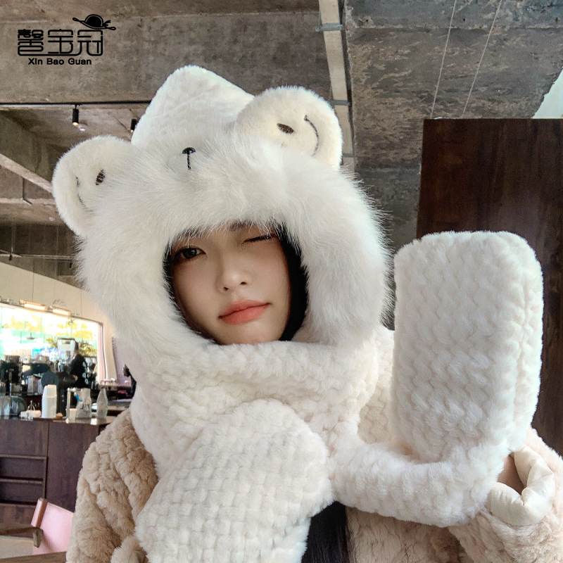 毛绒帽子围巾手套一体帽女可爱时尚护耳套头帽冬季保暖防寒三件套