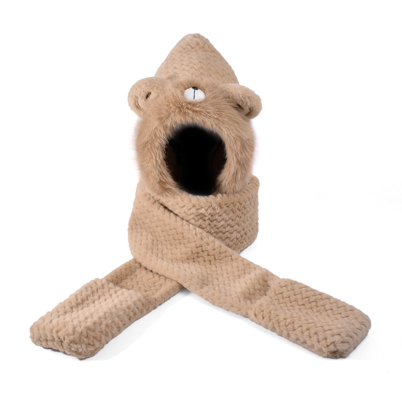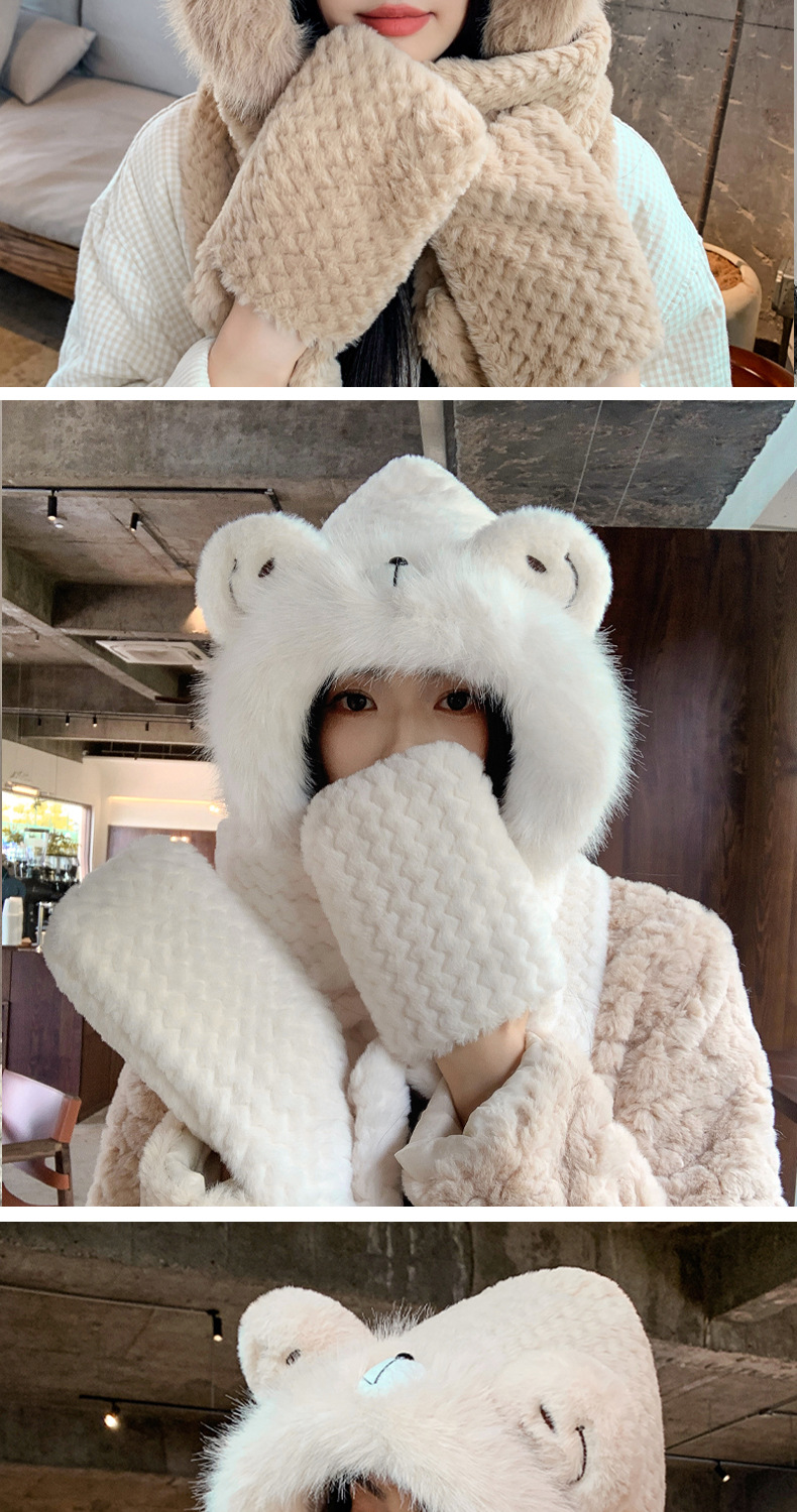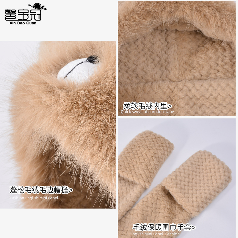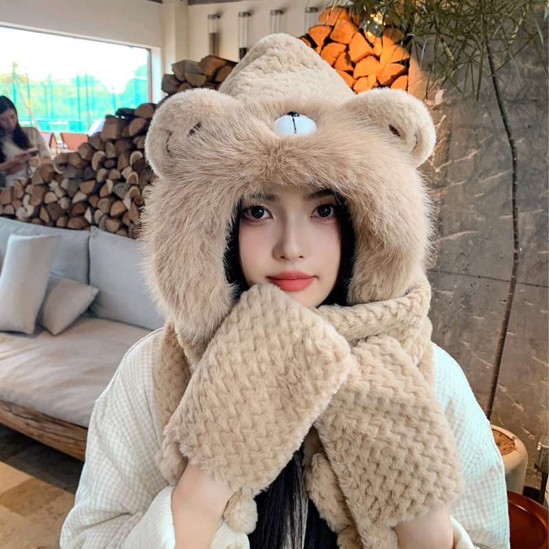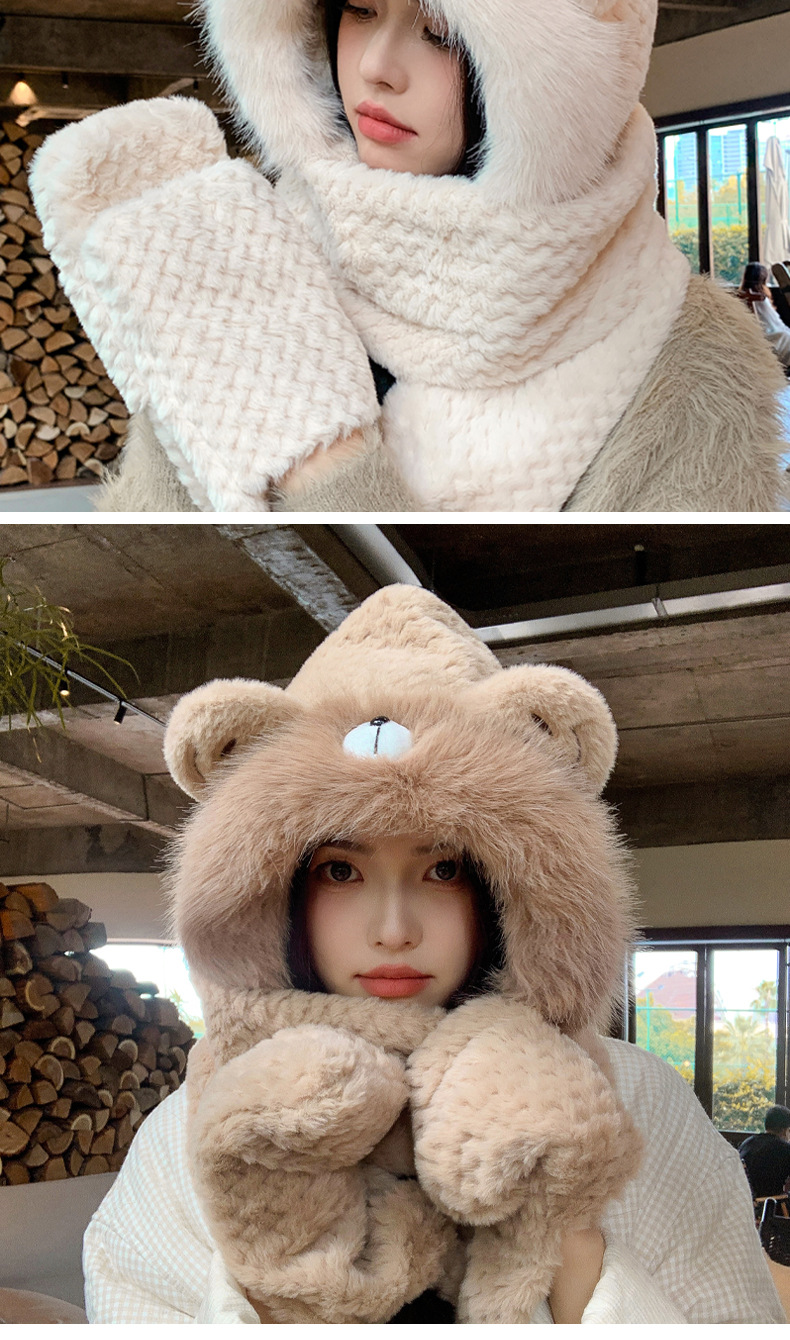毛绒帽子围巾手套一体帽女可爱时尚护耳套头帽冬季保暖防寒三件套