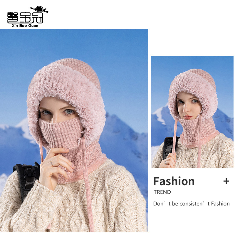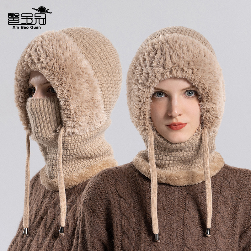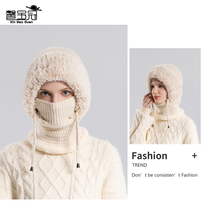 8409口罩围脖一体帽子连体套头帽女士户外骑行加绒保暖针织毛线帽