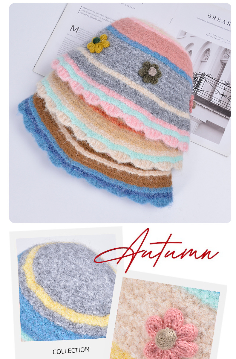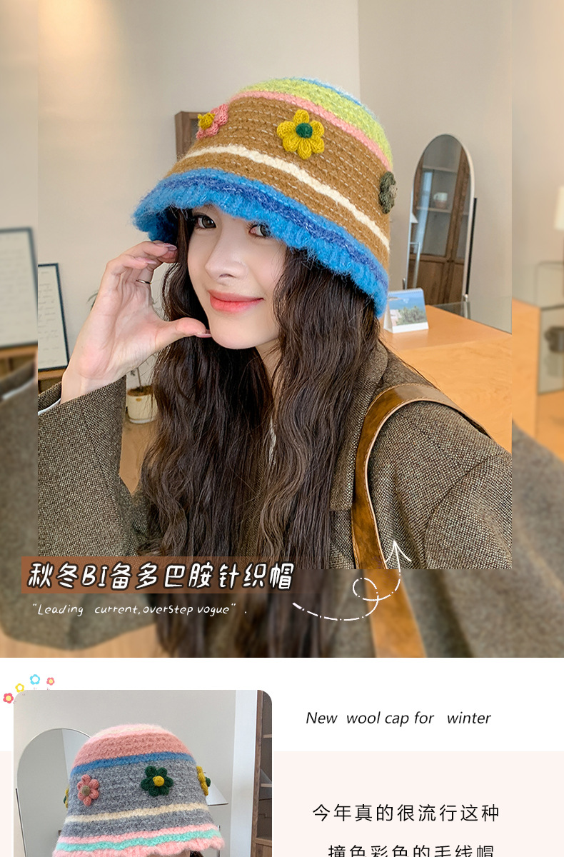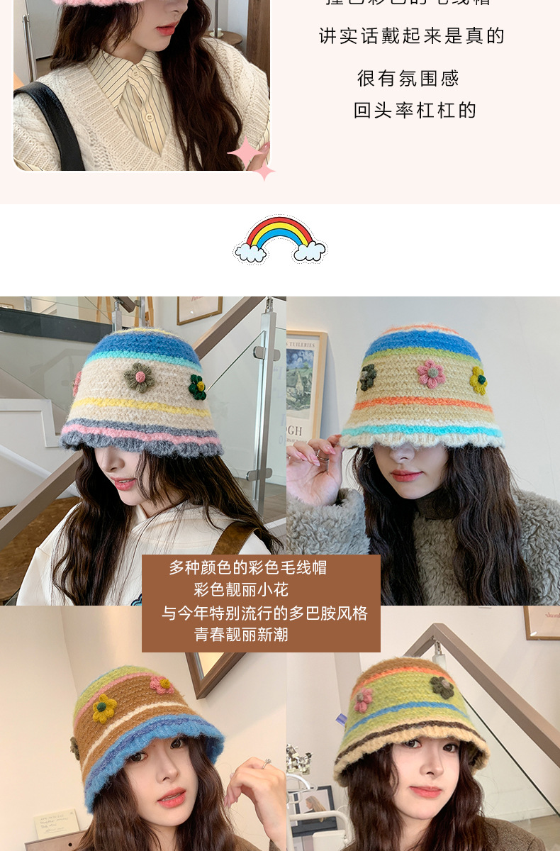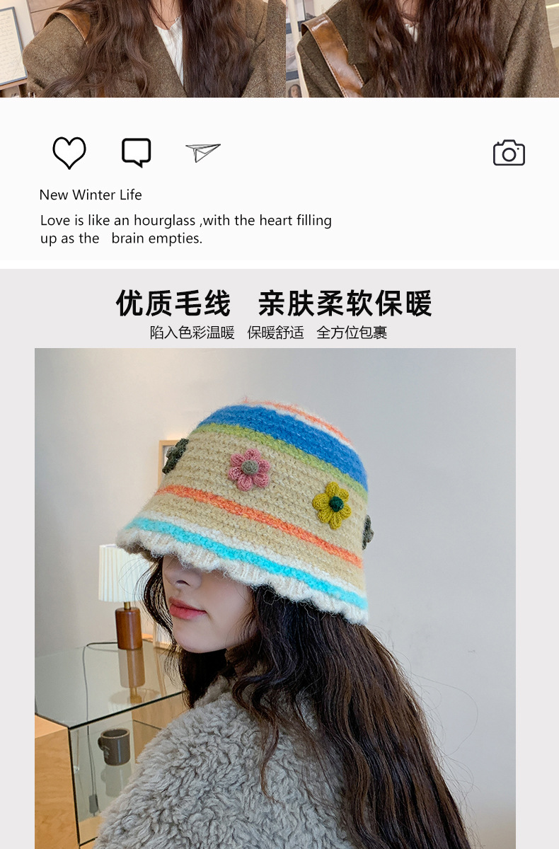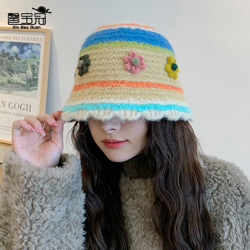 8560日系镂空针织盆帽秋冬季甜美多巴胺毛线帽子女彩色花朵渔夫帽