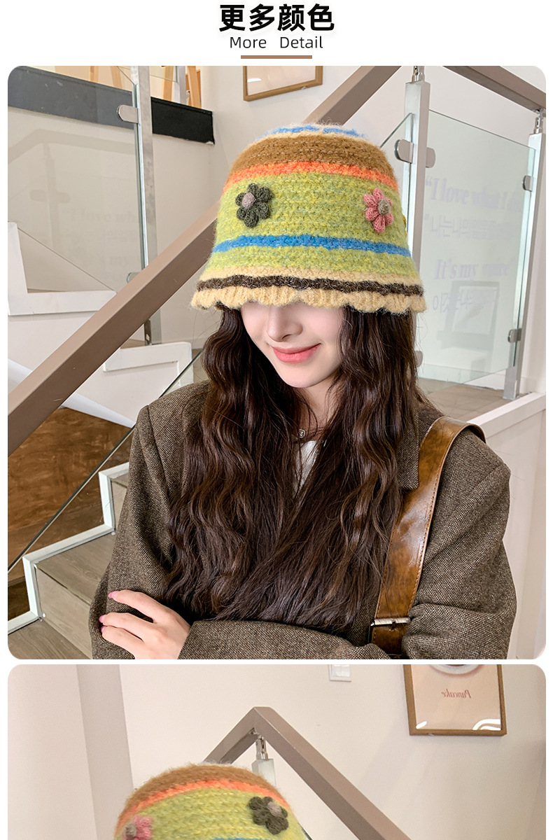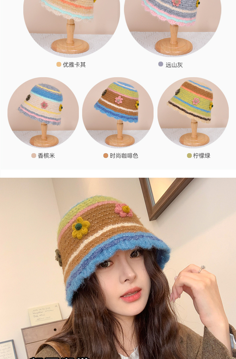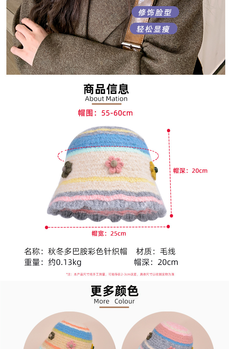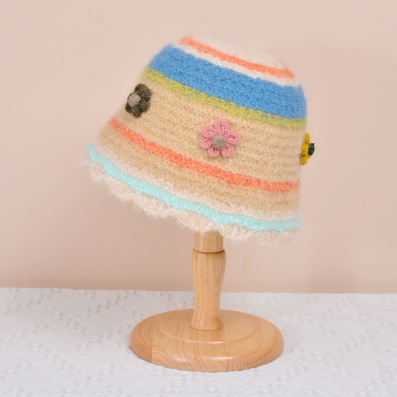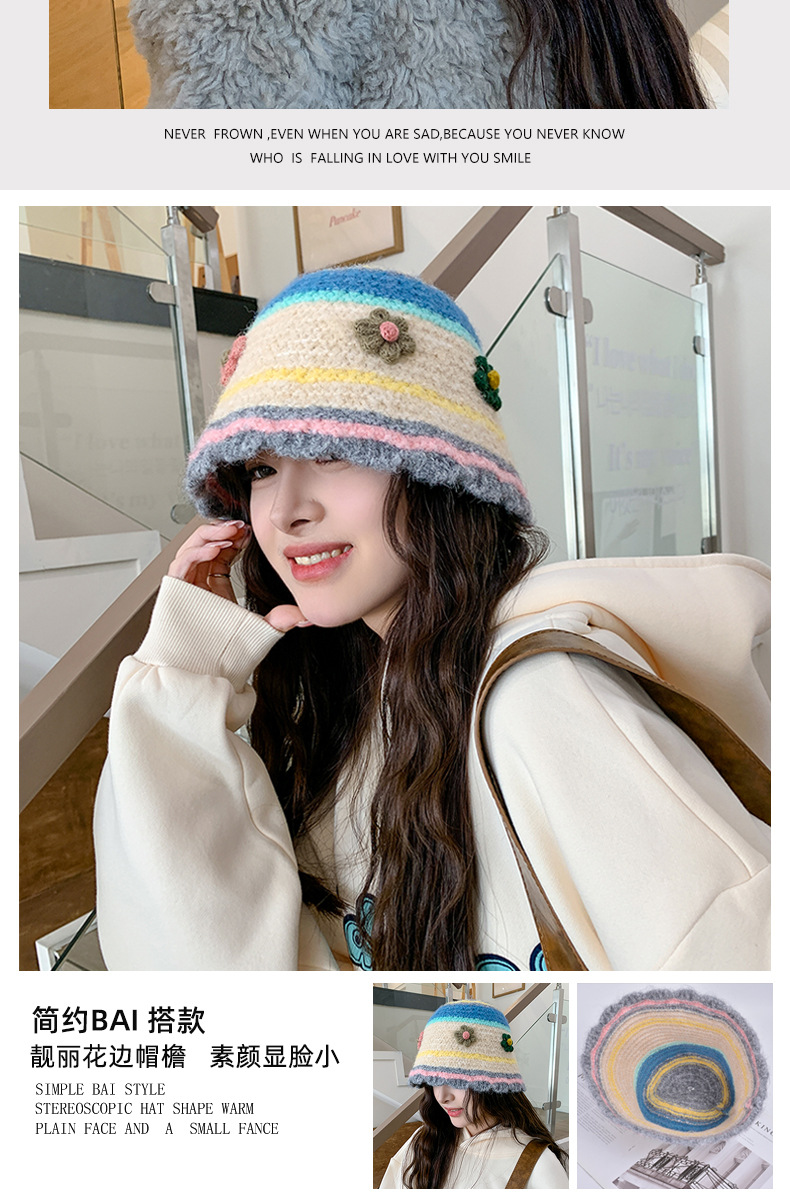 8560日系镂空针织盆帽秋冬季甜美多巴胺毛线帽子女彩色花朵渔夫帽