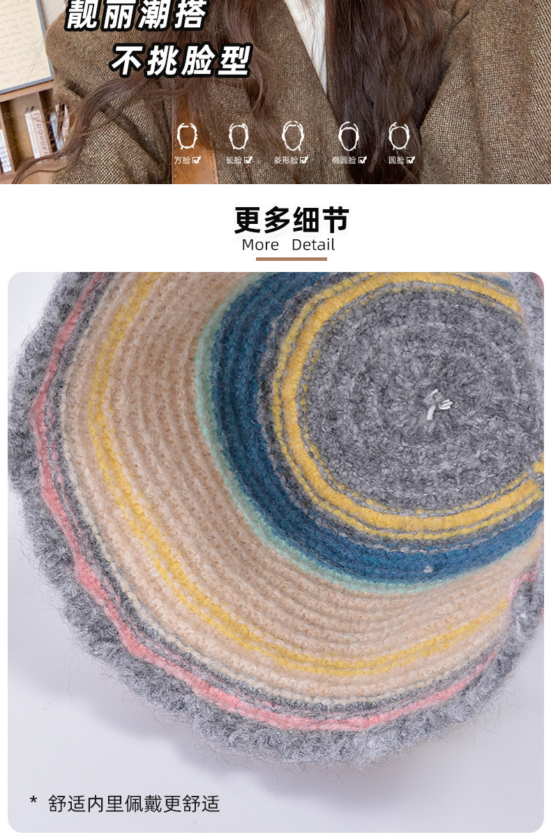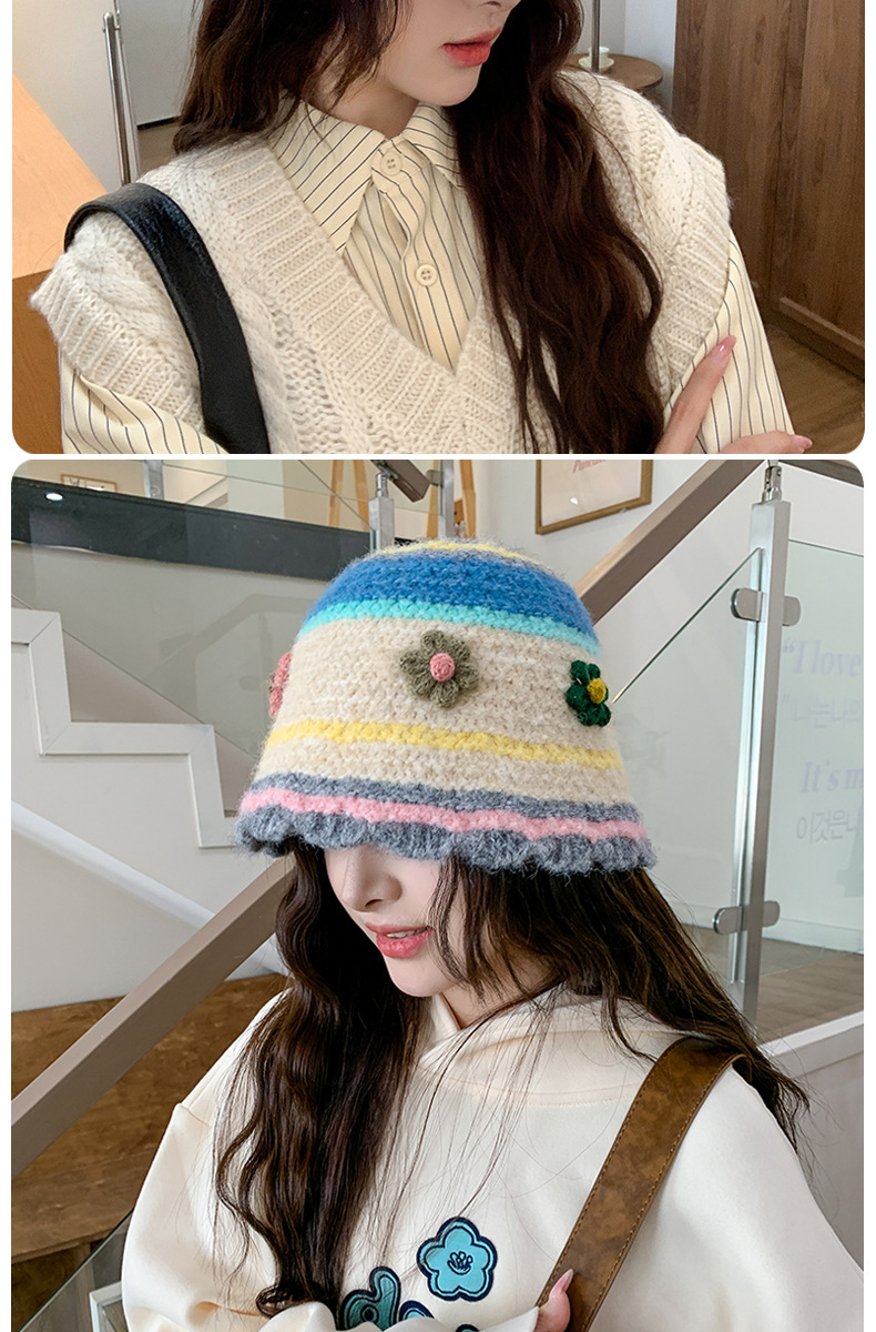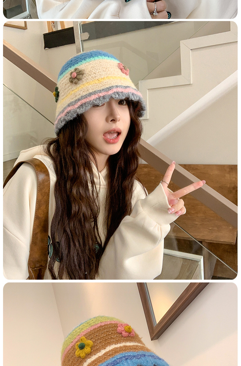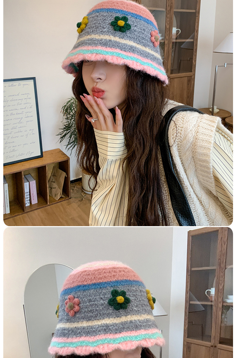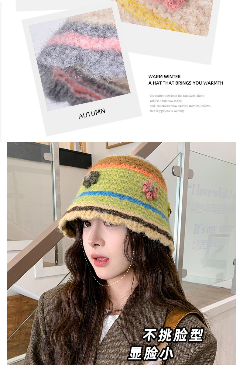 8560日系镂空针织盆帽秋冬季甜美多巴胺毛线帽子女彩色花朵渔夫帽