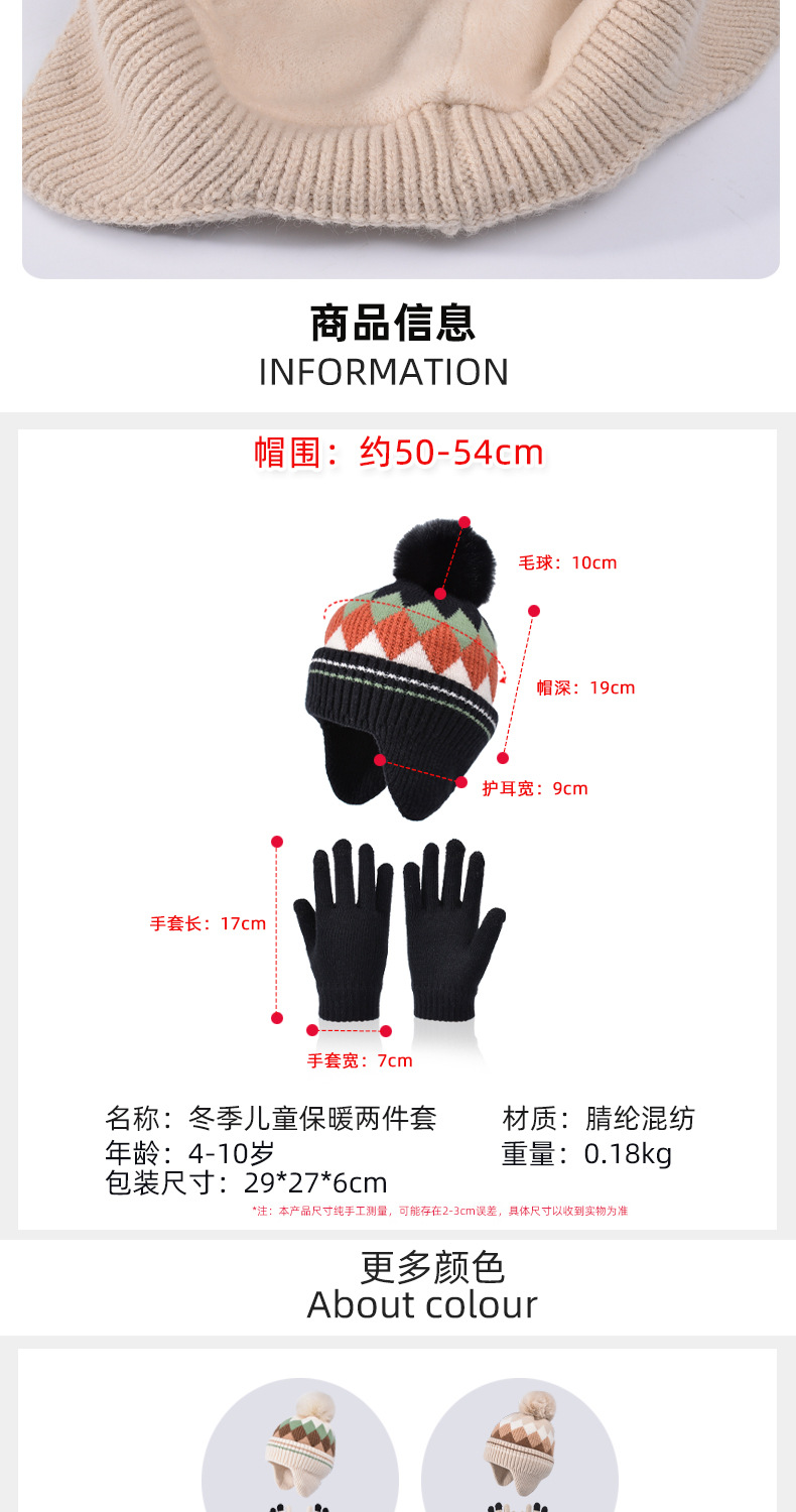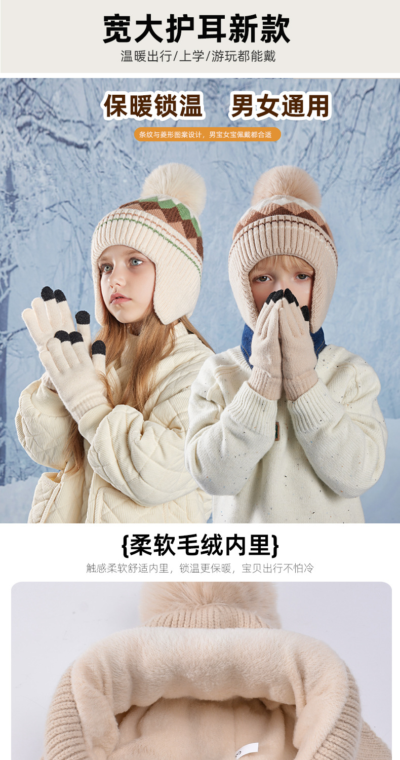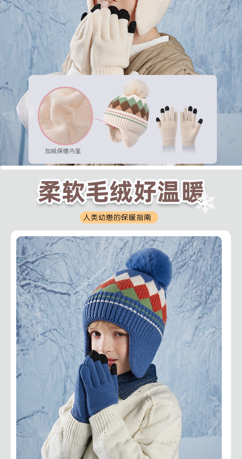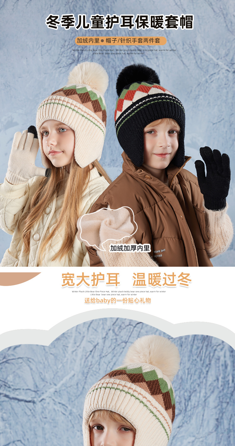 儿童帽子手套毛球彩色菱形针织毛线帽男女宝宝加绒保暖护耳套头帽