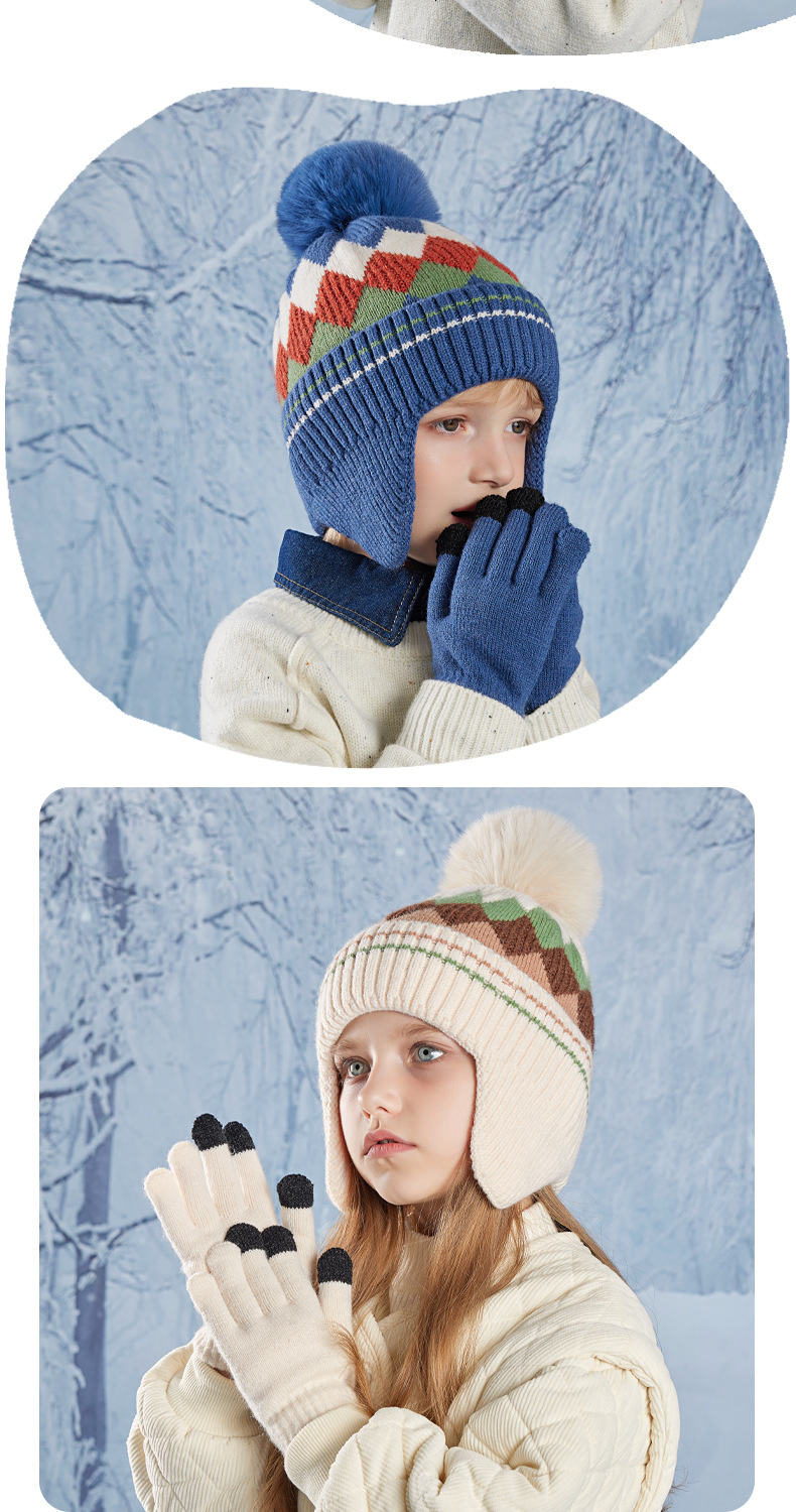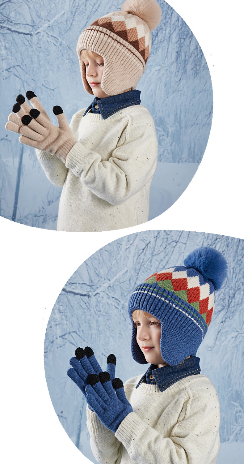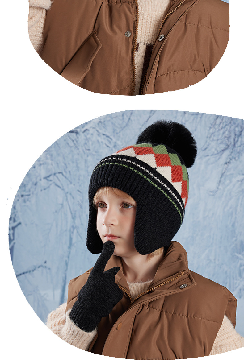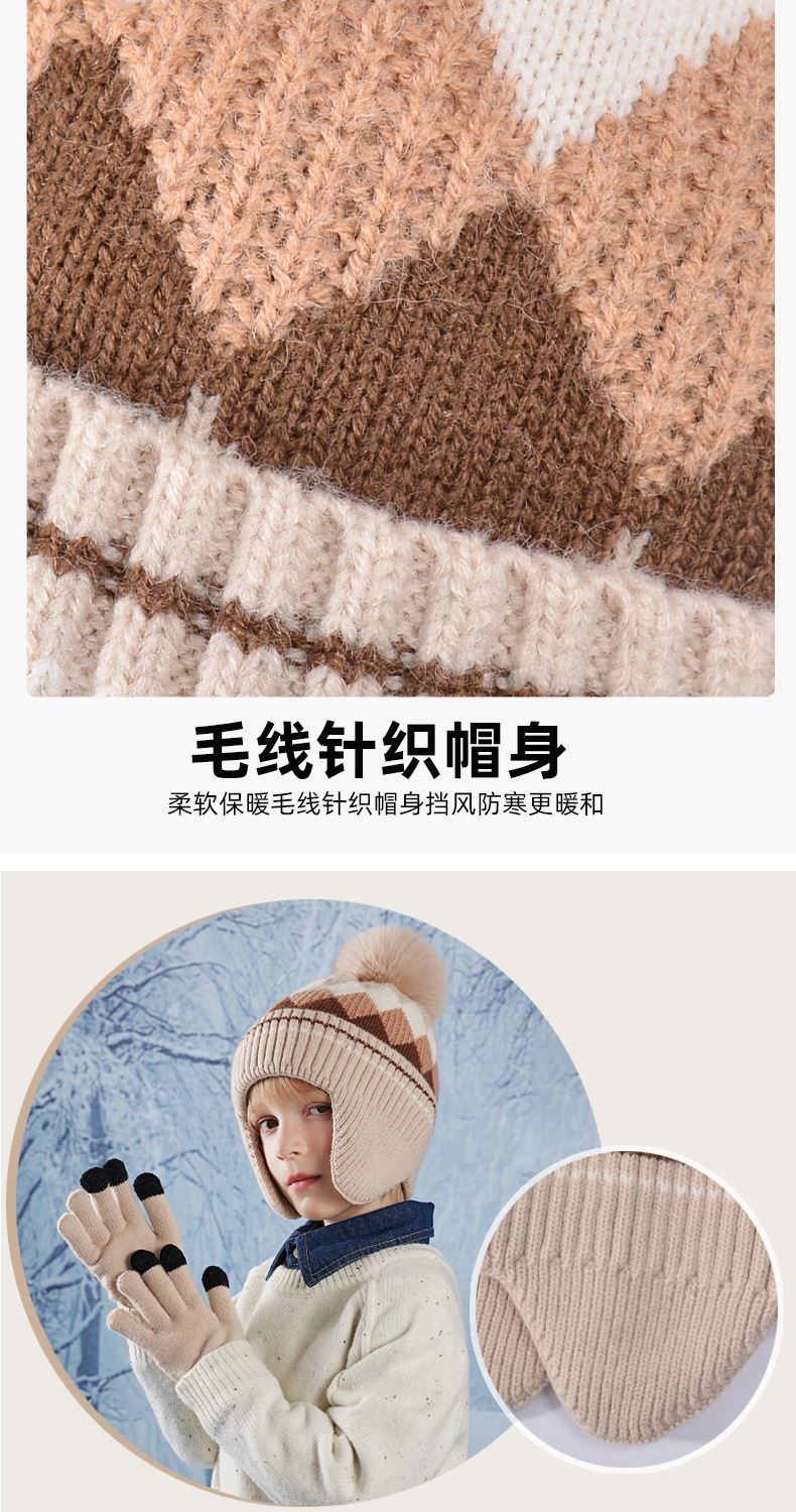 儿童帽子手套毛球彩色菱形针织毛线帽男女宝宝加绒保暖护耳套头帽