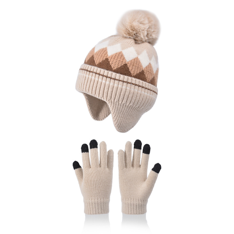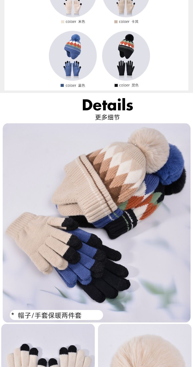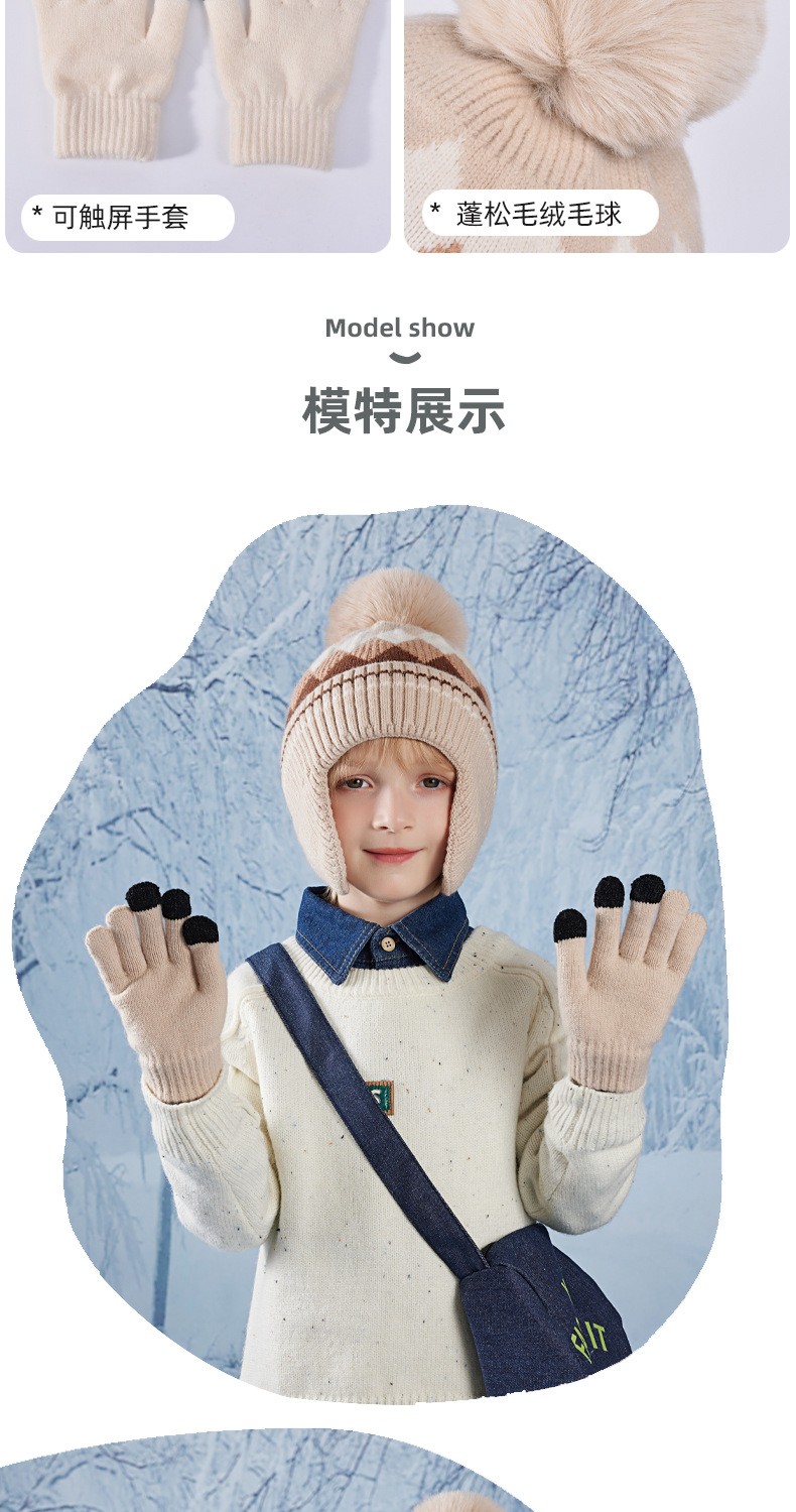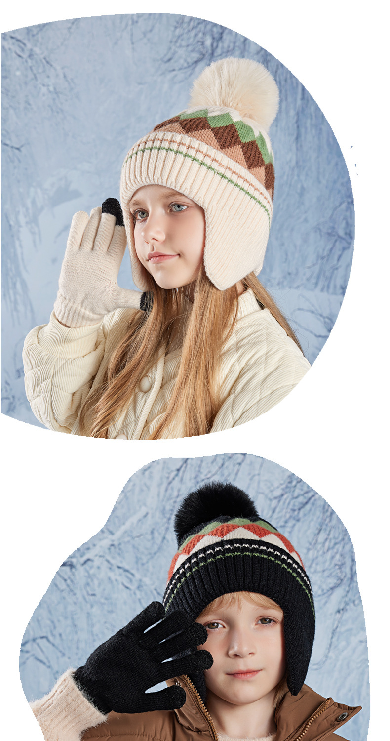 儿童帽子手套毛球彩色菱形针织毛线帽男女宝宝加绒保暖护耳套头帽