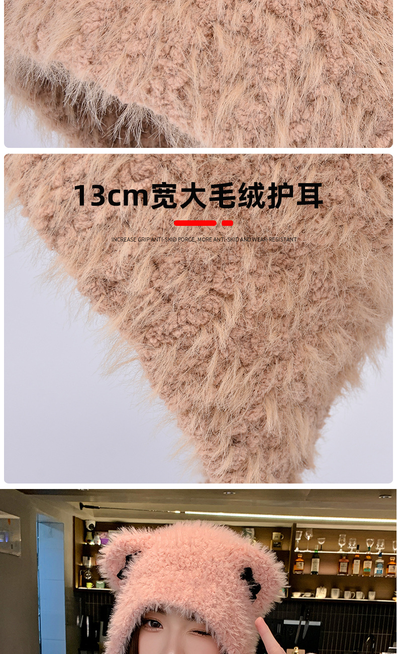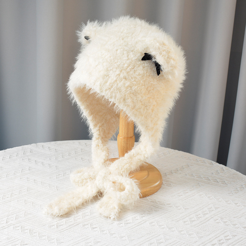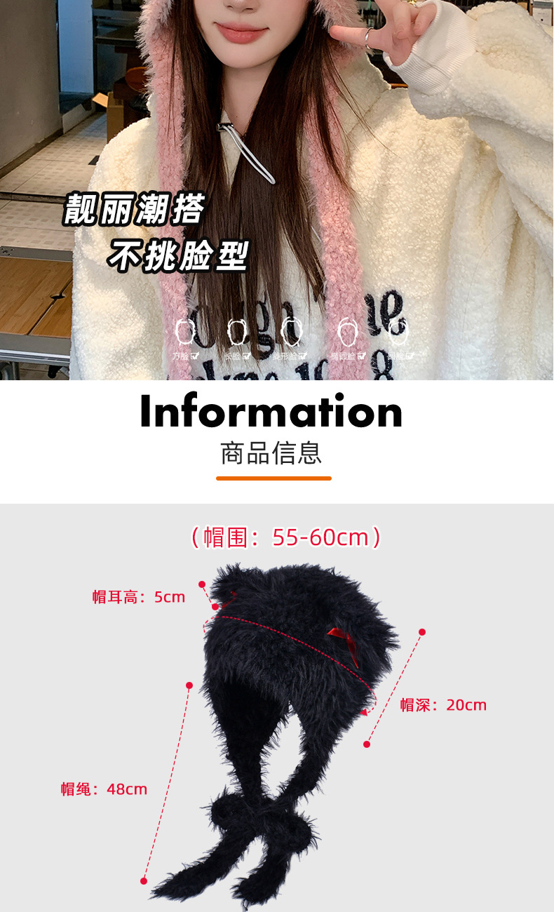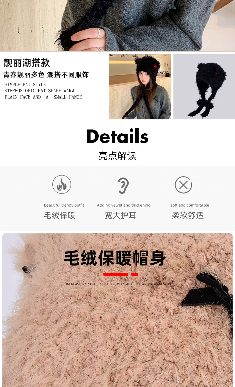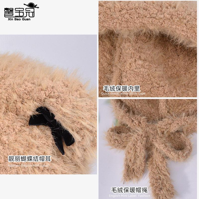 毛绒护耳帽子女可爱猫耳蝴蝶结雷锋帽秋冬防寒保暖针织毛线套头帽