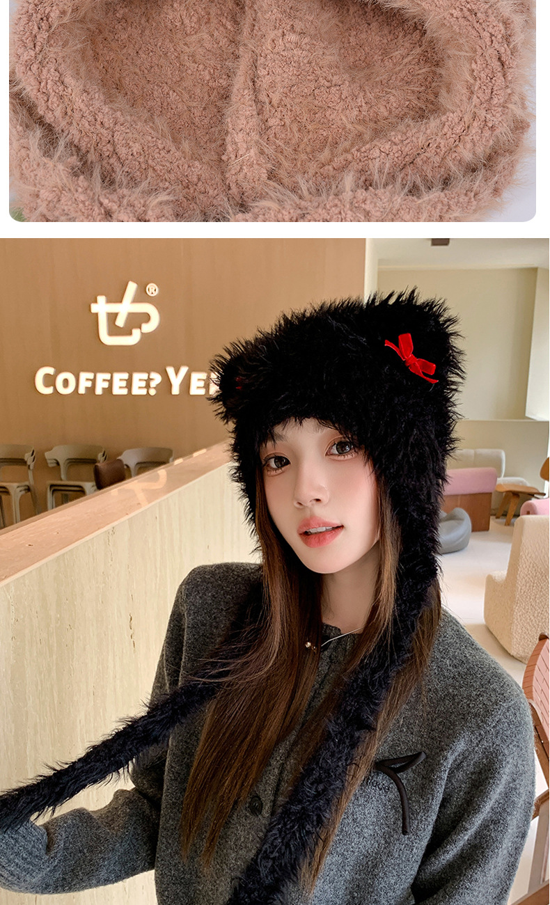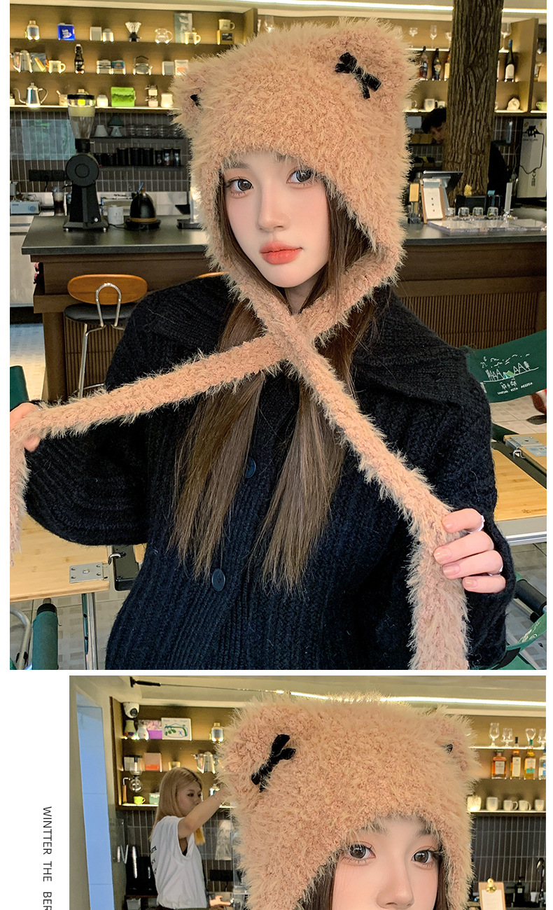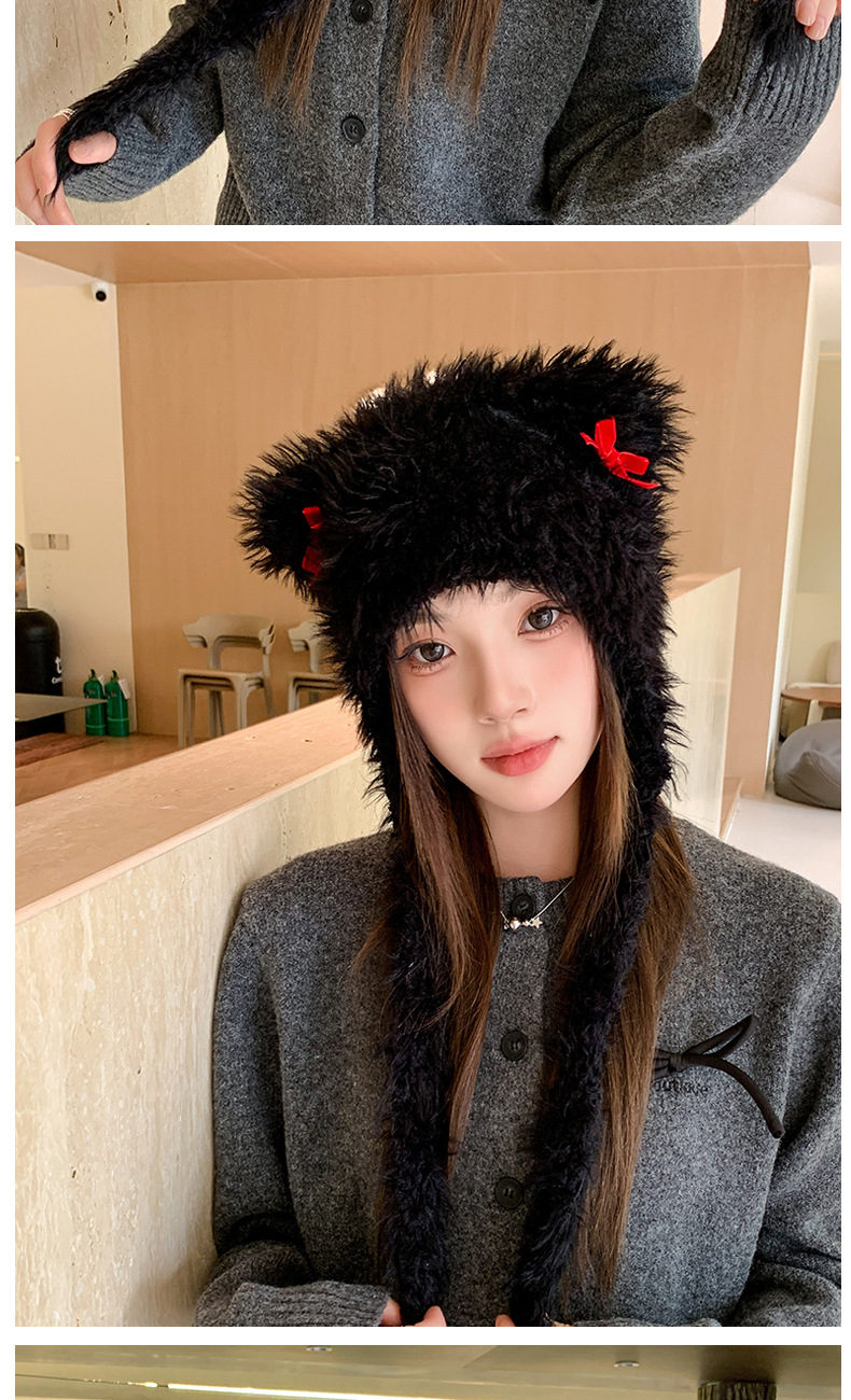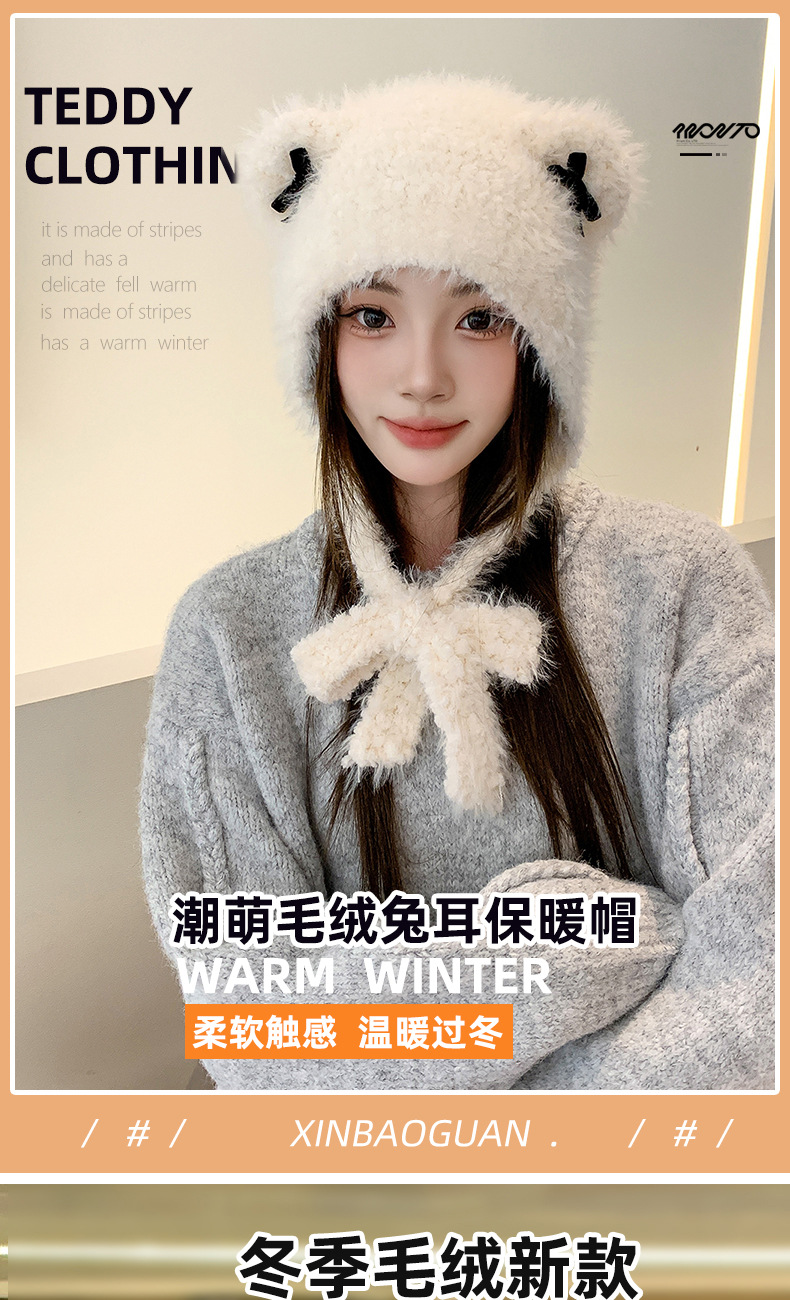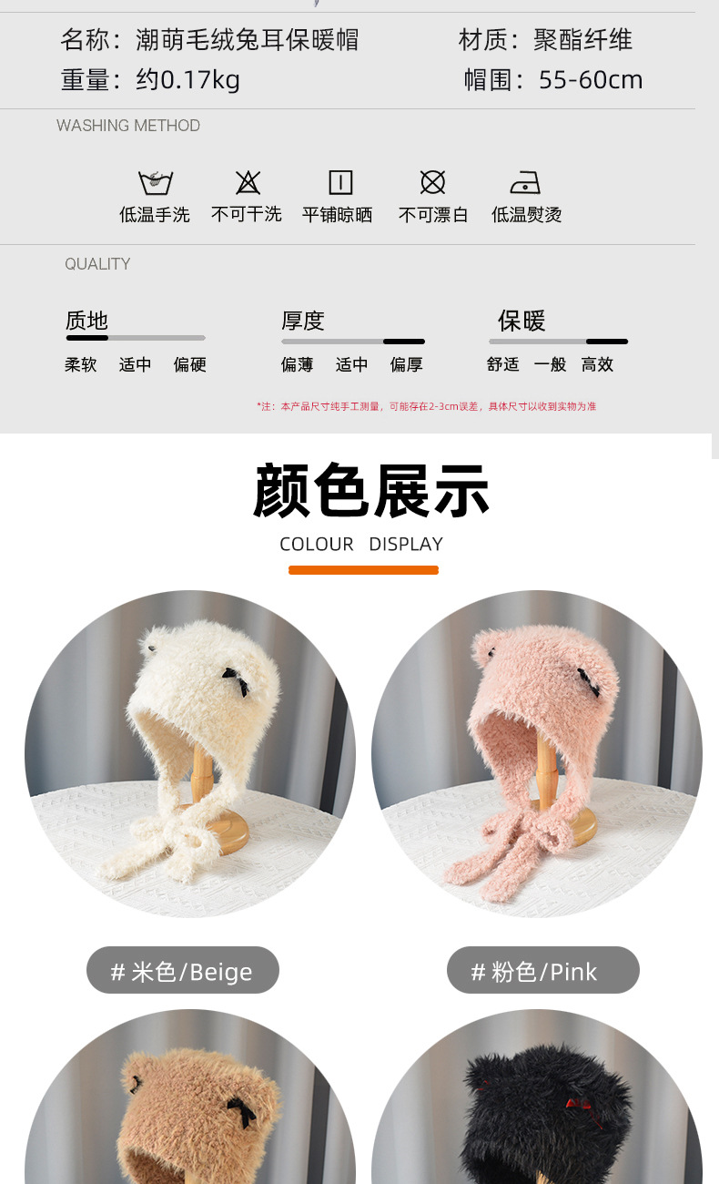 毛绒护耳帽子女可爱猫耳蝴蝶结雷锋帽秋冬防寒保暖针织毛线套头帽