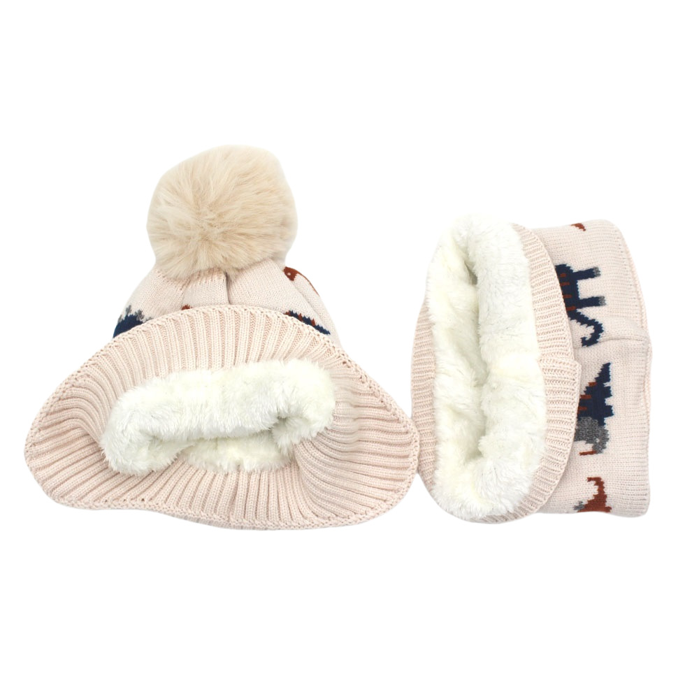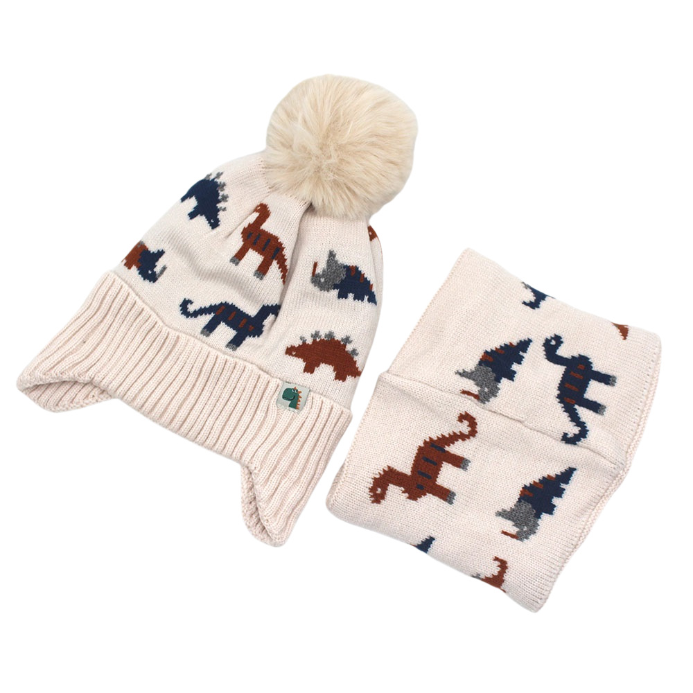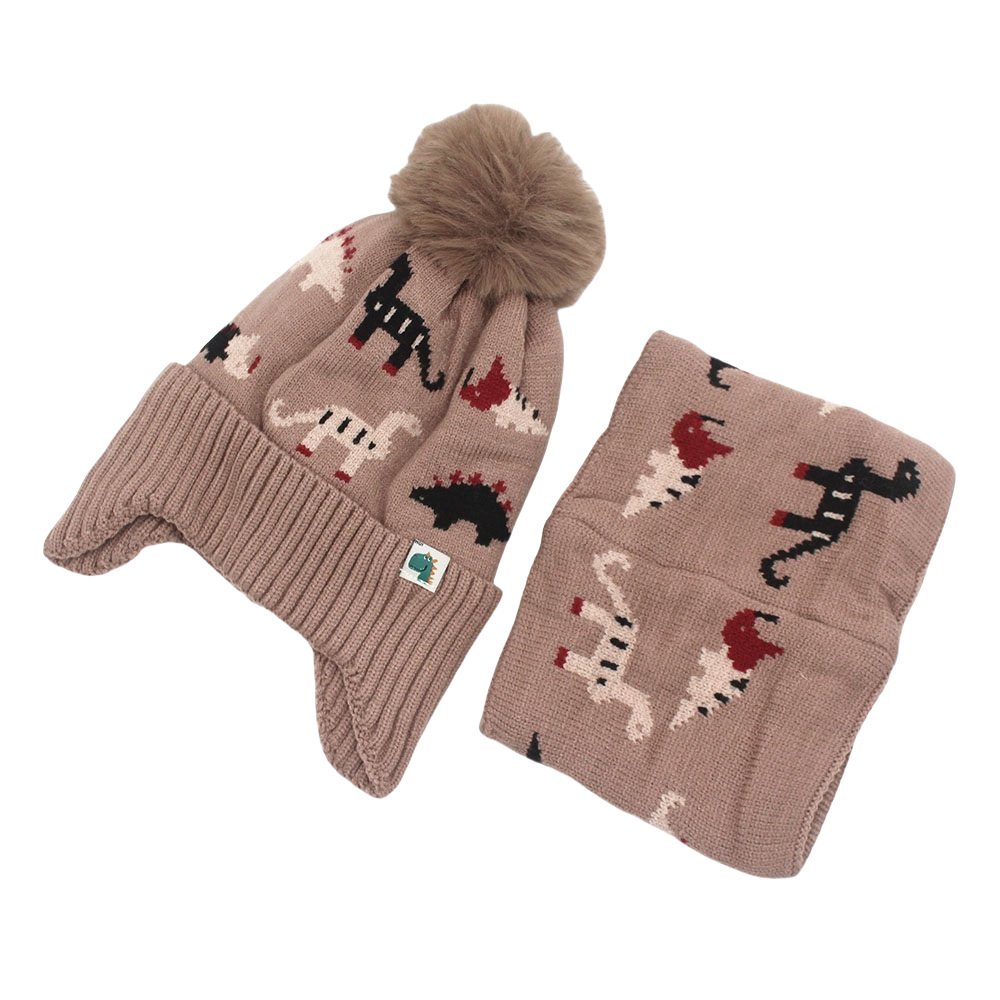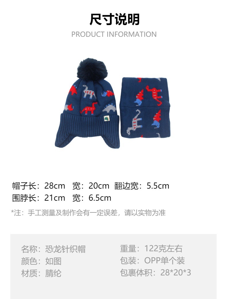 跨境热两件套卡通恐龙提花儿童针织帽帽子围脖加绒加厚护耳毛线帽