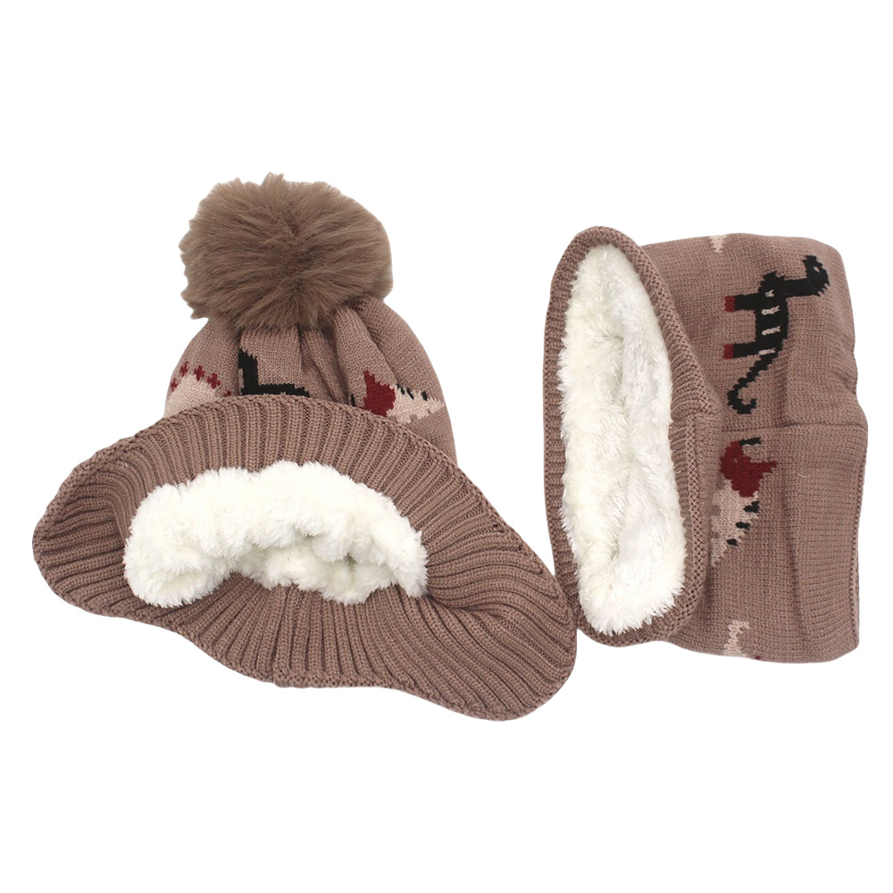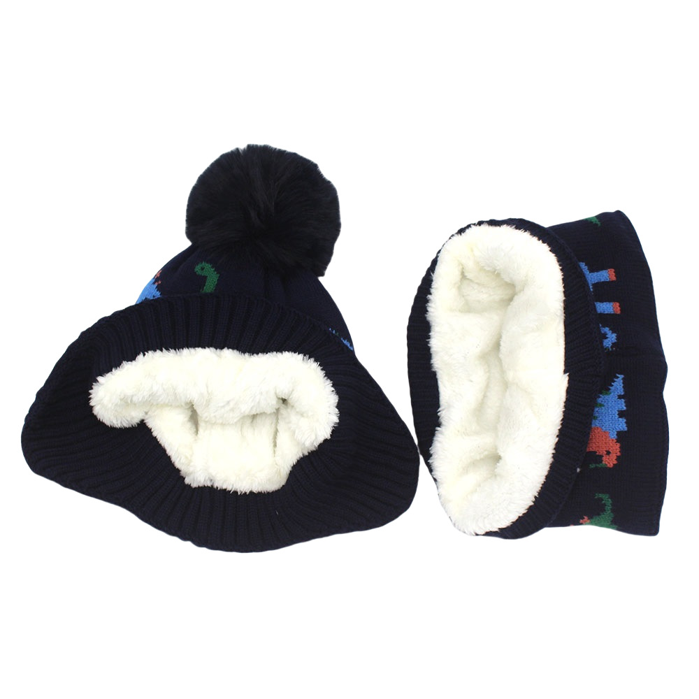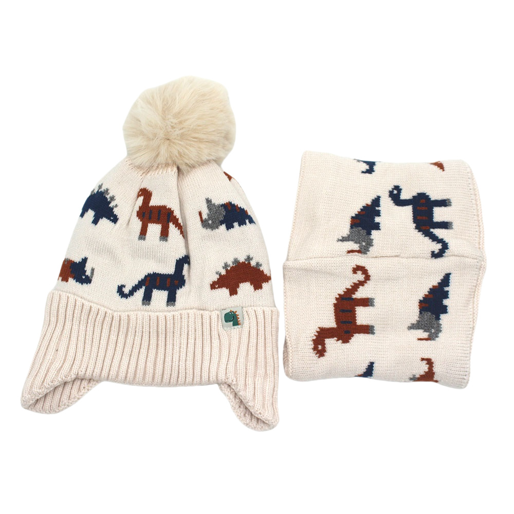 跨境热两件套卡通恐龙提花儿童针织帽帽子围脖加绒加厚护耳毛线帽
