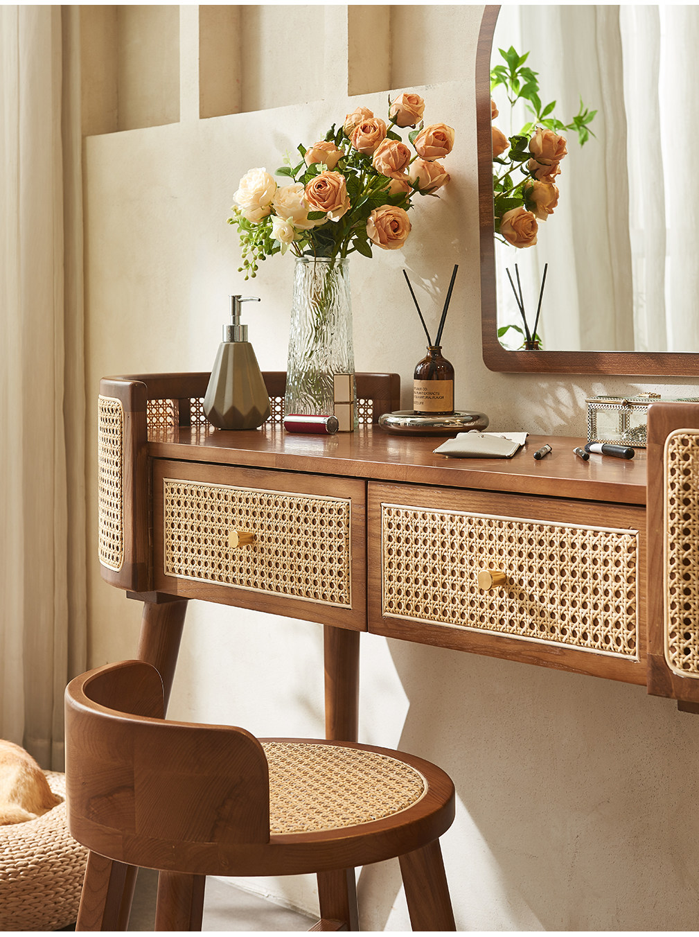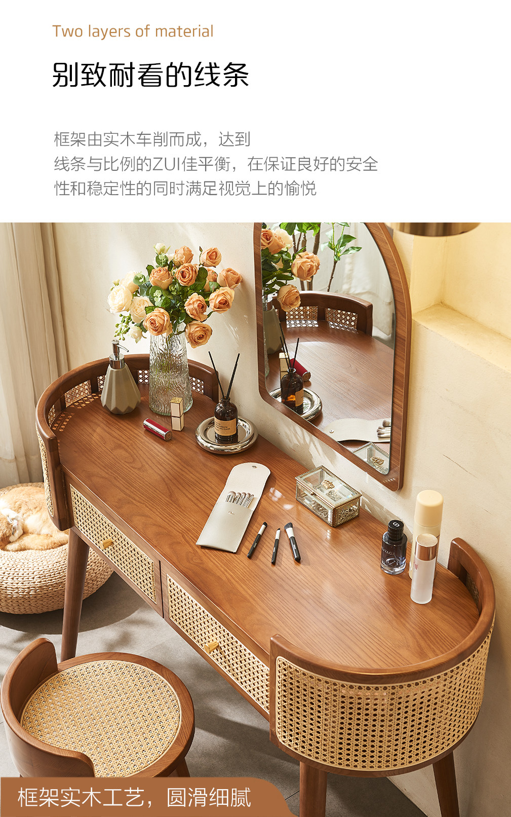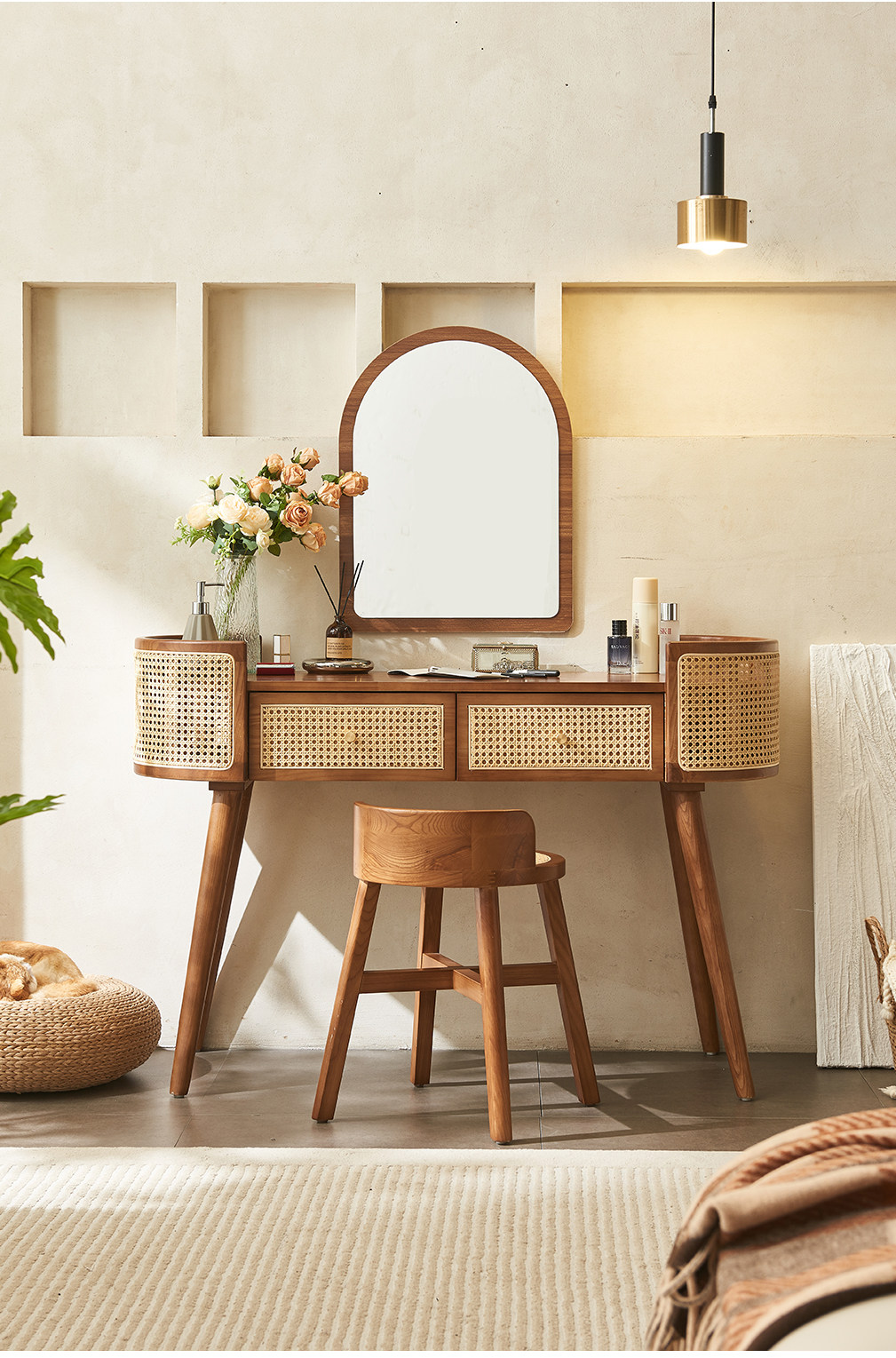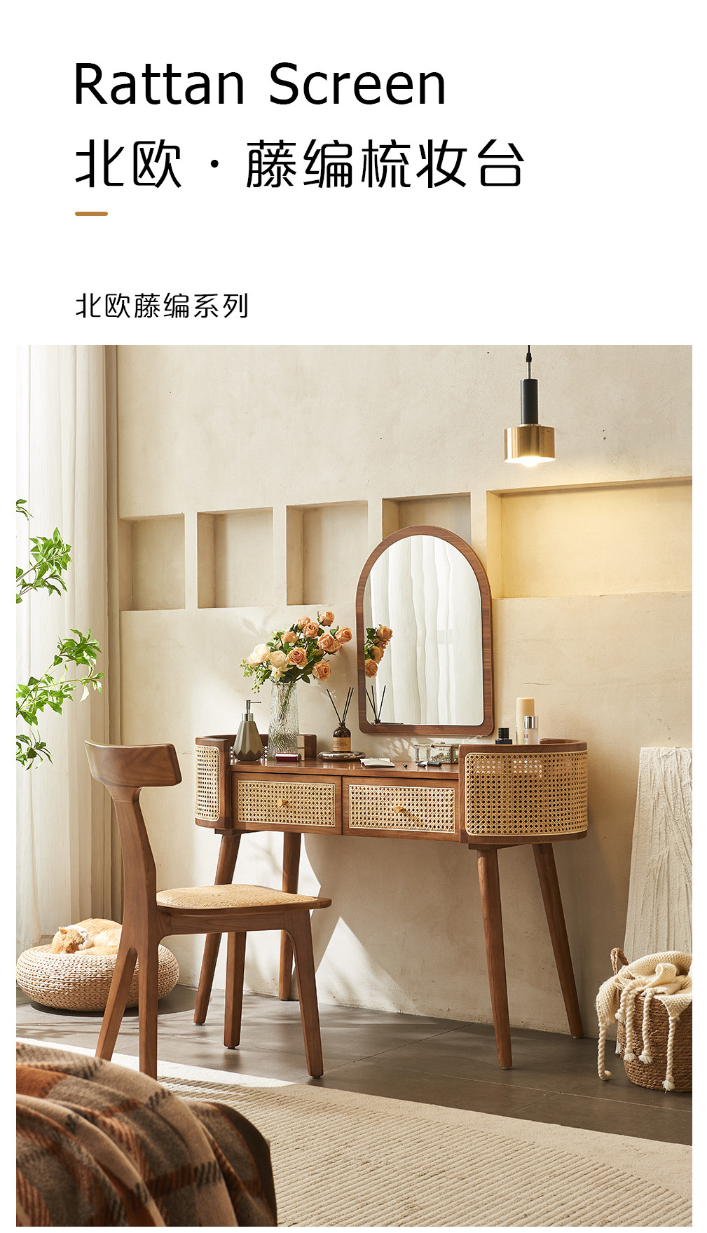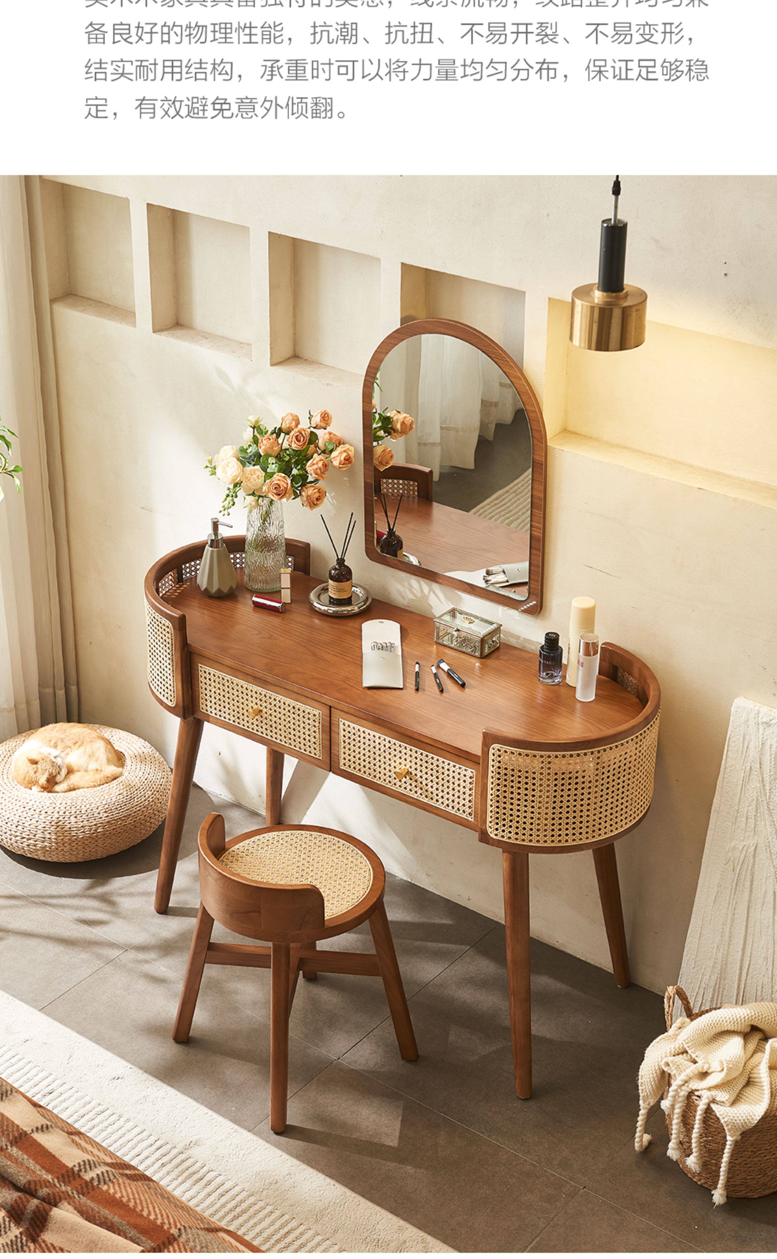 日式ins藤编梳妆台北欧设计师实木化妆桌卧室女现代简约小户型