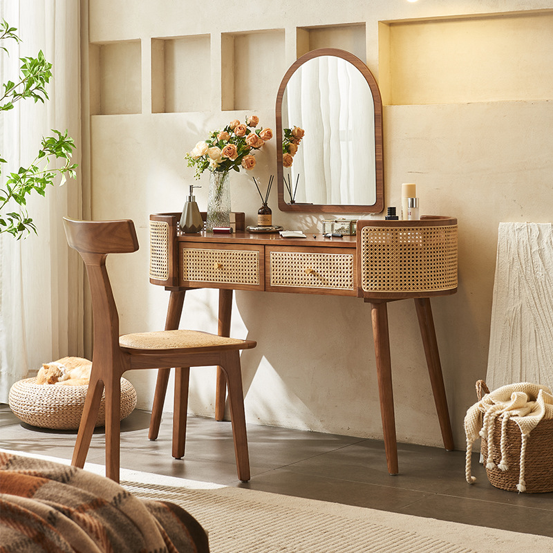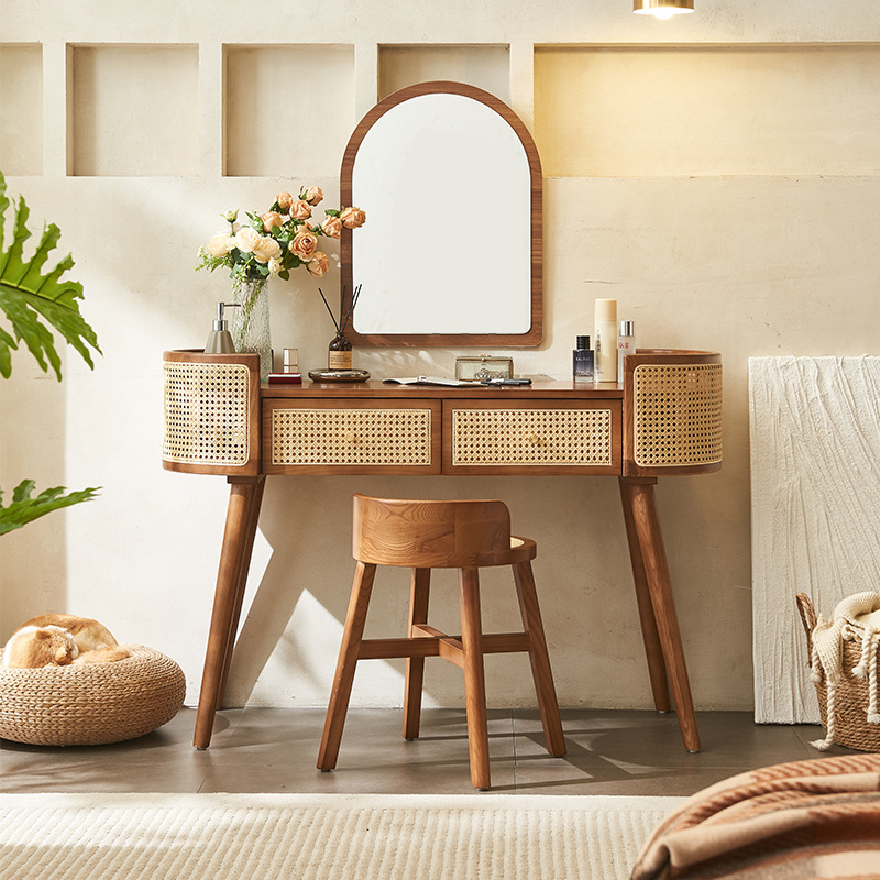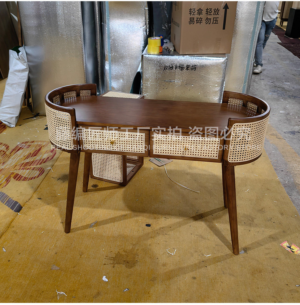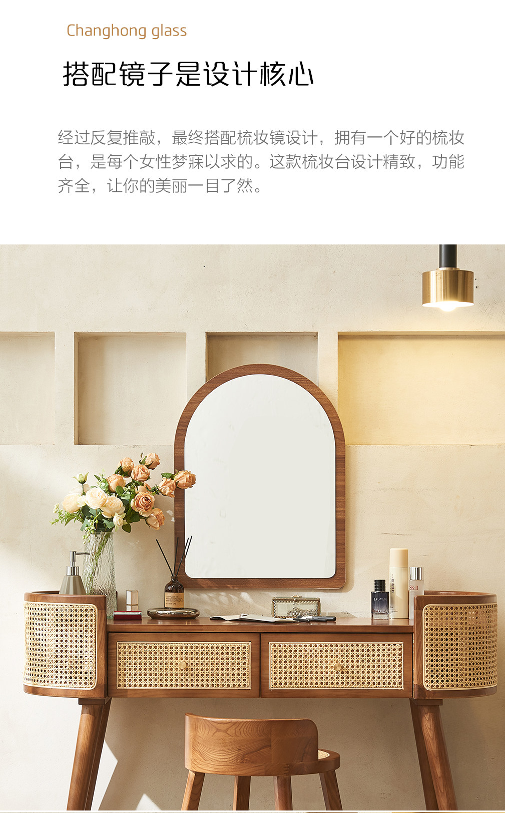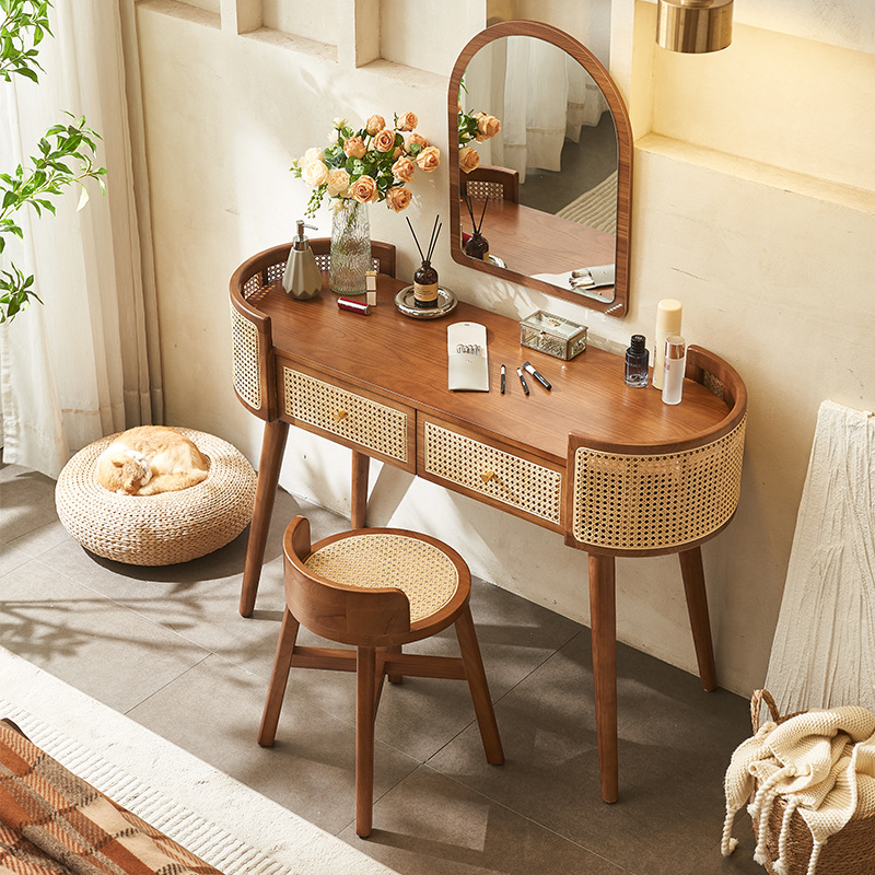 日式ins藤编梳妆台北欧设计师实木化妆桌卧室女现代简约小户型