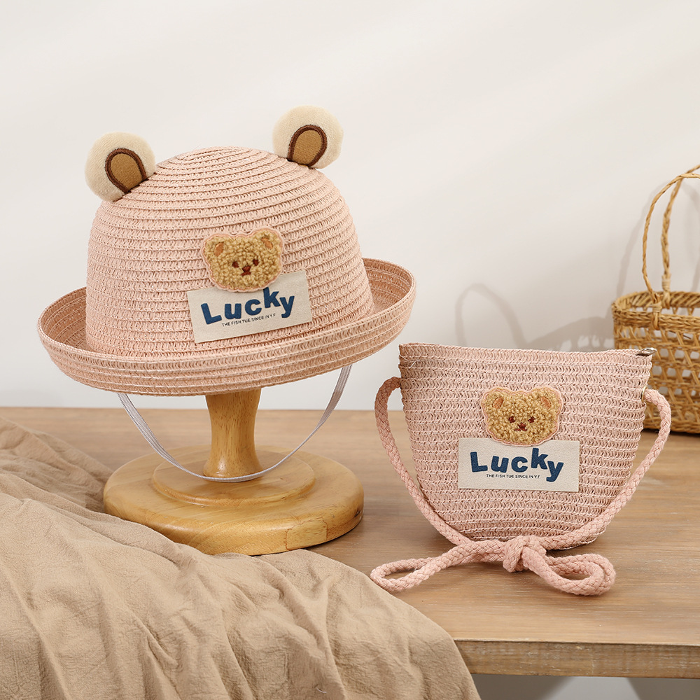 儿童遮阳帽卡通可爱鹿角熊宝宝草帽卷边帽子包包防晒太阳帽批发