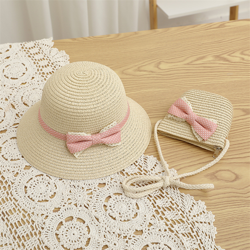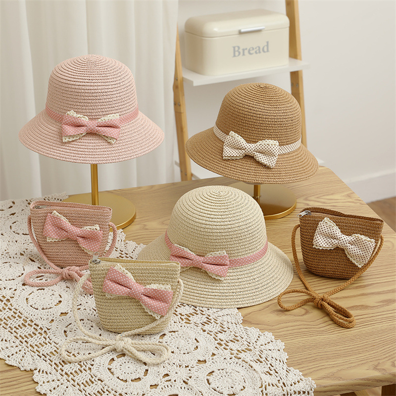 夏季新款2024儿童草帽波点蝴蝶结帽子包包套装淑女女童防晒遮阳帽
