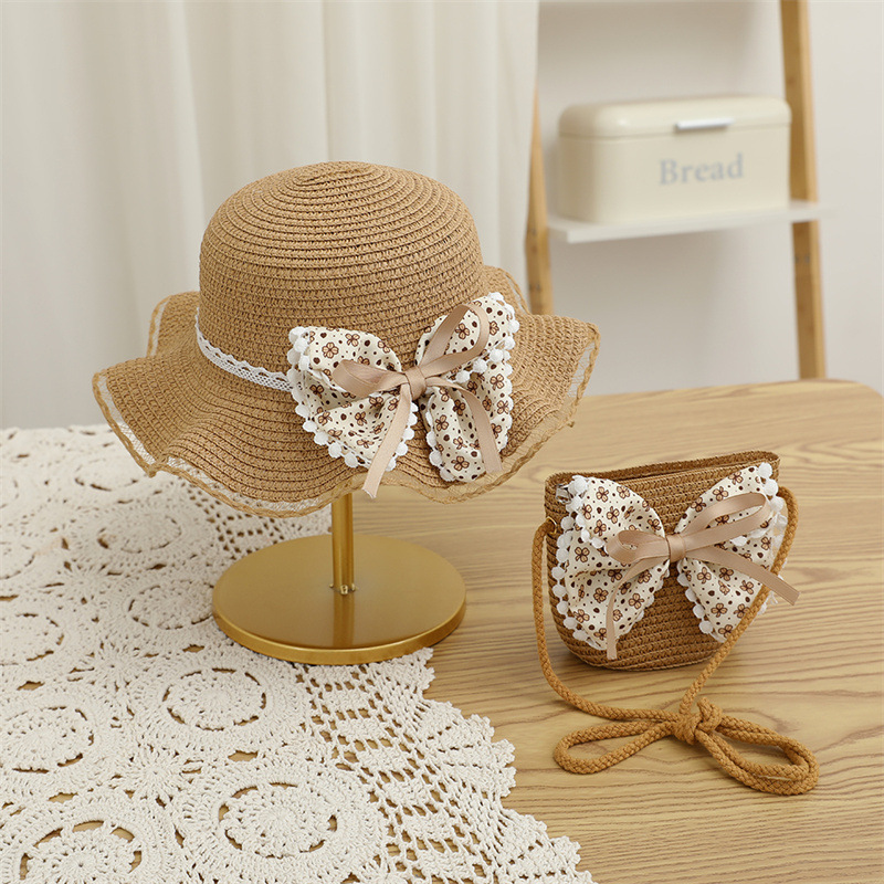 韩系儿童草帽淑女波点蝴蝶结夏季时尚防晒遮阳太阳帽子包包二件套