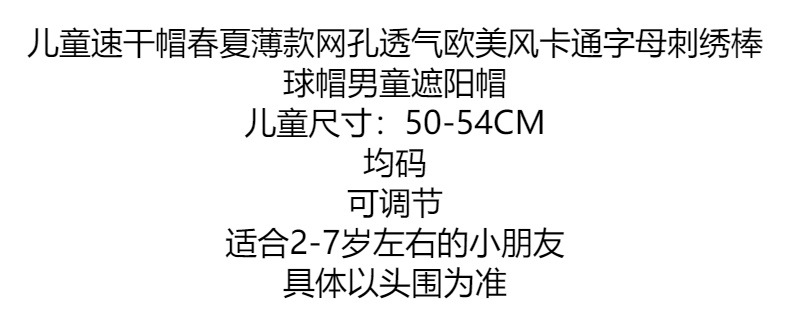 儿童速干帽春夏薄款网孔透气欧美风卡通字母刺绣棒球帽男童遮阳帽