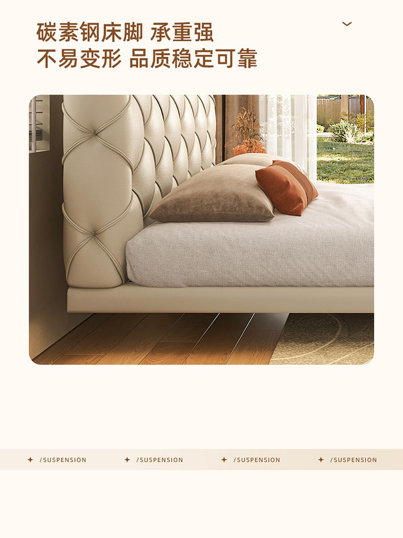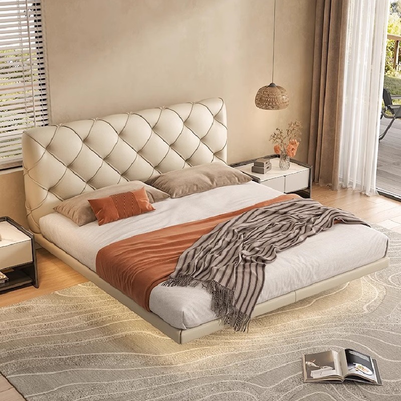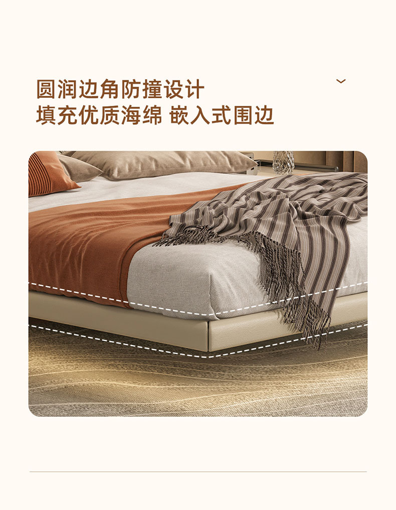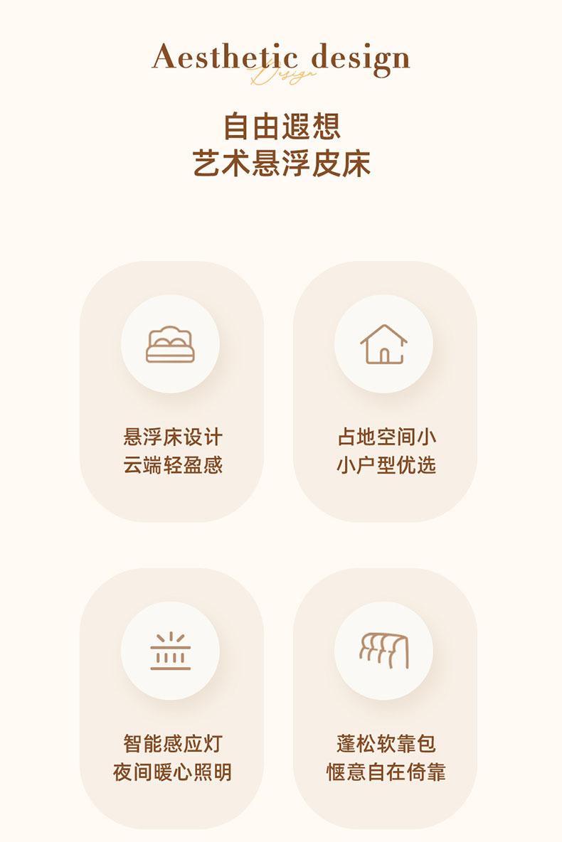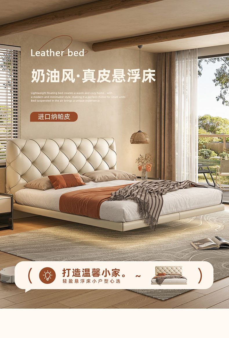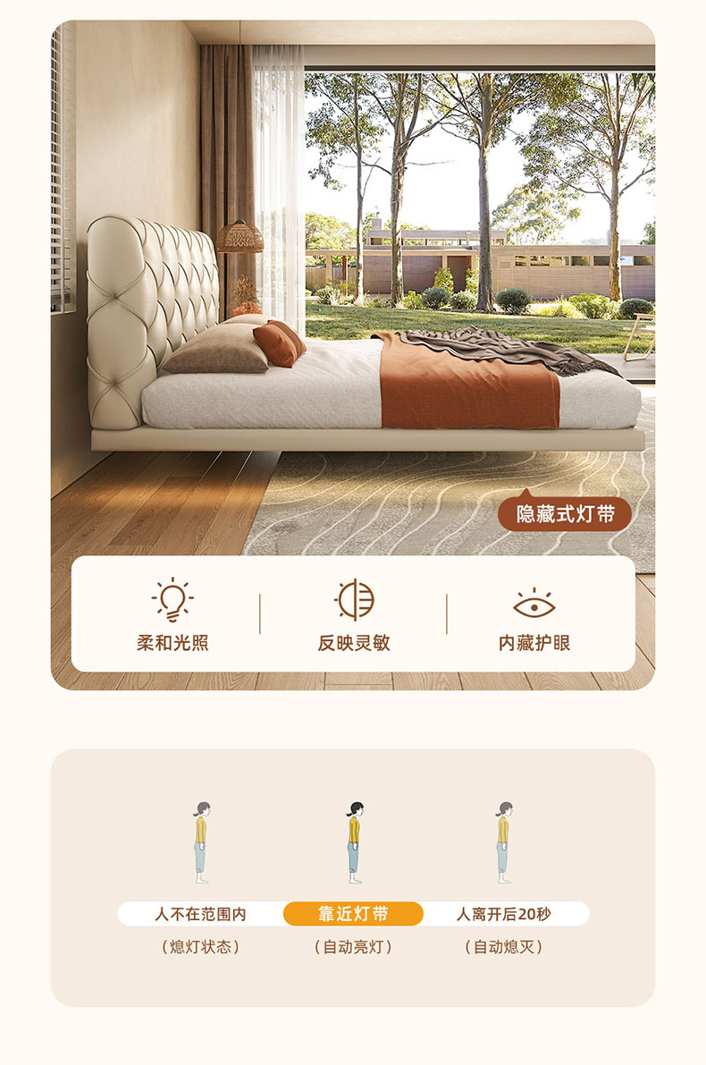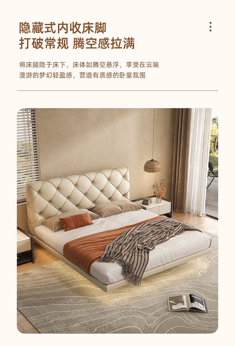 悬浮床拉扣月球表面真皮床悬空灯带感应灯卧室主卧双人皮床齐边床