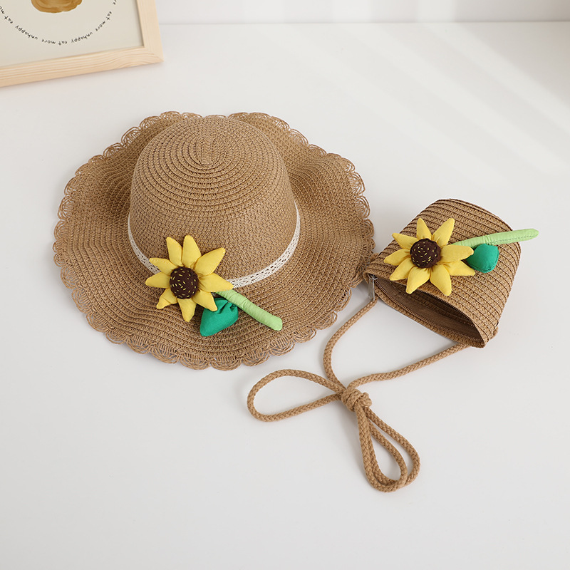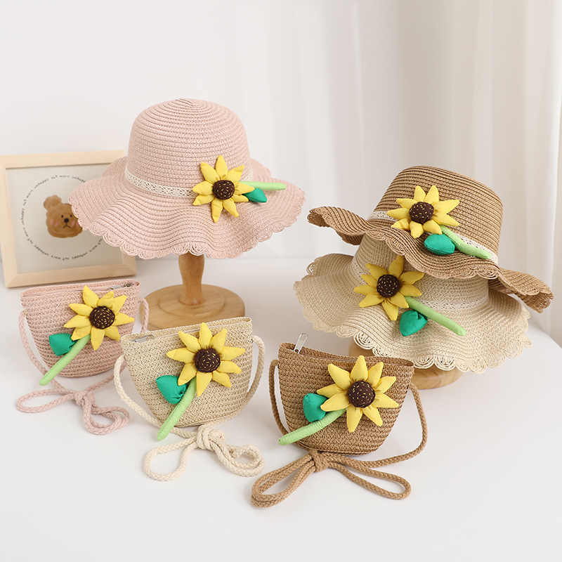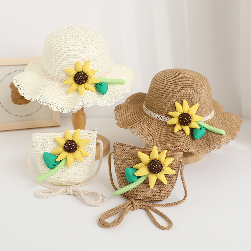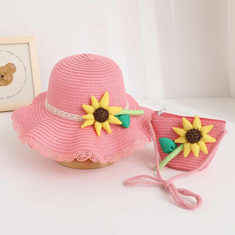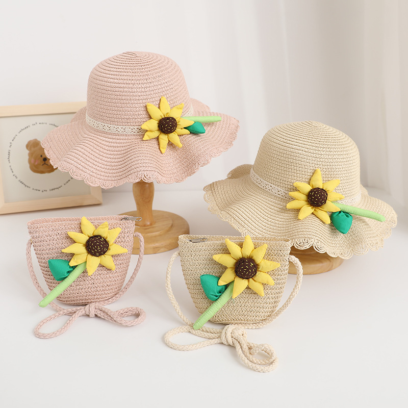 新款儿童遮阳帽女童春夏可爱花朵公主草帽+包包套装防晒大檐太阳