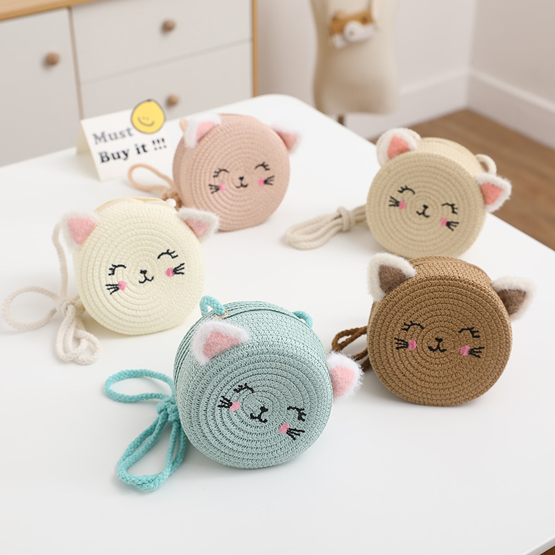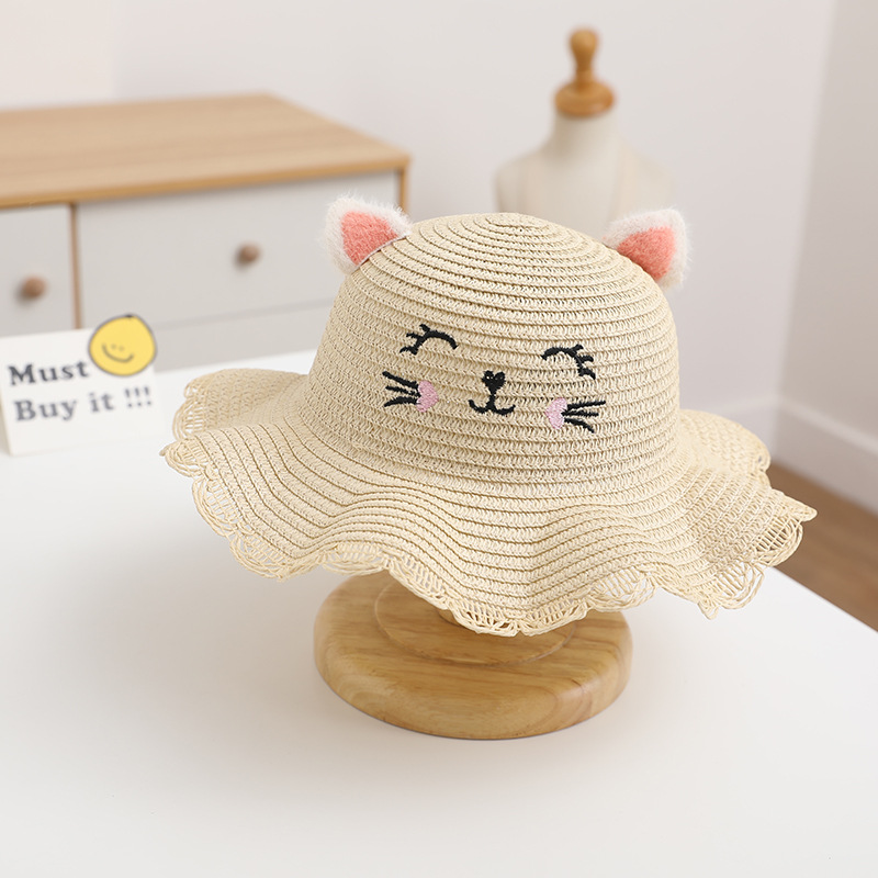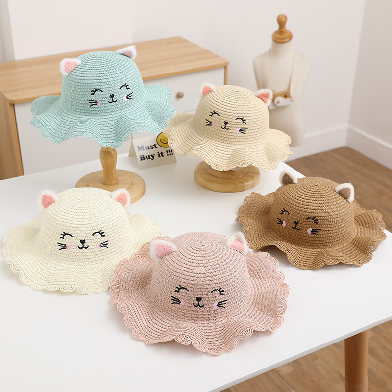 夏季儿童防晒帽宝宝草帽包包套装女童可爱卡通猫咪大檐遮阳太阳帽