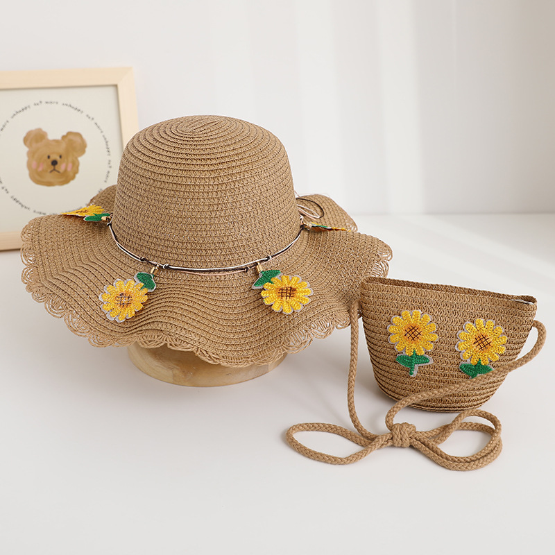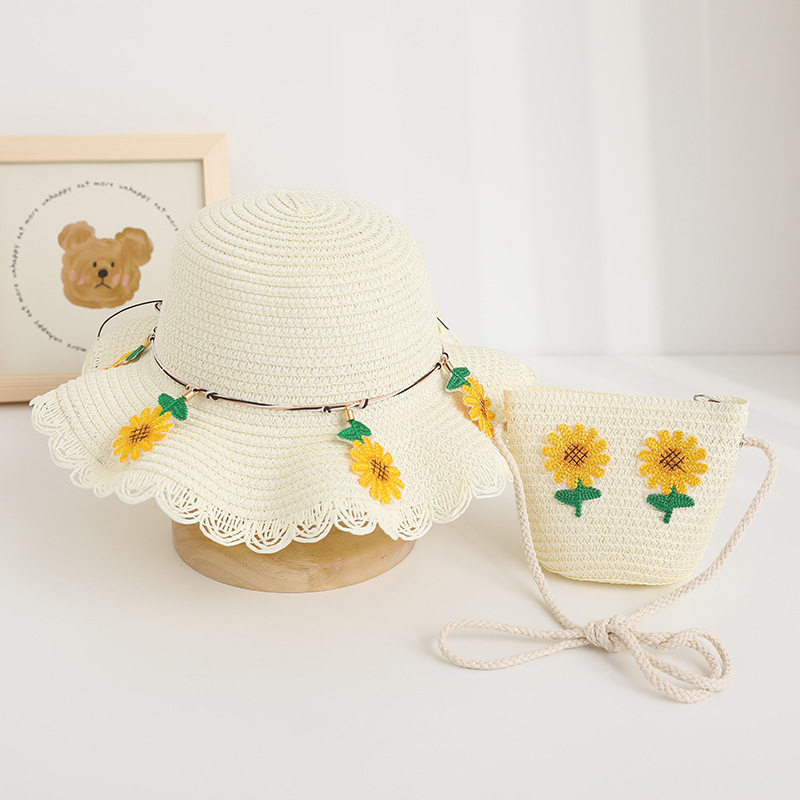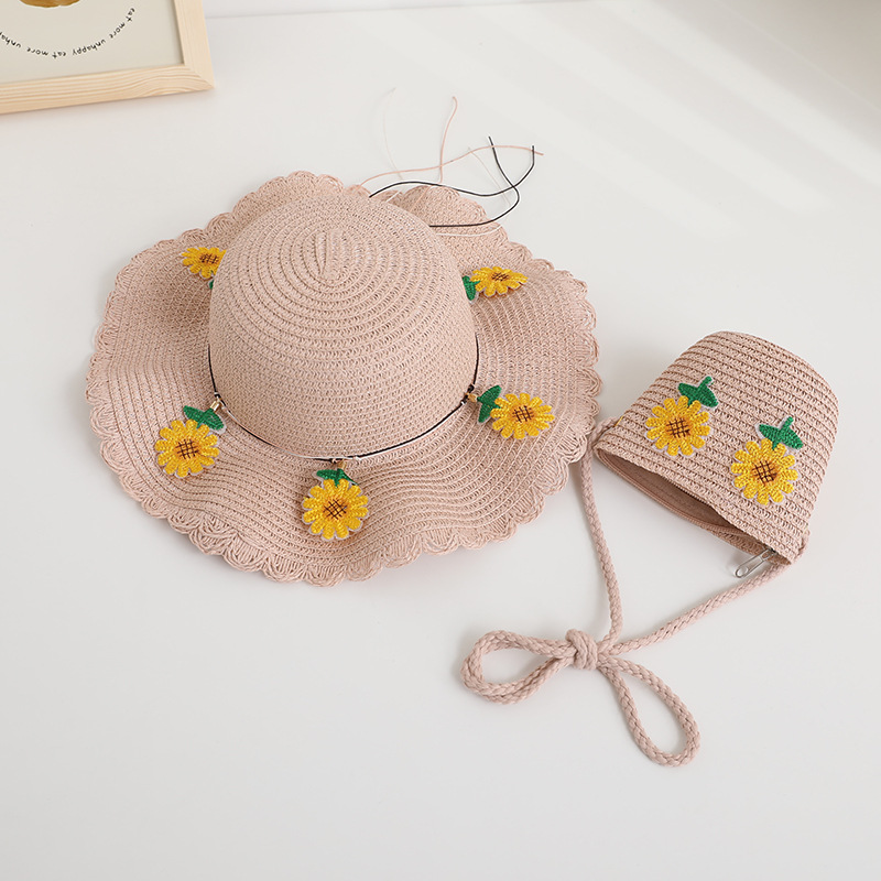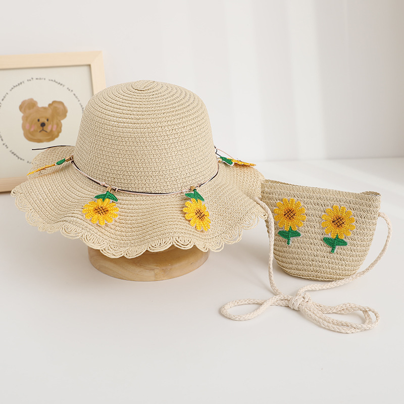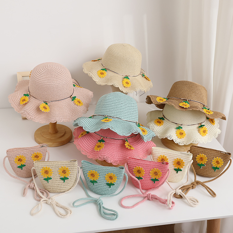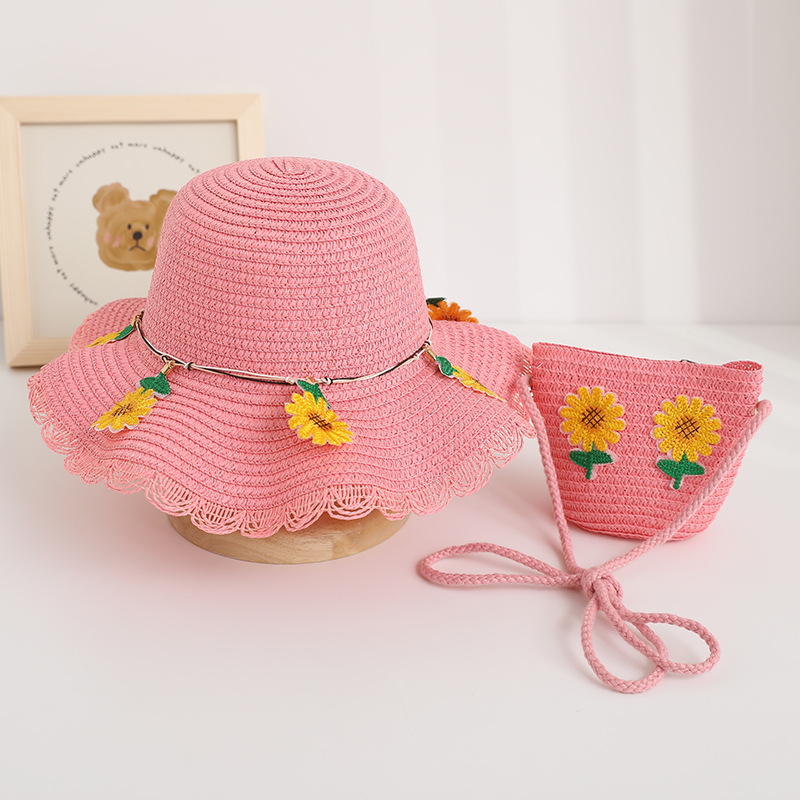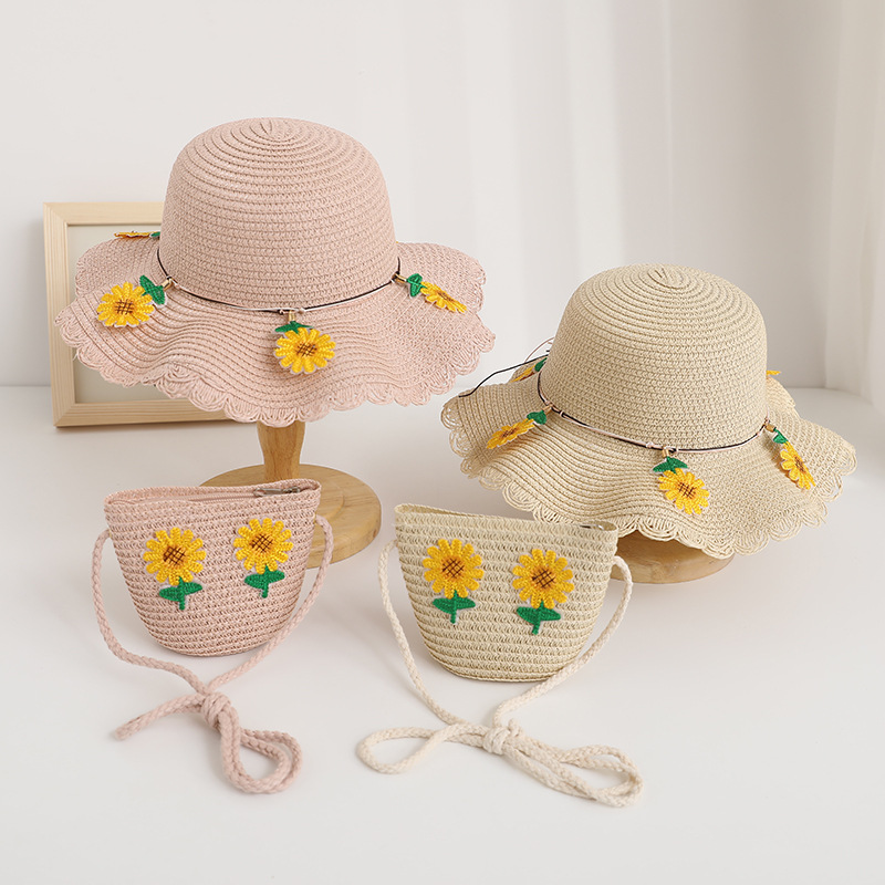 儿童遮阳帽子夏季女童出游草帽包包套装防晒沙滩帽宝宝太阳渔夫帽