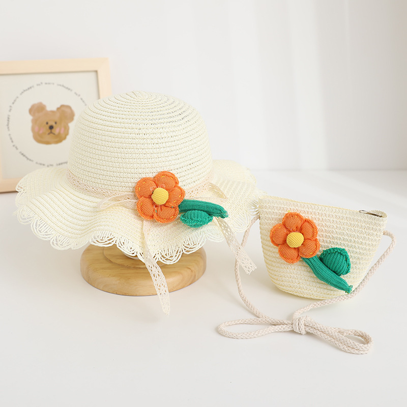 儿童渔夫帽女童夏季透气花朵草帽遮阳凉帽女宝宝公主防晒帽加包包