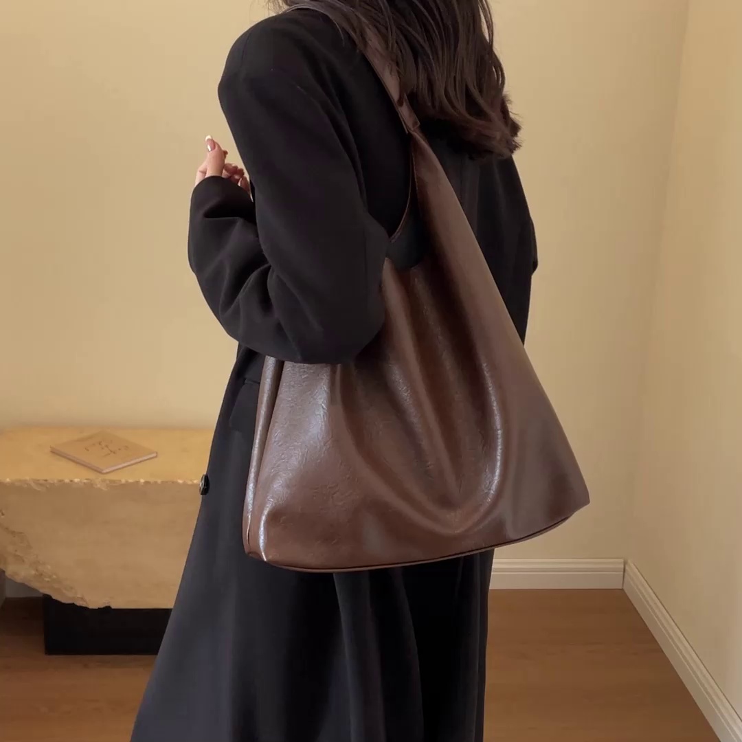 复古纯色PU质感百搭手提包大容量女士通勤休闲简约托特包6941