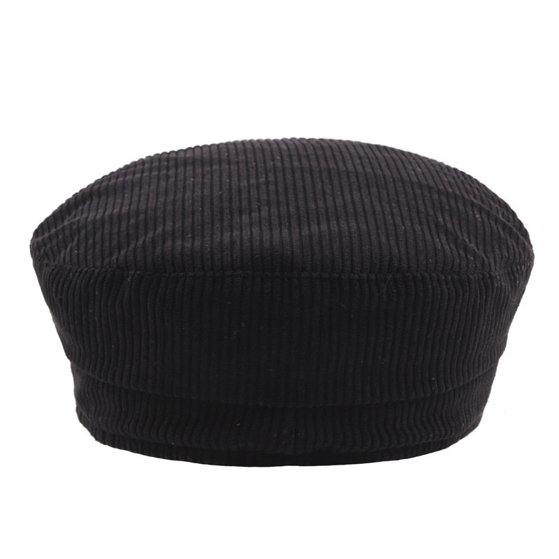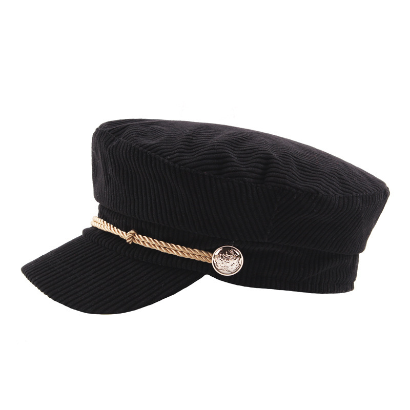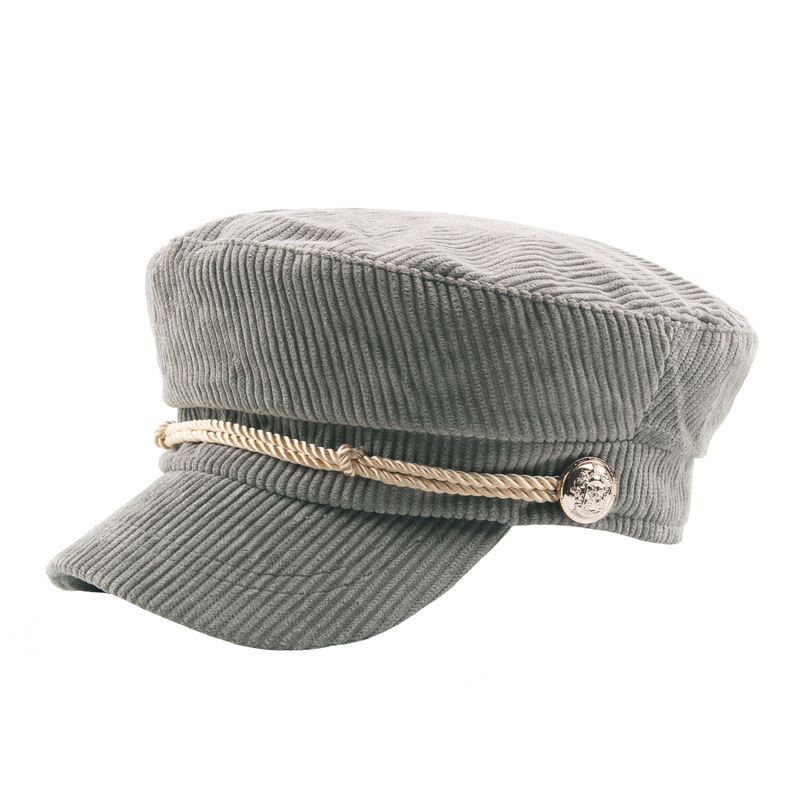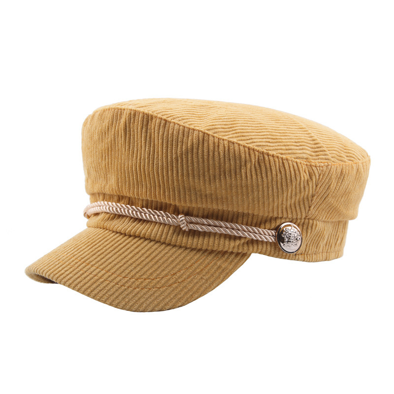 韩版灯芯绒条纹平顶帽秋冬季纯色简约海军帽学生帽绳子装饰
