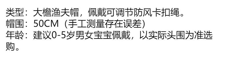 | cap circumference 50cm (recommended for 0-5 years old)(帽围50CM(建议0-5岁)) | USD $0.0 | 999999 piece available |