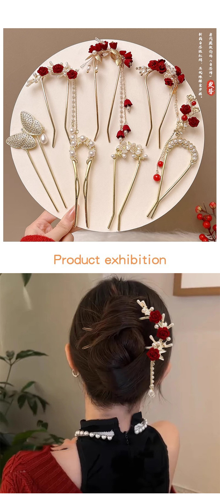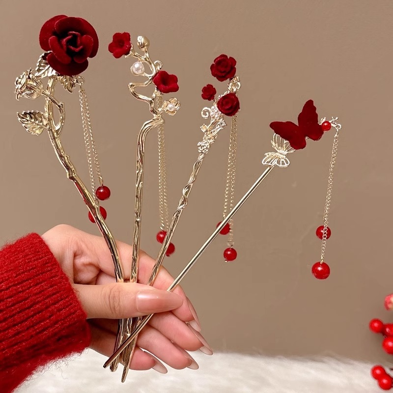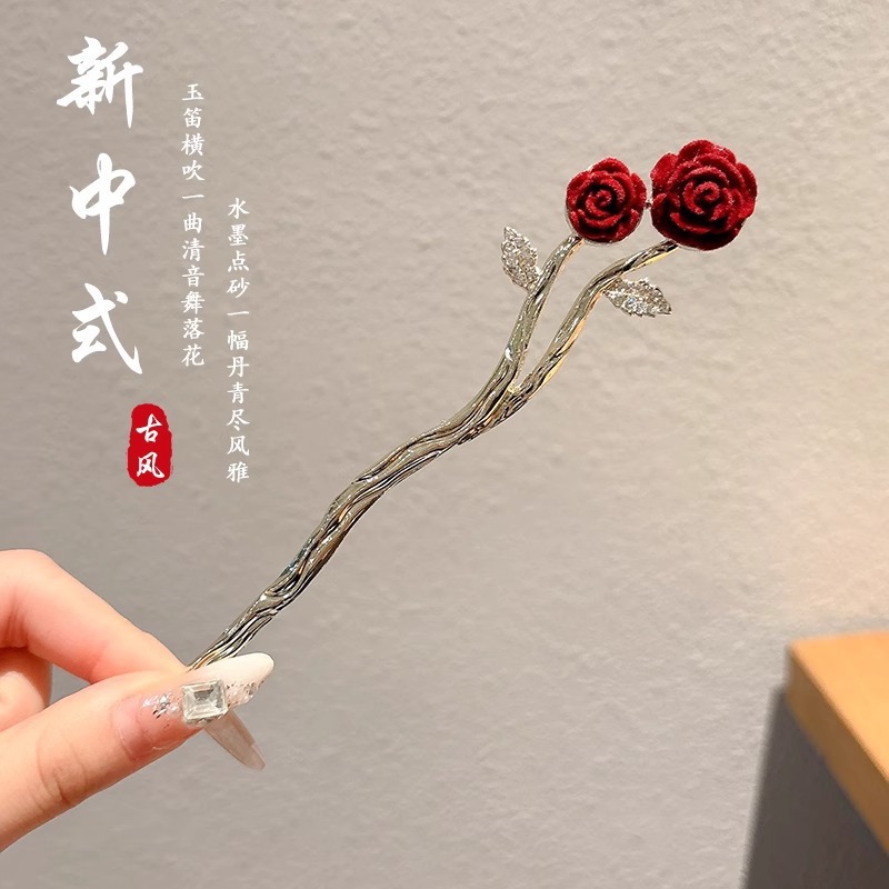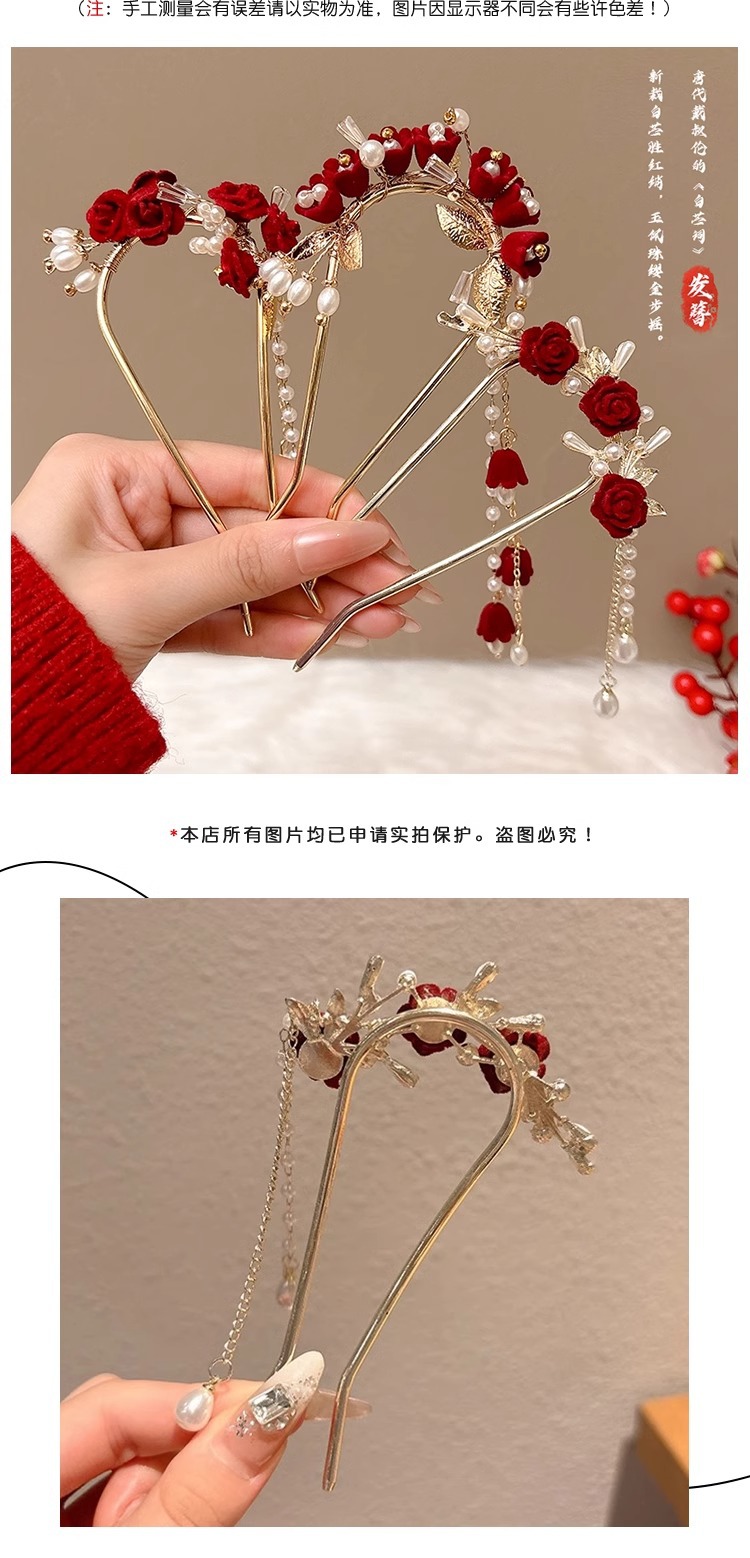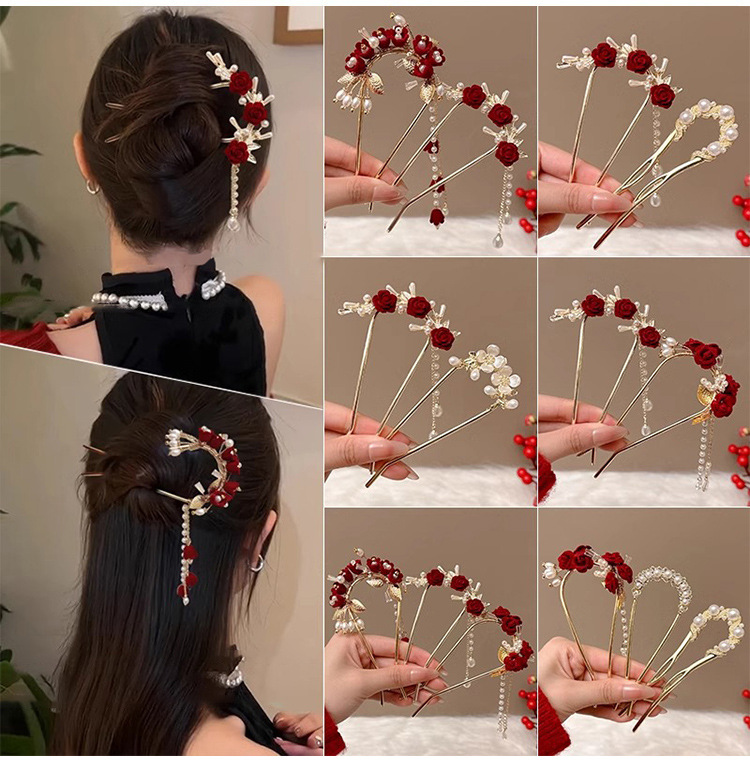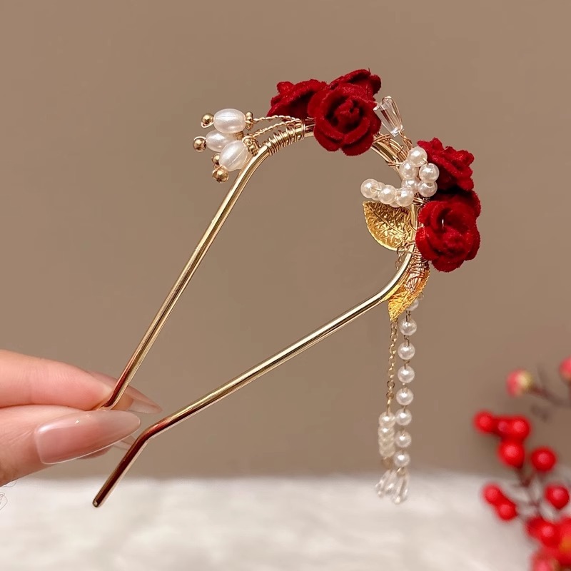 新中式红色玫瑰花u型发簪子女后脑勺盘发神器丸子头发钗新娘头饰