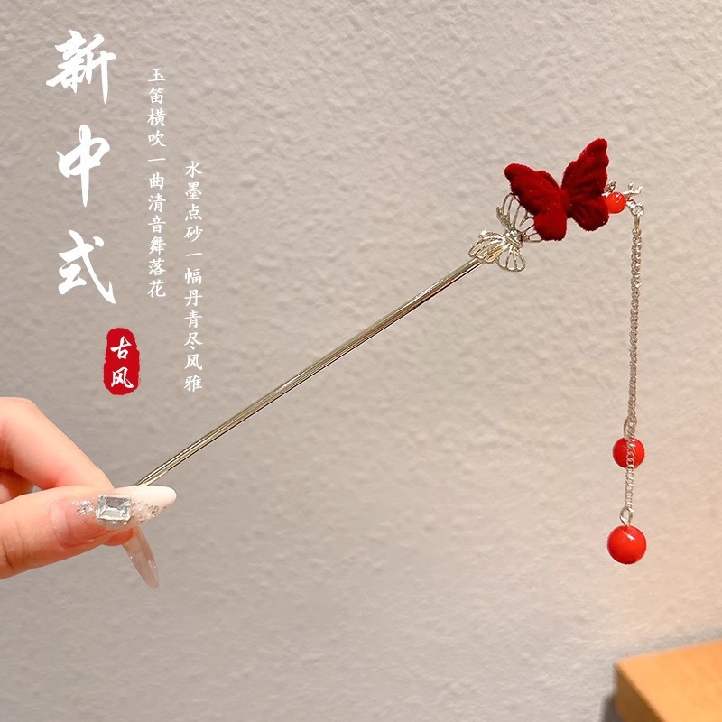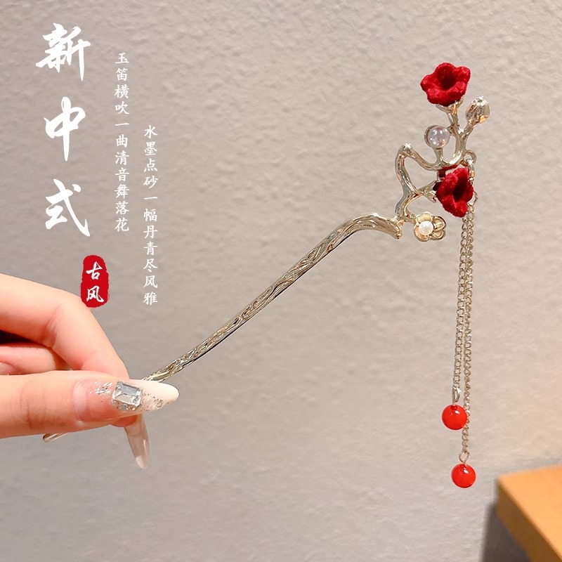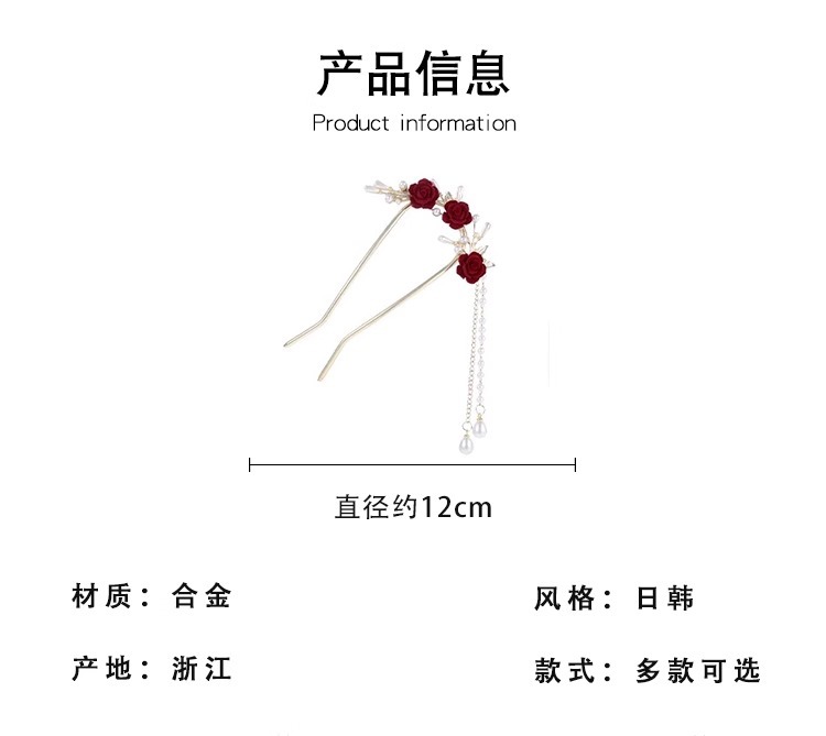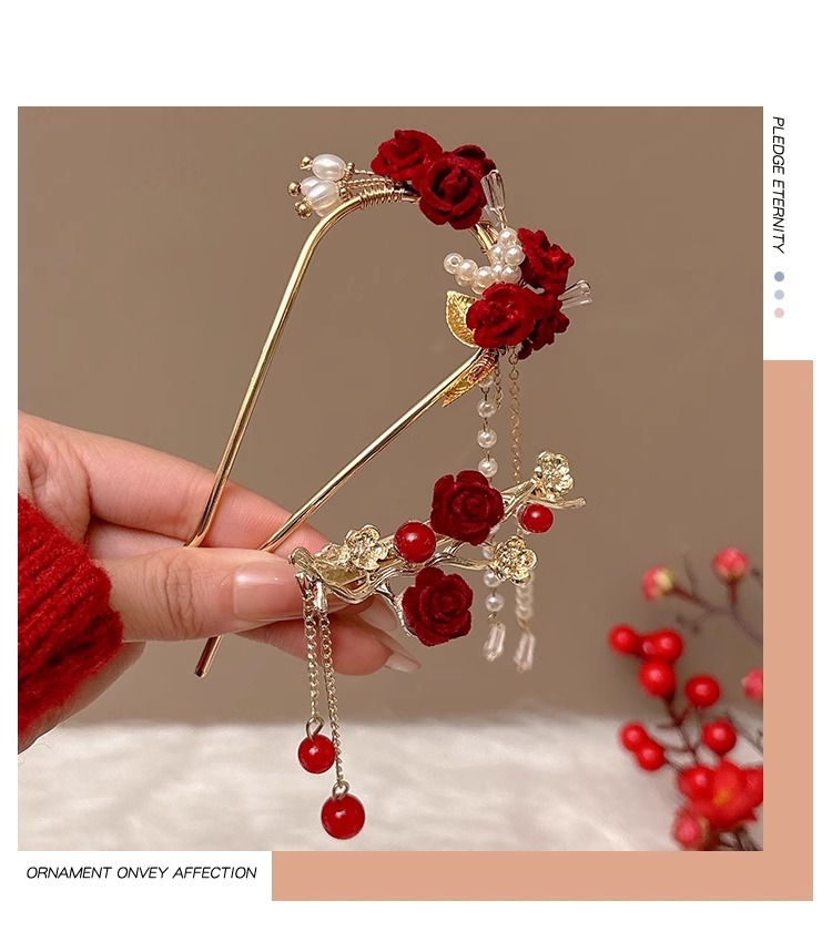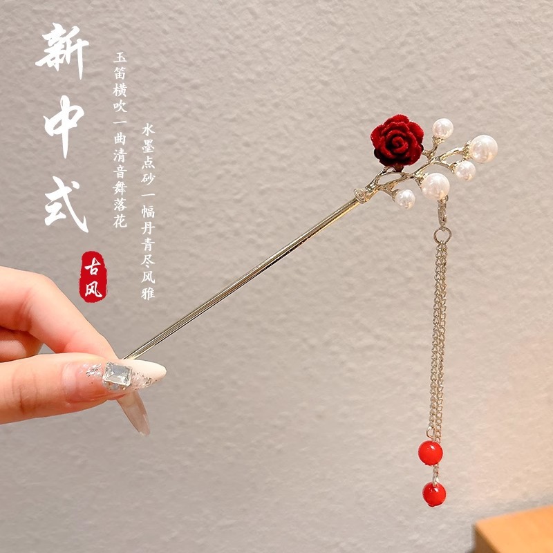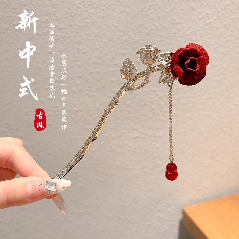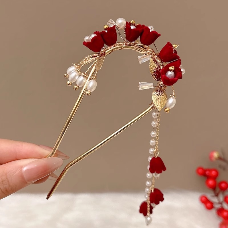 新中式红色玫瑰花u型发簪子女后脑勺盘发神器丸子头发钗新娘头饰