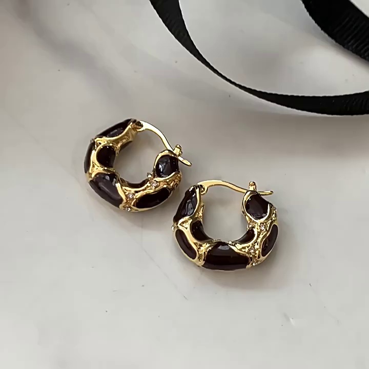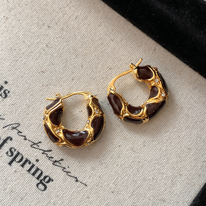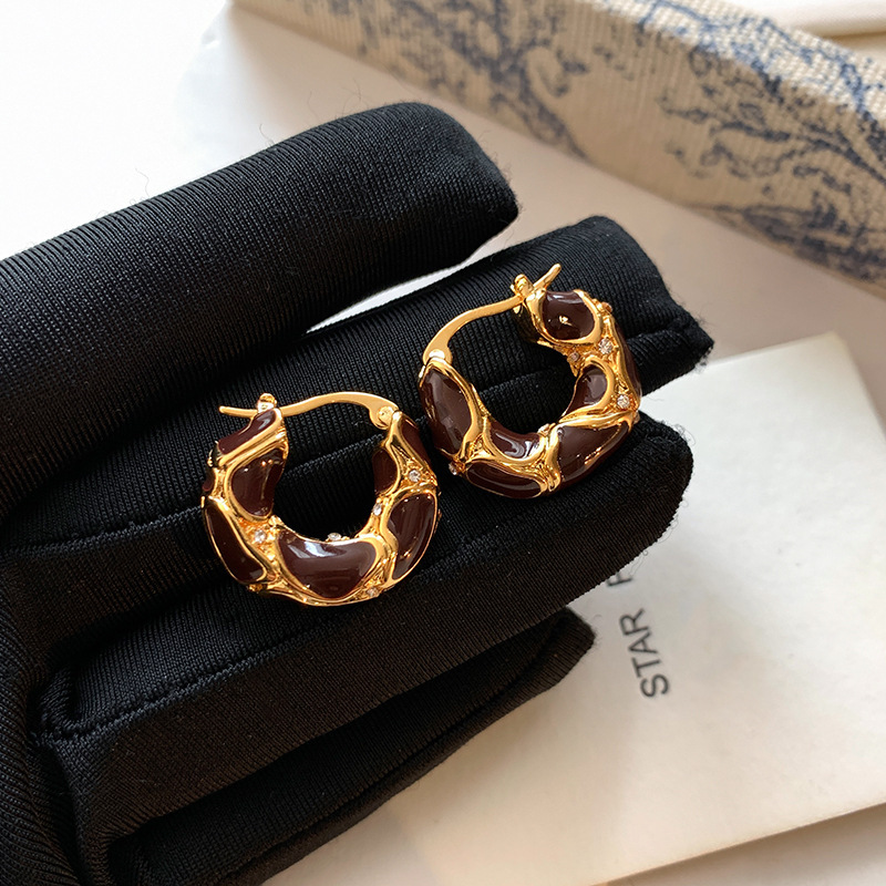 轻奢小众高级感耳钉真金电镀复古美拉德酒红色珐琅出C形耳环女