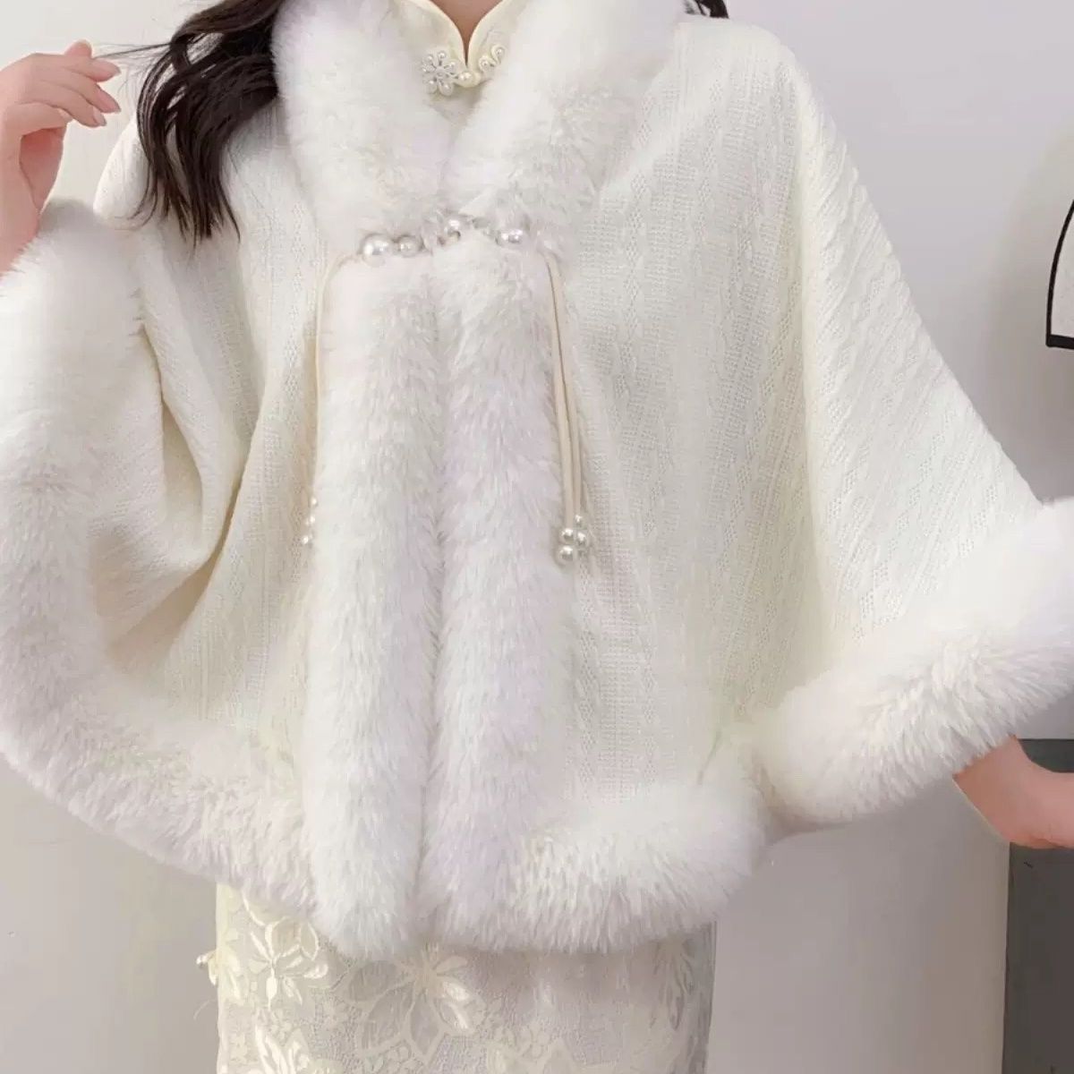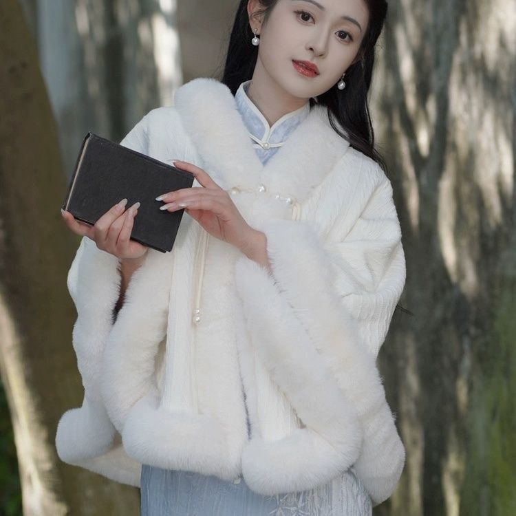 民国加绒加厚新款斗篷2024披肩旗袍气质高端秋冬保暖外套毛绒